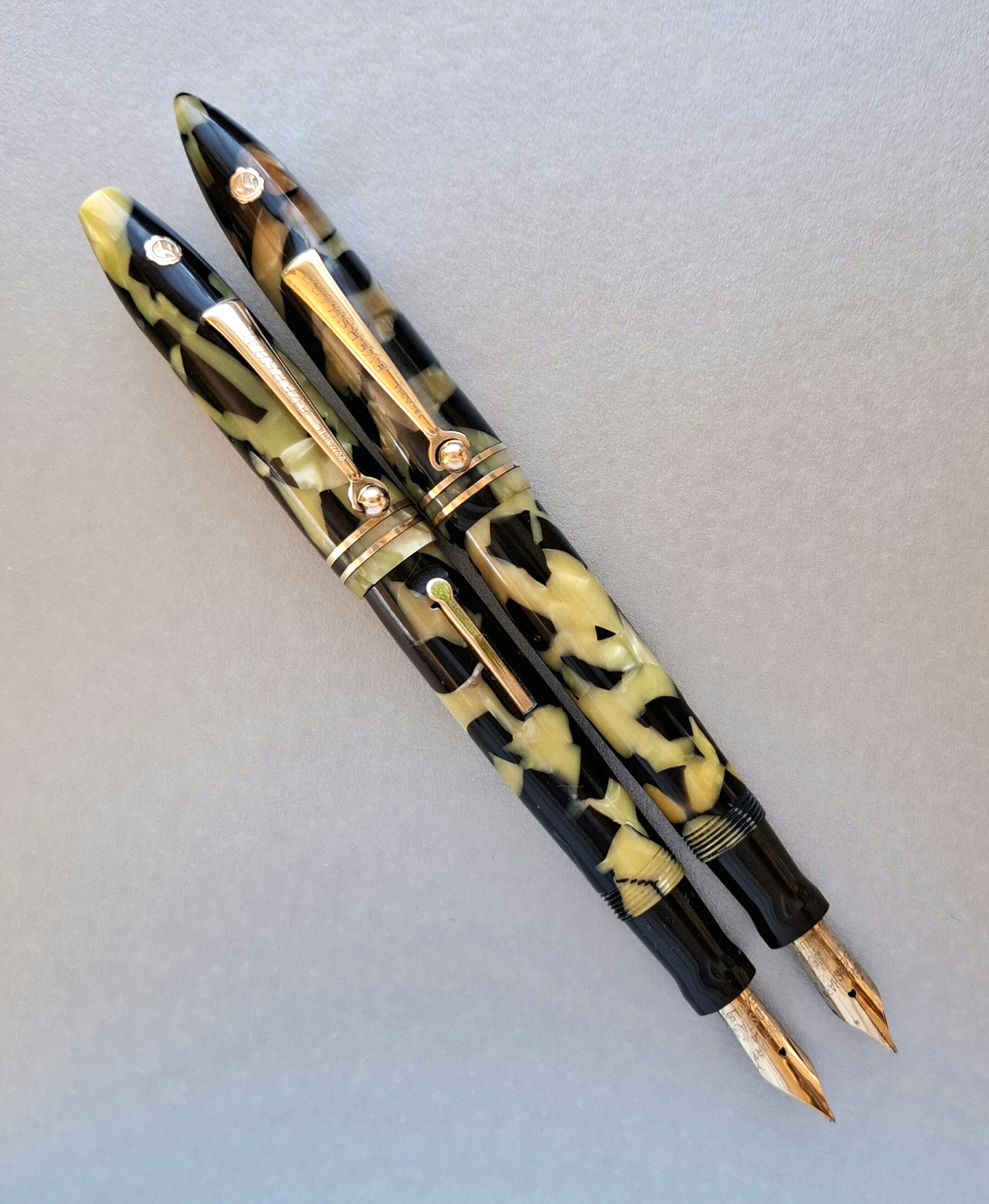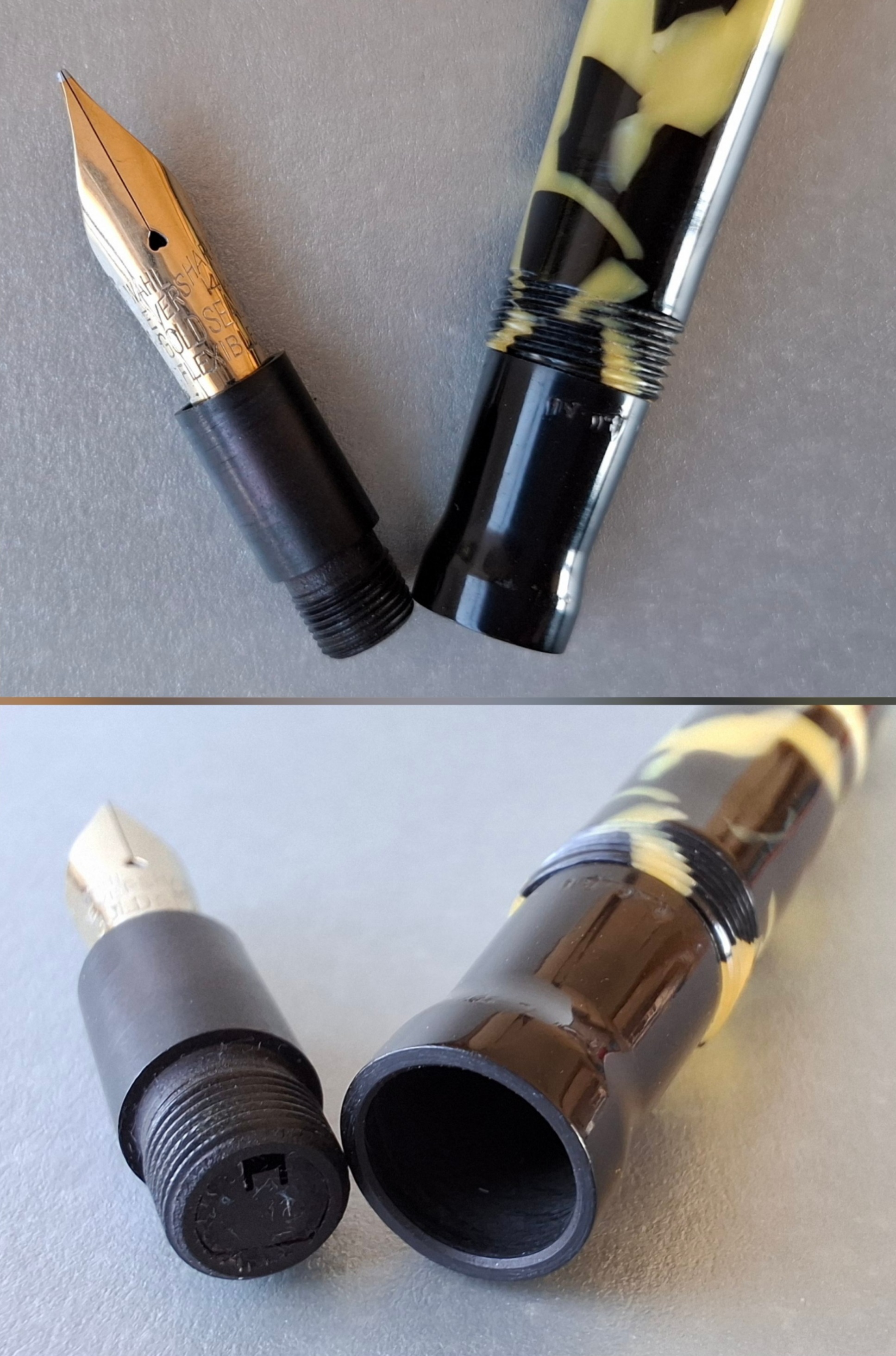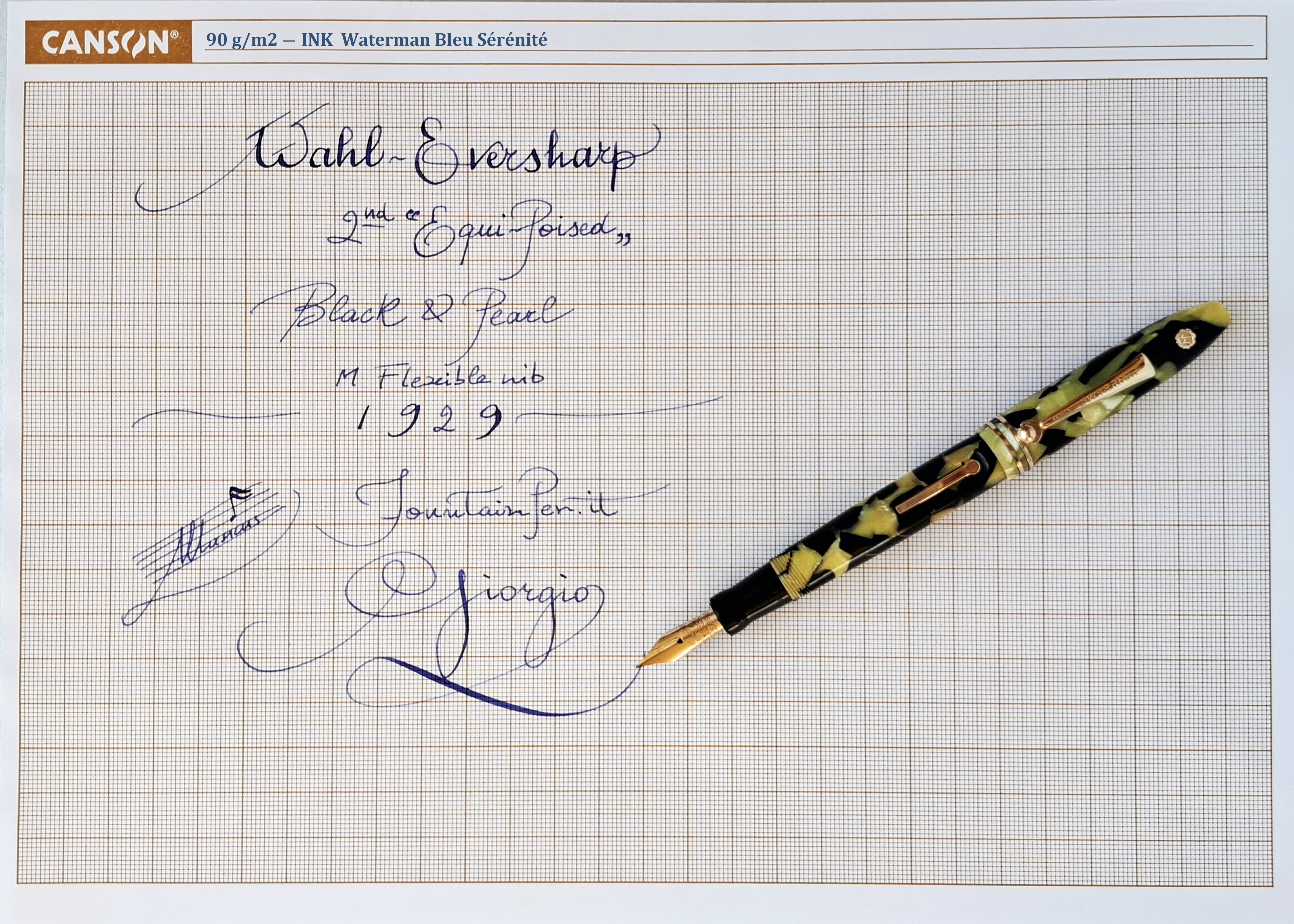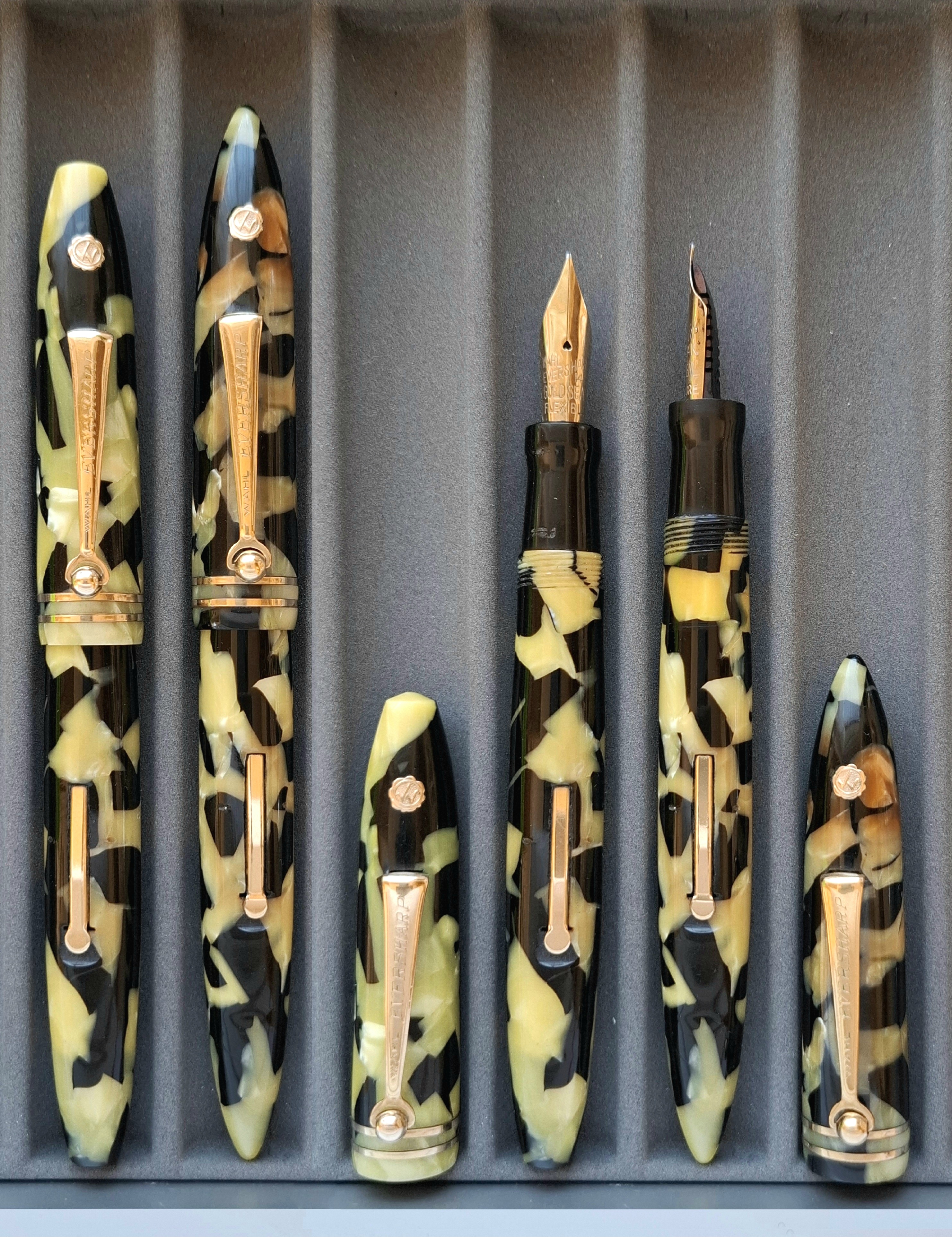 La penna WAHL-EVERSHARP PERSONAL-POINT EQUI-POISED GOLD SEAL misura unica con CLIP nel colore BLACK AND PEARL seconda versione*, in celluloide tornita dal pieno, parti metalliche a vista laminate oro, con cappuccio a vite, corretto pennino intercambiabile Wahl-Eversharp “Flexible” in oro 14 carati, caricamento a levetta. Produzione U.S.A., anno 1929.