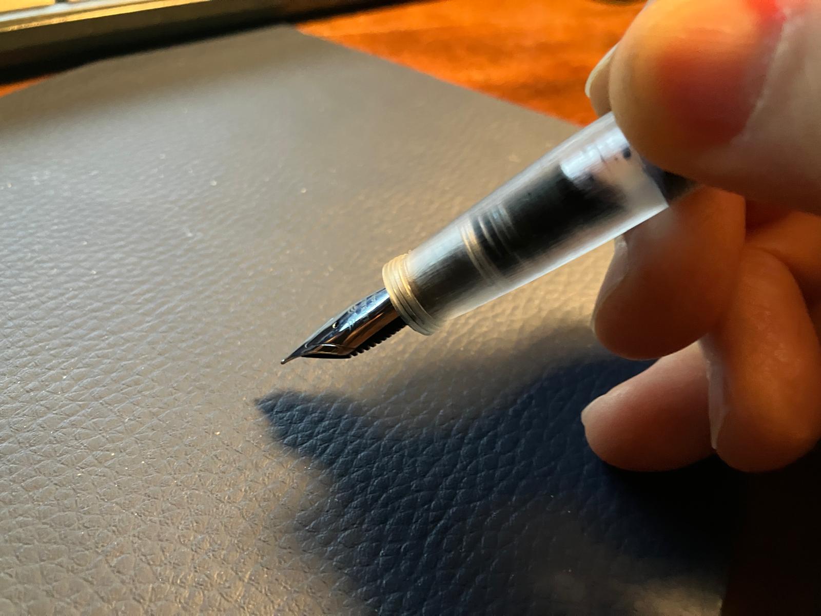 Interessante, dato che la penna è trasparente, notare che seppure con poco inchiostro, siamo lontanissimi dalla situazione in cui il canale aria-inchiostro di una eyedropper "vera" potrebbe risultare scoperto (non possibile qui perché si tratta di una penna a converter, e quindi c'è il peduncolo - ma solo "per vedere l'effetto che fa"