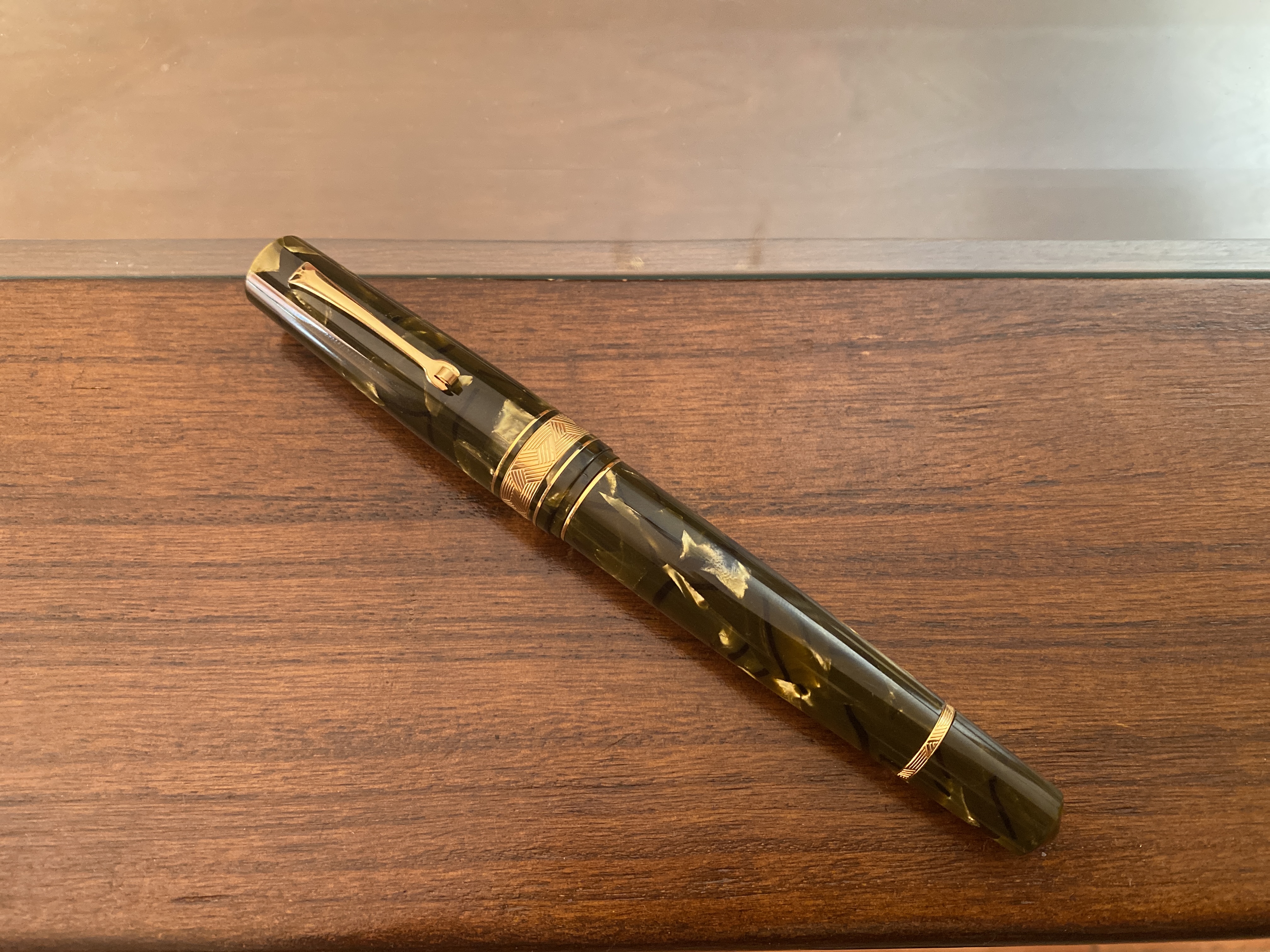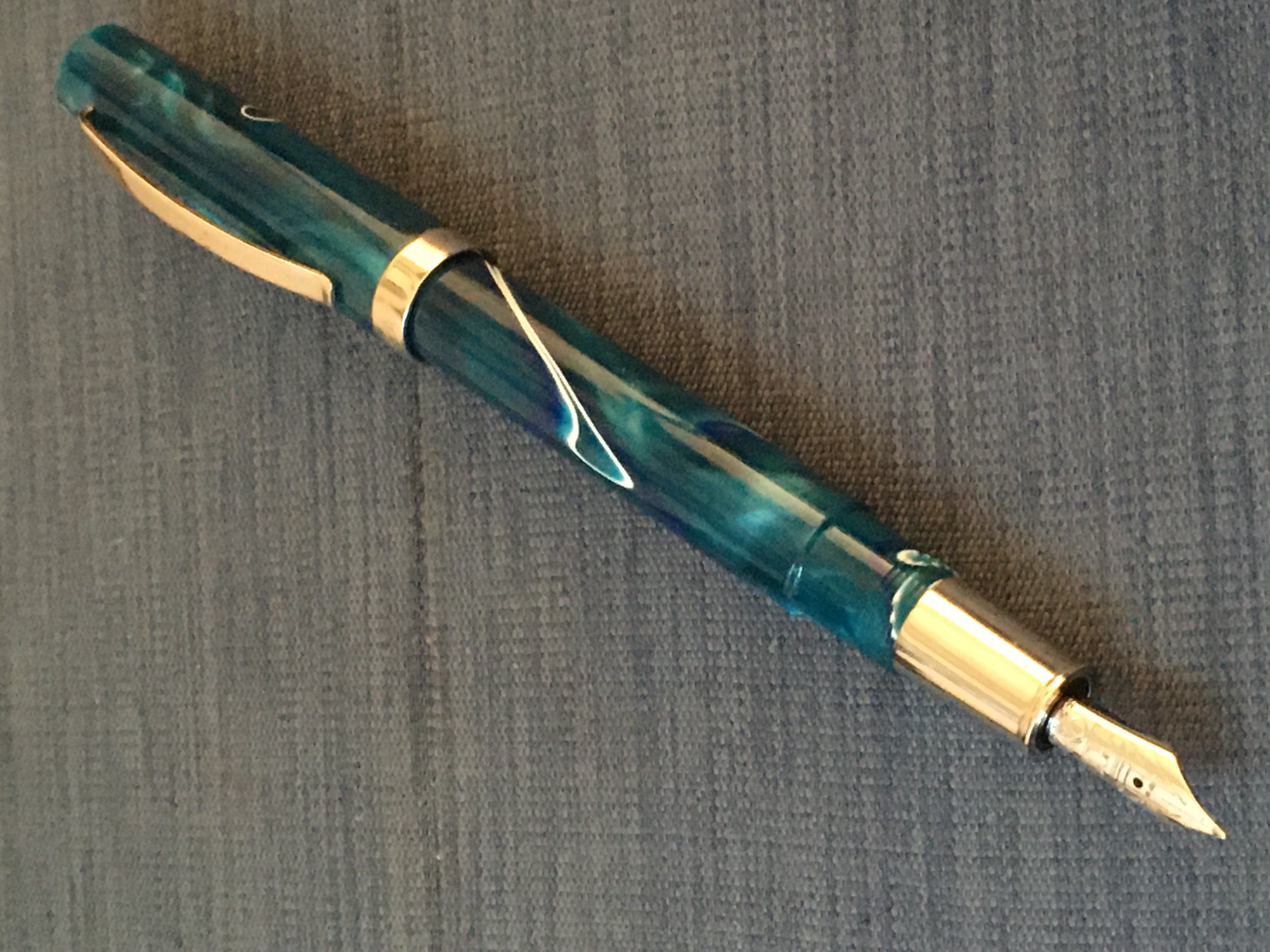 Questa è la mia prima penna in acrilico. Quando Omas ha chiuso le barre di acrilato sono state acquistate da varie aziende. Ho visto questo materiale usato da Leonardo in un Momento Zero Grande e dal Turners workshop. Potrebbero essercene altri. L'ho riempita con inchiostro Parker Penman Sapphire.