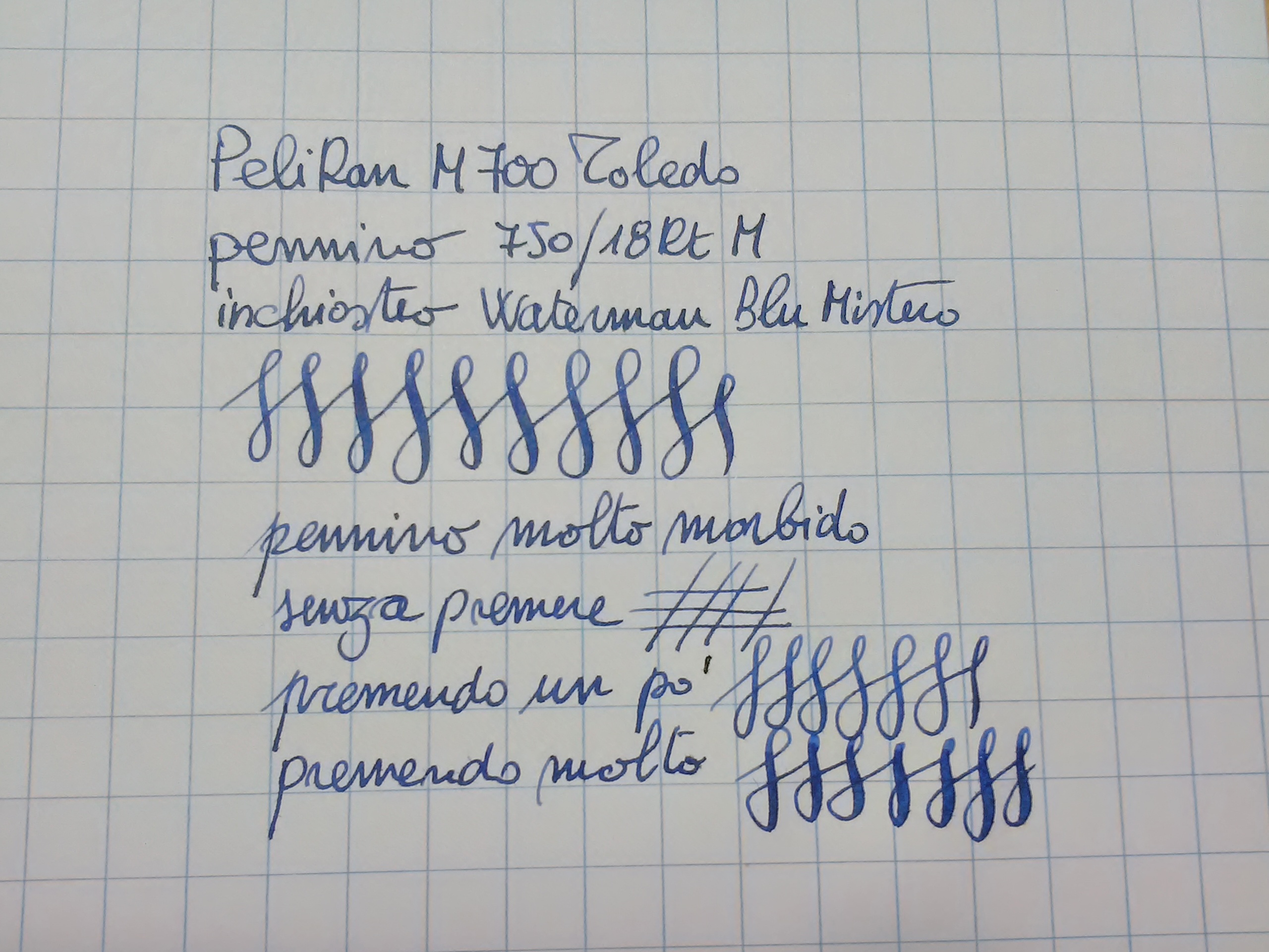 Questa penna di produzione ante 90 era ferma da più di 30 anni e stasera l'ho caricata con un Waterman Blu Mistero, prima però ho dovuto lubrificare un po' lo stantuffo perché era quasi grippato. Questo fatto mi convince sempre di più che le penne bisogna usarle e che se tenute ferme nelle scatole possono avere dei problemi. Il pennino è un bel 750 gradazione M molto morbido come si può vedere qui sotto