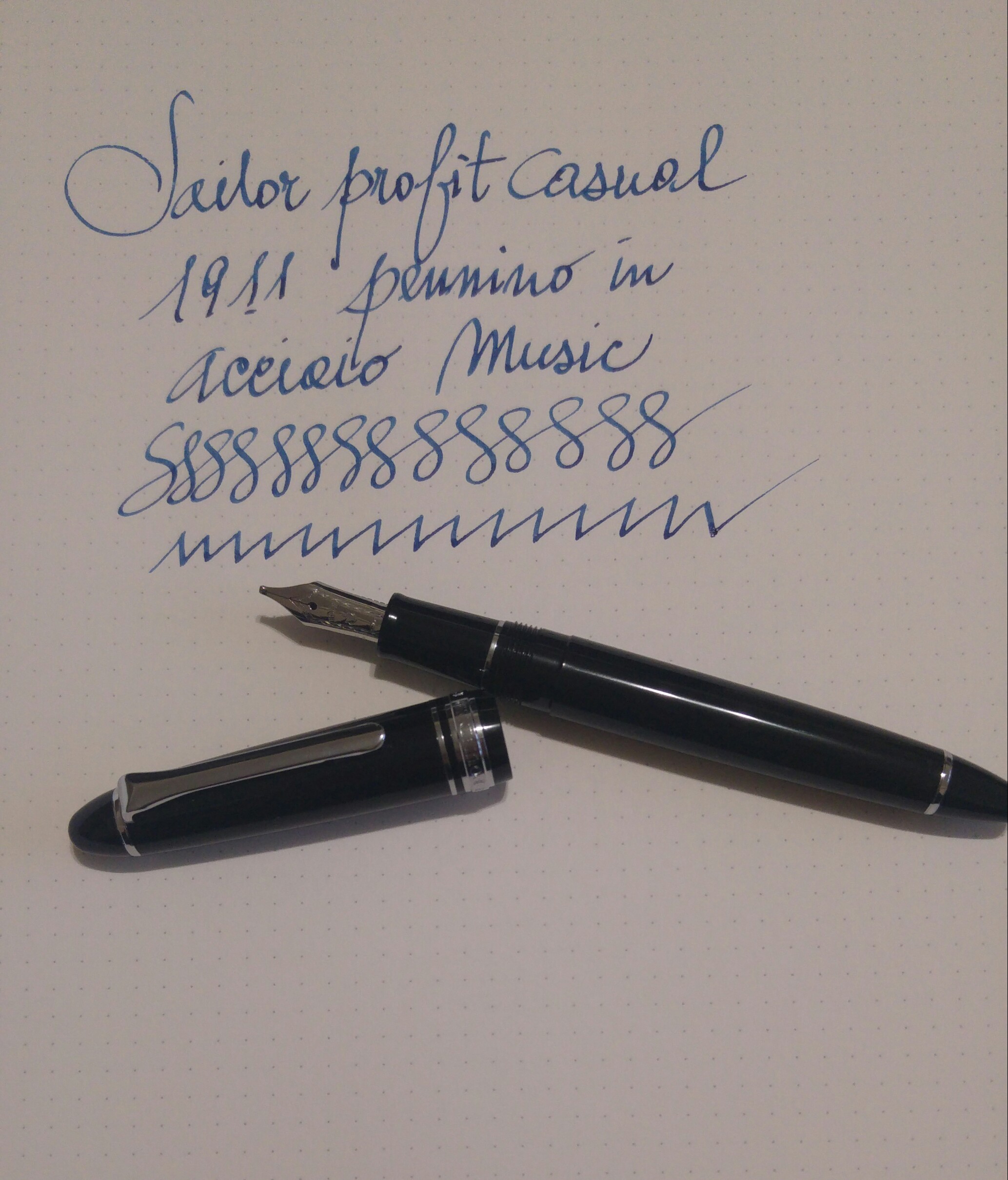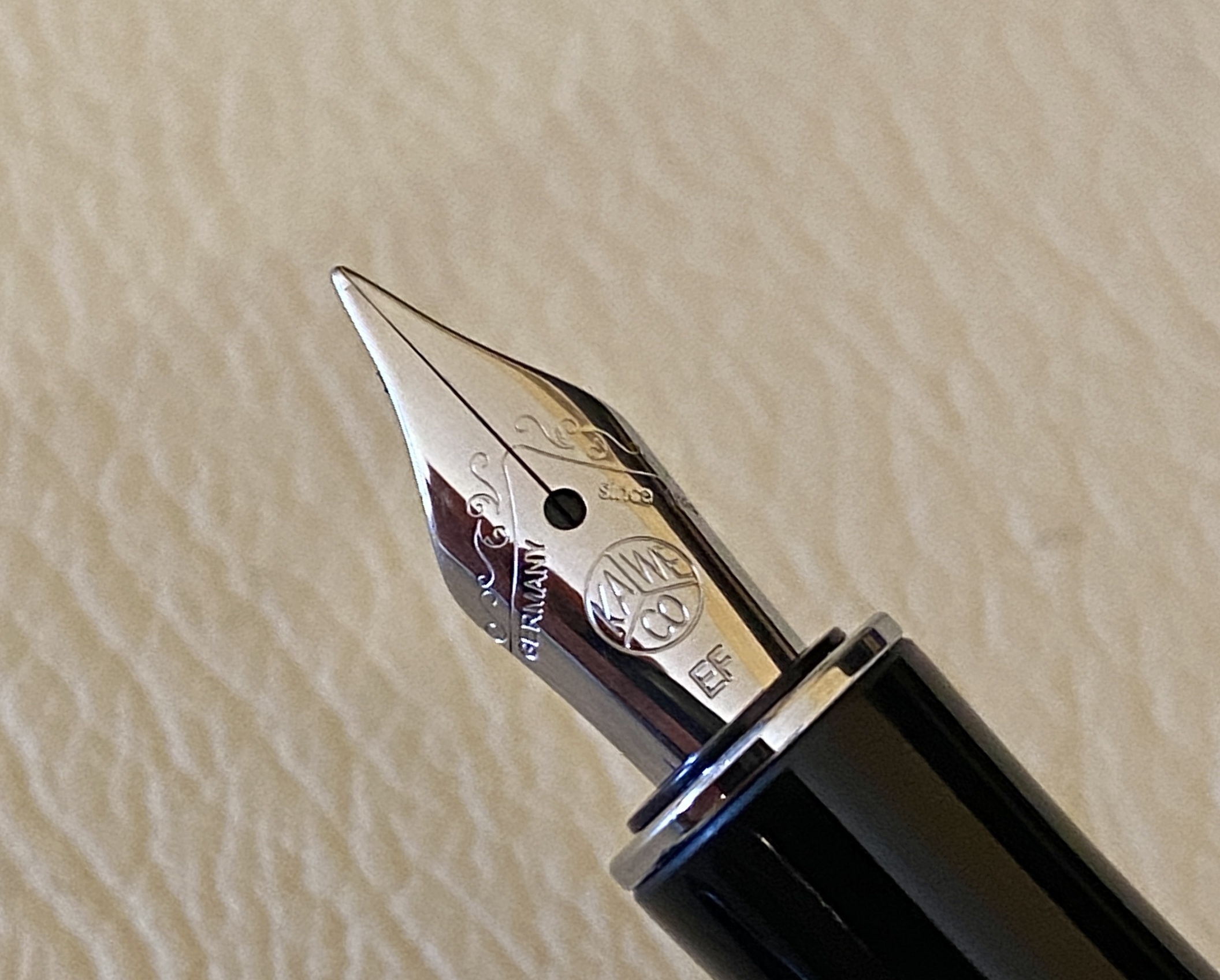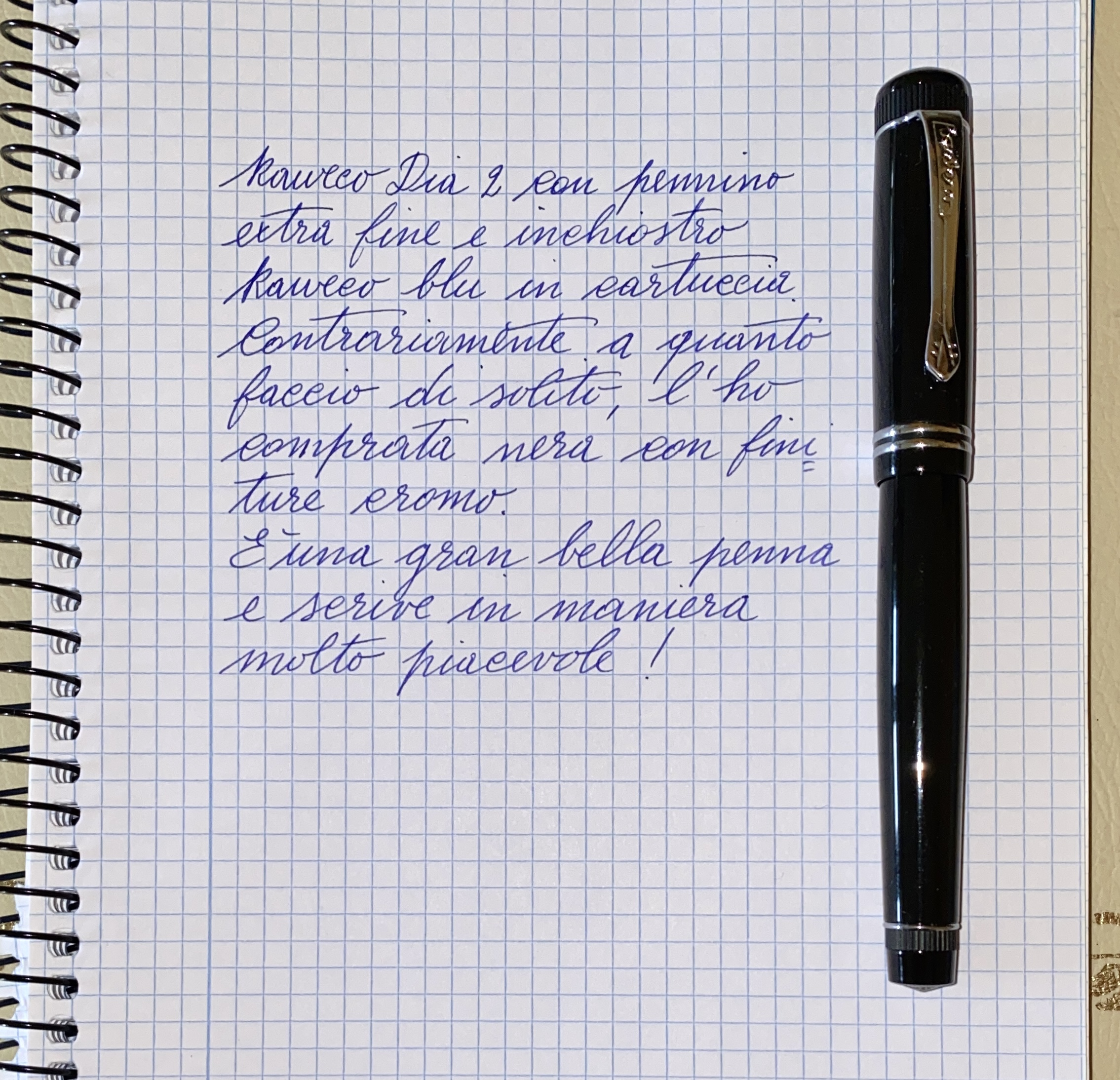 Pennino in acciaio di grado F, un chiodo ma silenzioso e scorrevolissimo e con un flusso ben regolato (cartuccia Pelikan 4001 nero brillante).