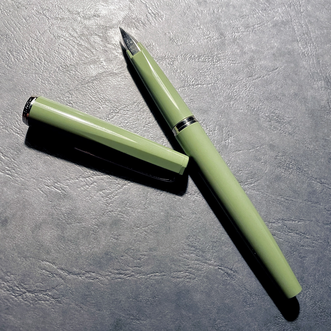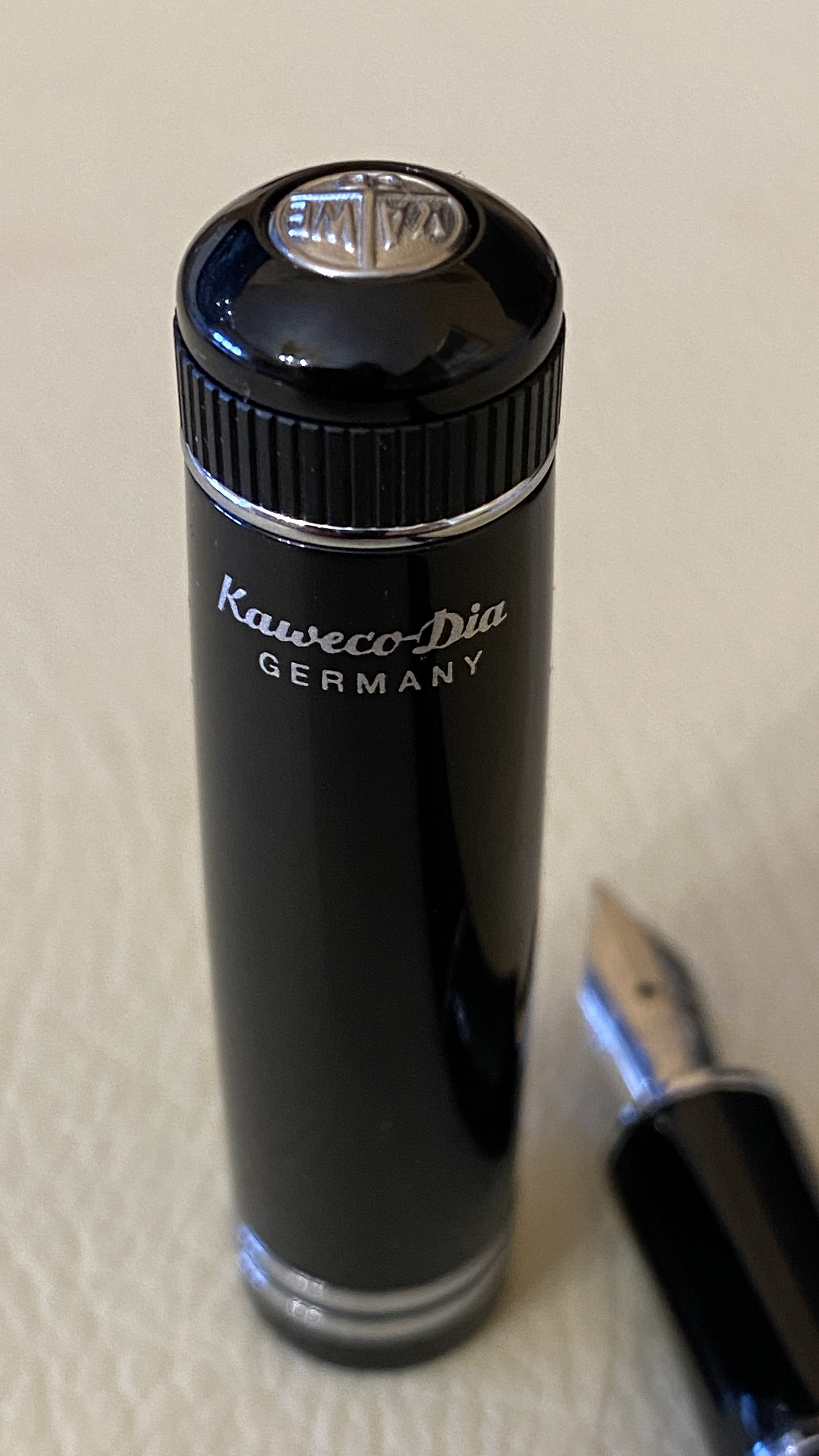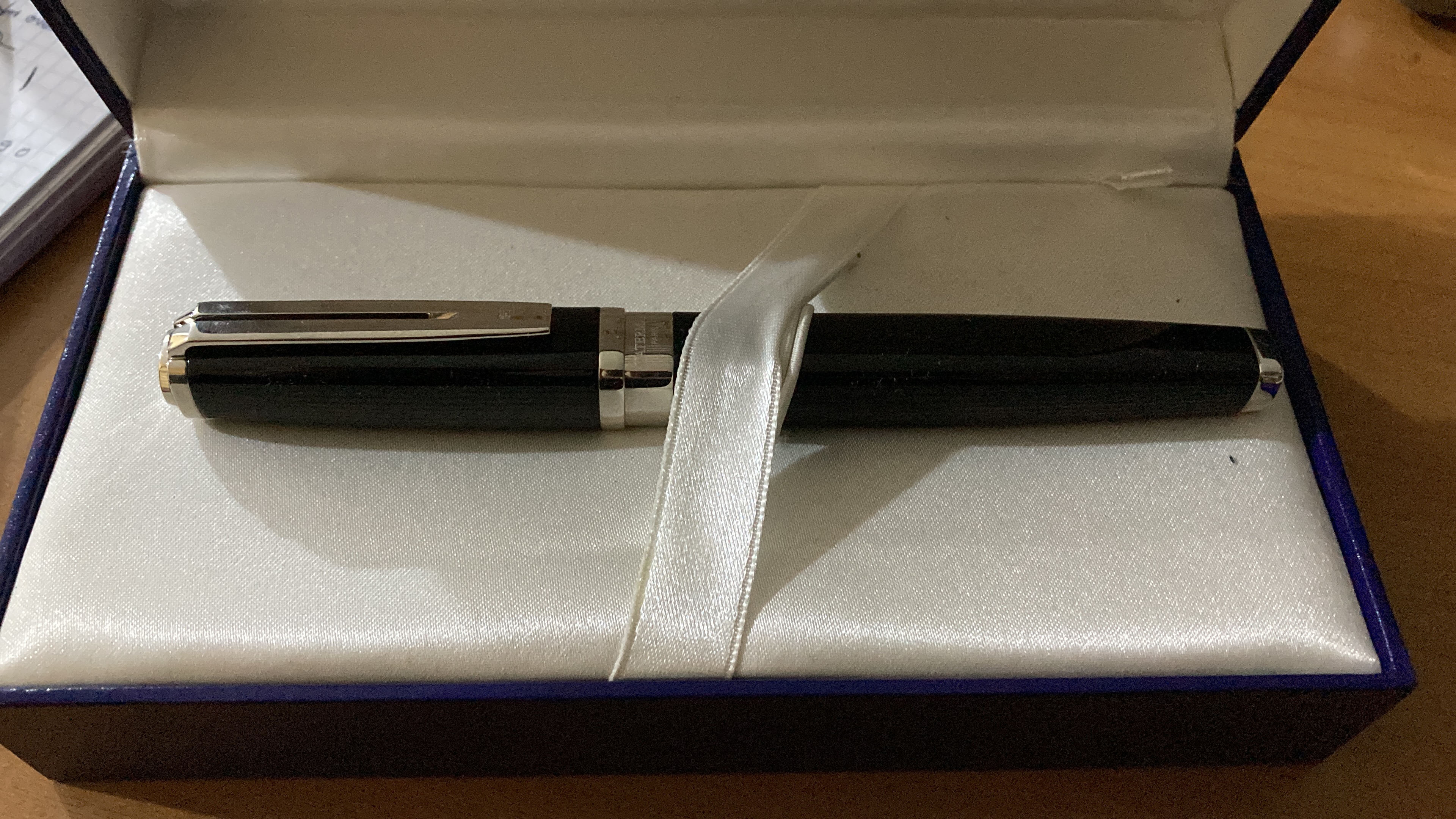 Pennino in acciaio di grado F, un chiodo ma silenzioso e scorrevolissimo e con un flusso ben regolato (cartuccia Pelikan 4001 nero brillante).
