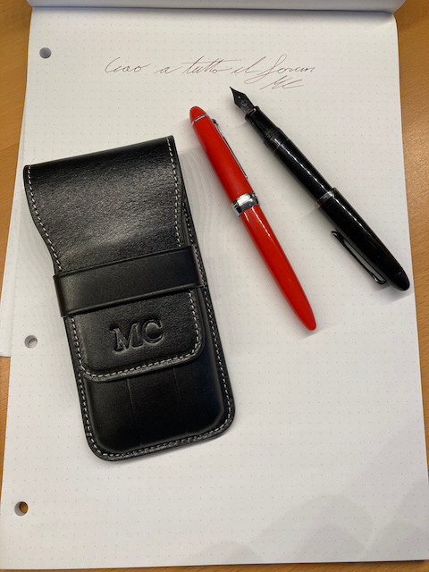Un portapenne Galen Leather (ho ceduto al bisogno egotico della personalizzazione), e due Sailor , una Shikiori F e una Profit Kurogane MF.