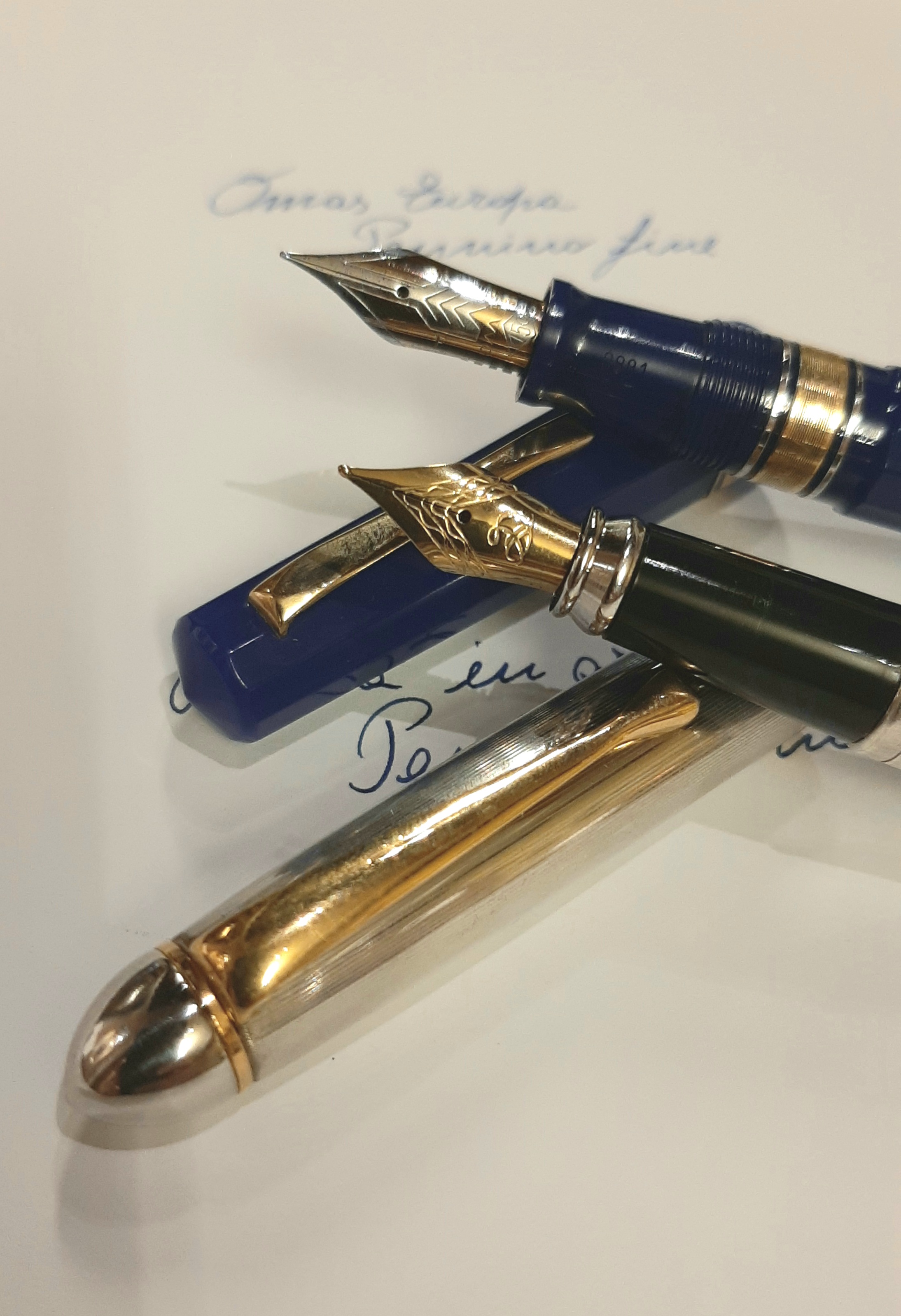 Sono incappato in queste due penne e non potevo non prenderle...la Omas Europa ha un bel pennino fine che dopo qualche giorno d' uso ha iniziato a scrivere molto bene, così come la Delta in argento con un pennino medio dorato dopo un po' di rodaggio ha iniziato a regalarmi soddisfazioni.