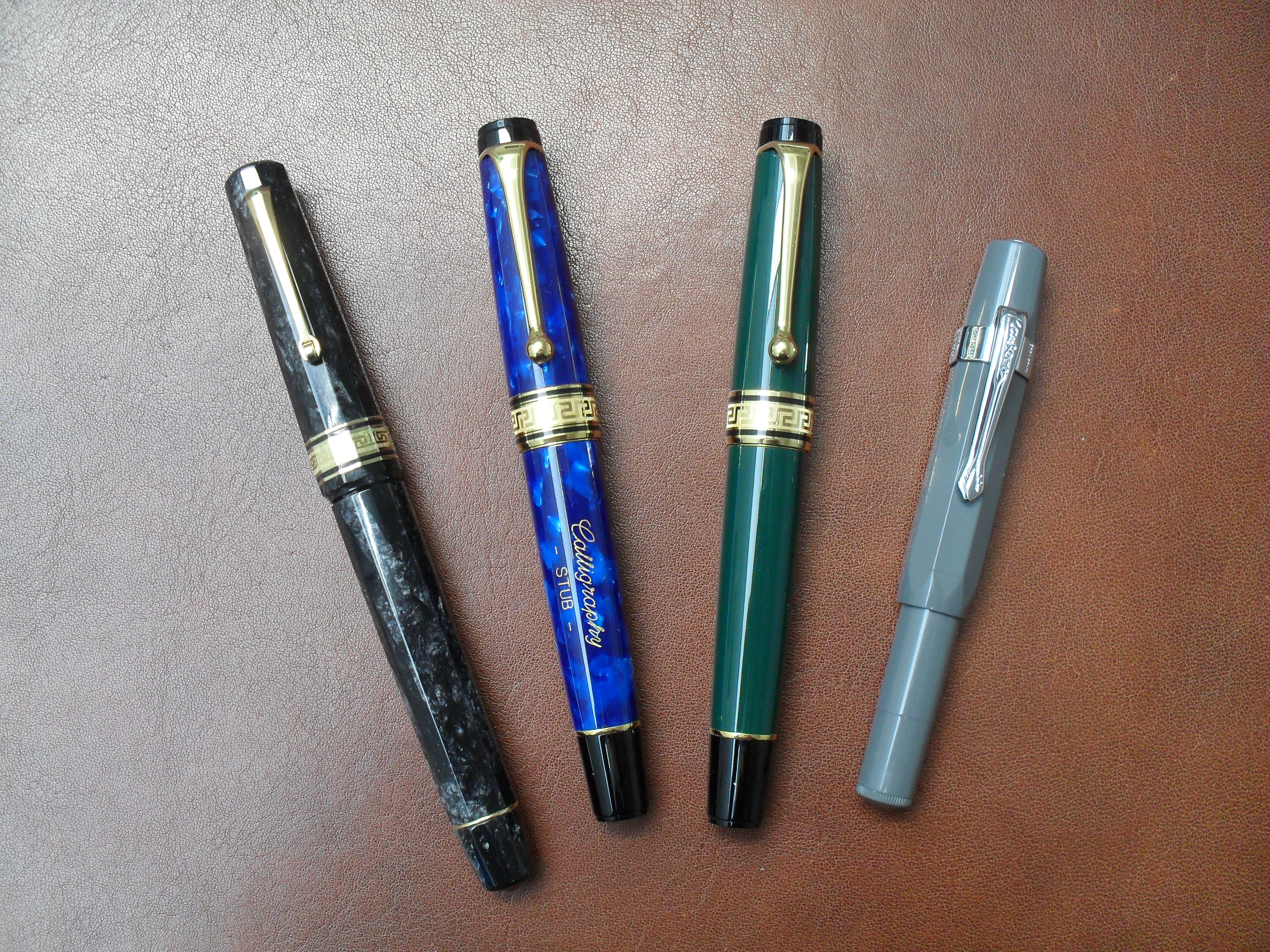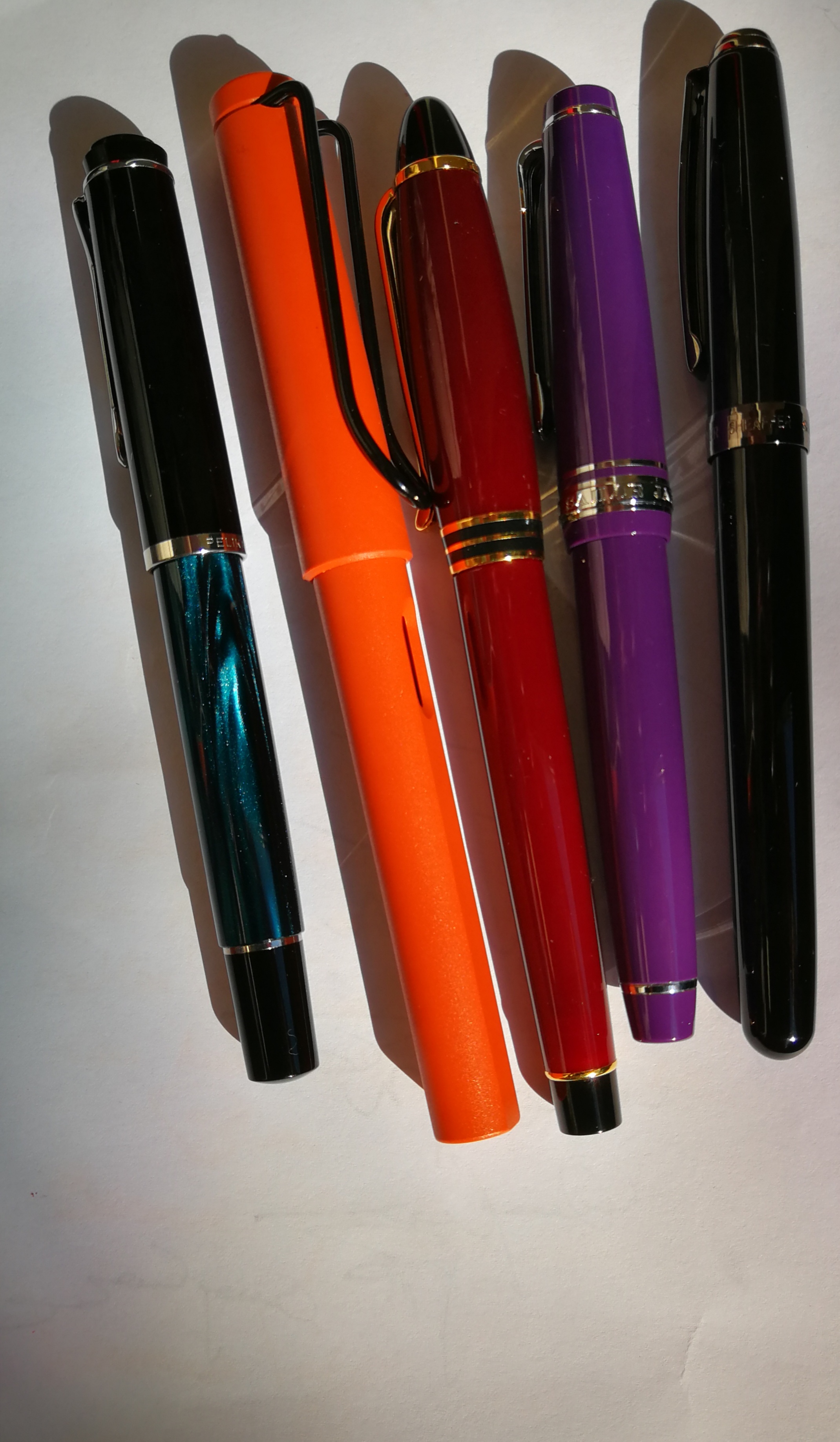 Pelikan m200 Petrol Marbled inchistrata con il Diamine Sherwood Green, Lamy Safari Terracotta inchiostrata con il Sunny Orange della Jinhao, Aurora Ipsilon Inchiostrata con il Diamine Poppy Red, Sailor Professional Gear inchiostrata con il Baystate Blue e infine la Sheaffer prelude inchiostrata con l'Onix Black della Diamine