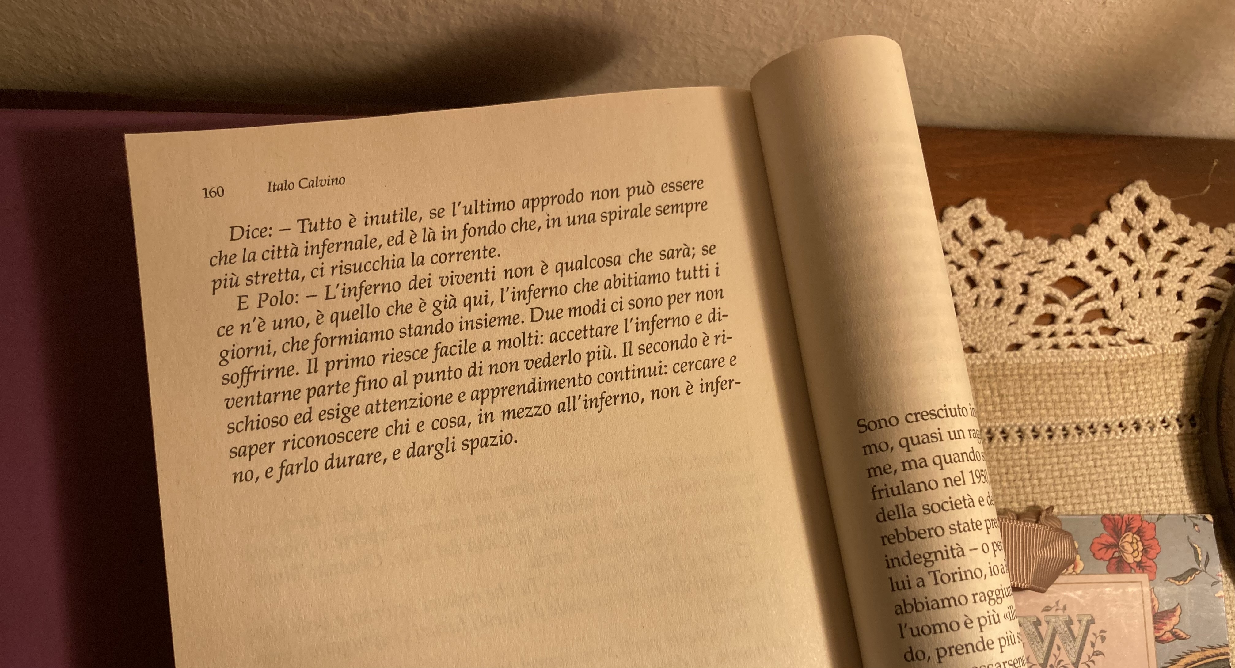 “ L'inferno dei viventi non è qualcosa che sarà; se ce n'è uno, è quello che è già qui, l'inferno che abitiamo tutti i giorni, che formiamo stando insieme. Due modi ci sono per non soffrirne. Il primo riesce facile a molti: accettare l'inferno e diventarne parte fino al punto di non vederlo più. Il secondo è rischioso ed esige attenzione e apprendimento continui: cercare e saper riconoscere chi e cosa, in mezzo all'inferno, non è inferno, e farlo durare, e dargli spazio.”