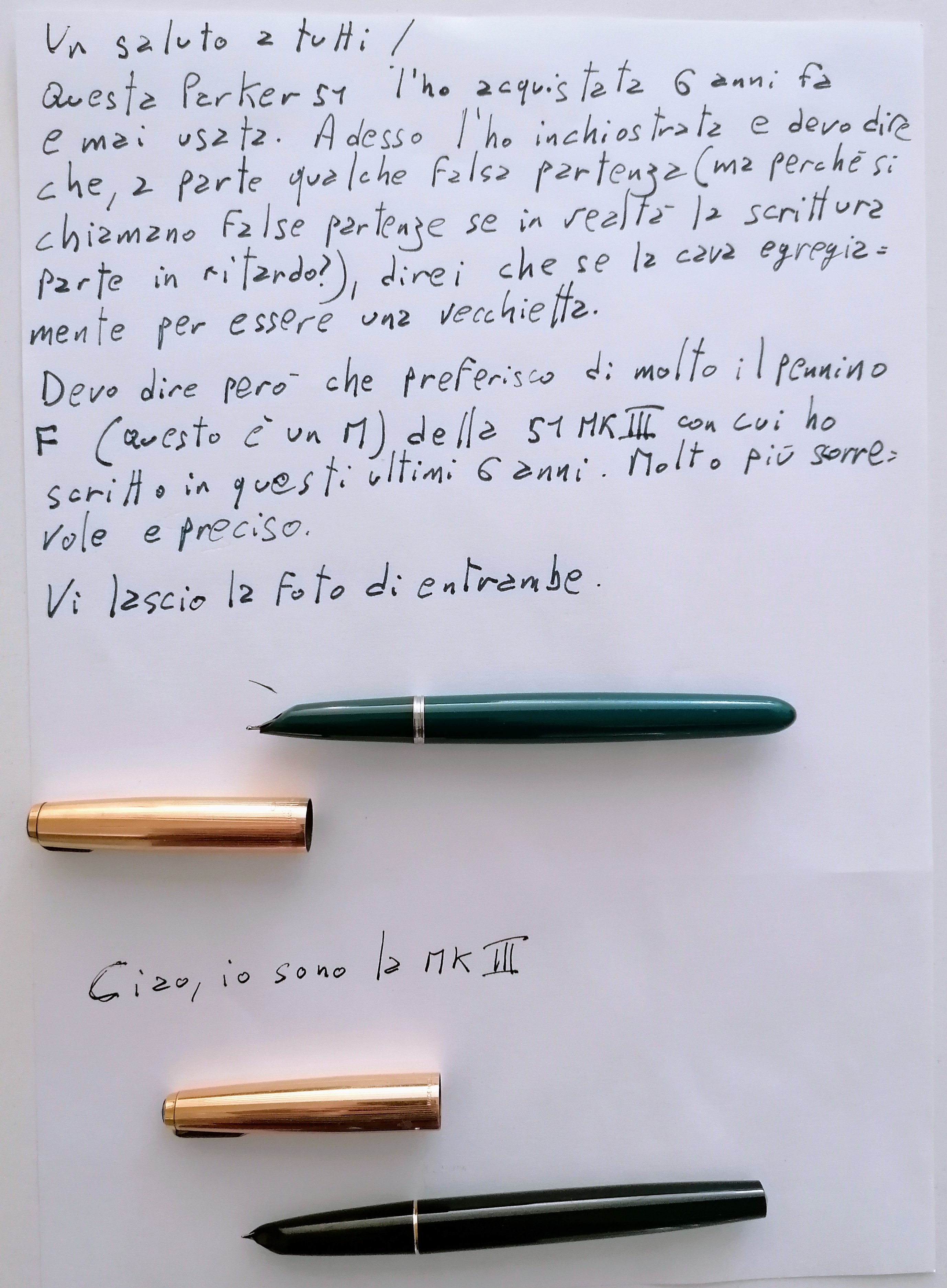 Le Parker 51 sono le mie uniche stilografiche, prese più per collezione che per altro; ne ho diverse, un po' in tutti i colori. Adesso è in arrivo una Pelikan M400 ma mi sono già pentito di averla presa, con quella cifra mi potevo comprare un paio di 51new :(
