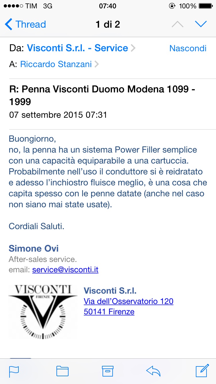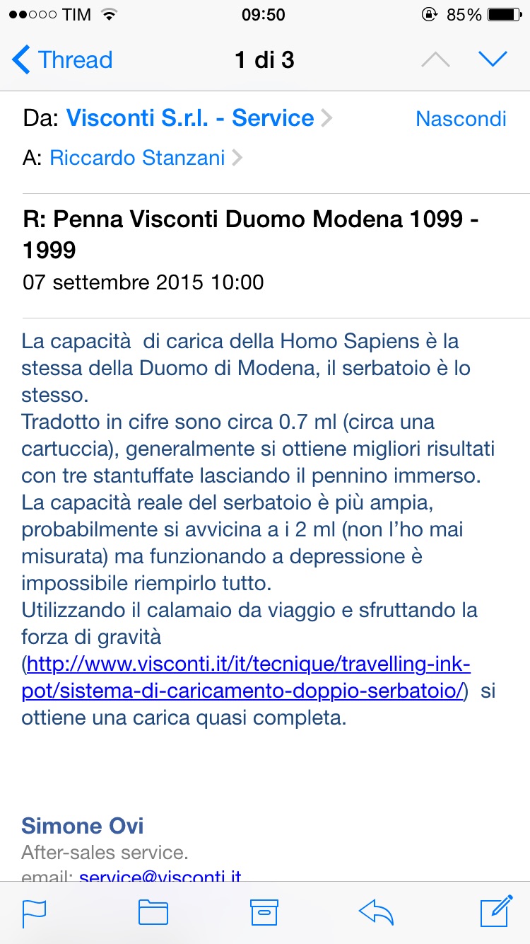 alfredop ha scritto:Si, ma se hai azionato il sistema di caricamento e non hai avuto fuoriuscita di inchiostro direi che appunto il serbatotio era sostanzialmente vuoto. Purtroppo quel sistema di caricamento ha il brutto difetto (ho una Homo Sapiens) di non lasciare capire quanto inchiostro viene effettivamente aspirato dalla boccetta, l'unico rimedio è di usare l'apposito contenitore Visconti.