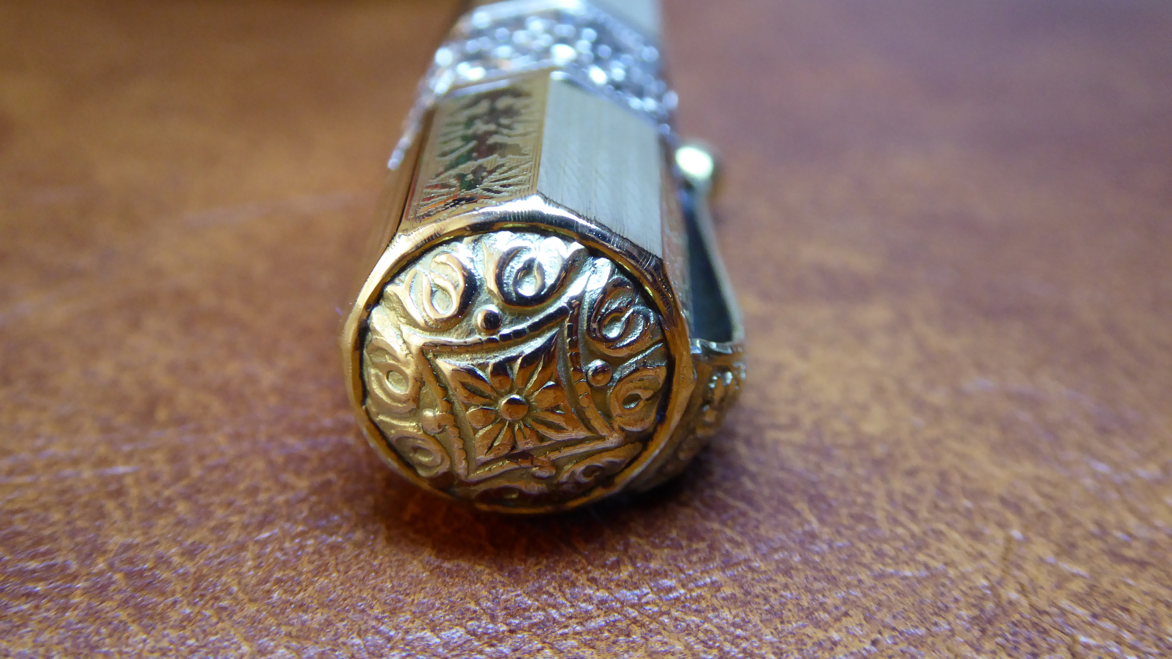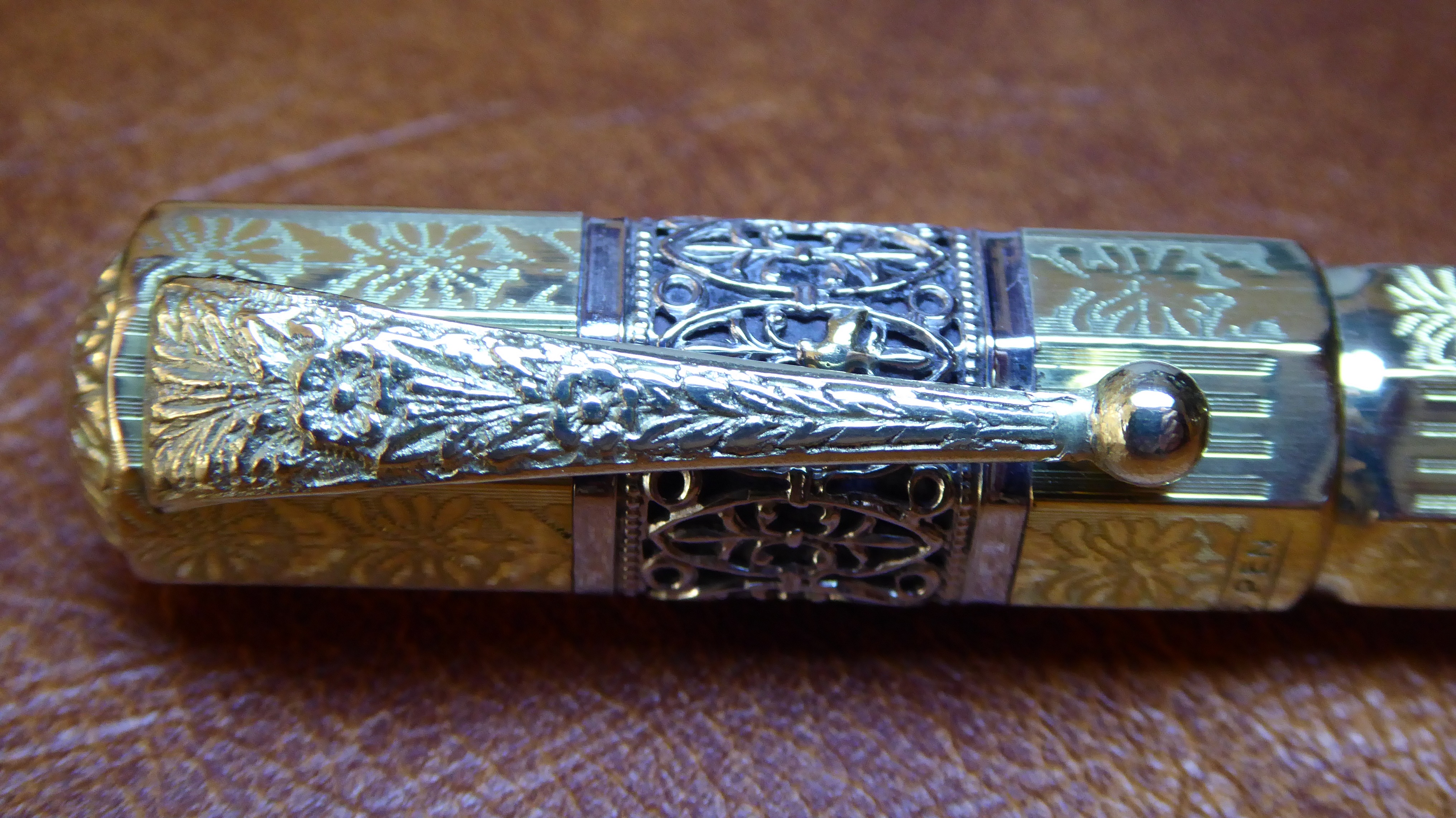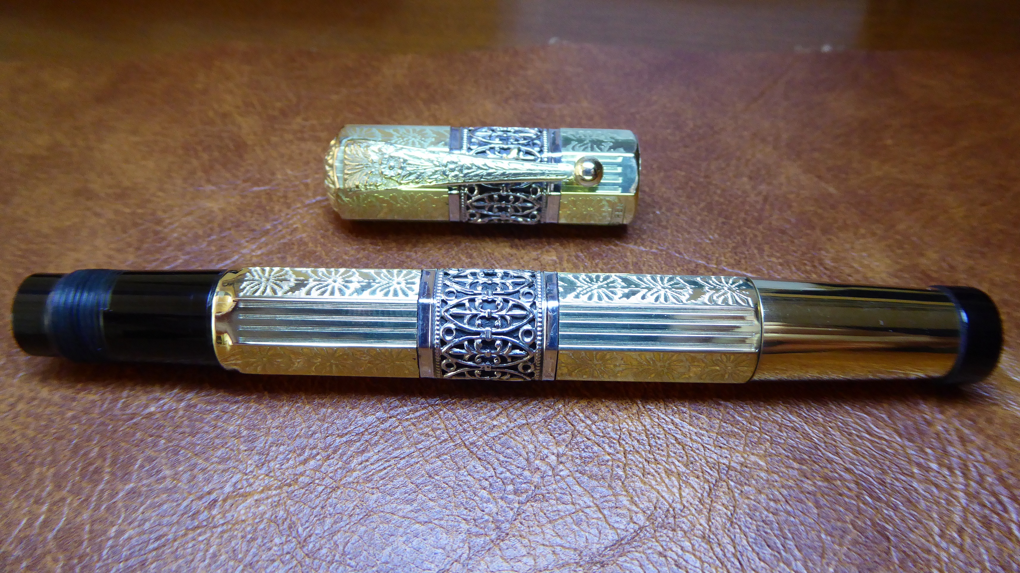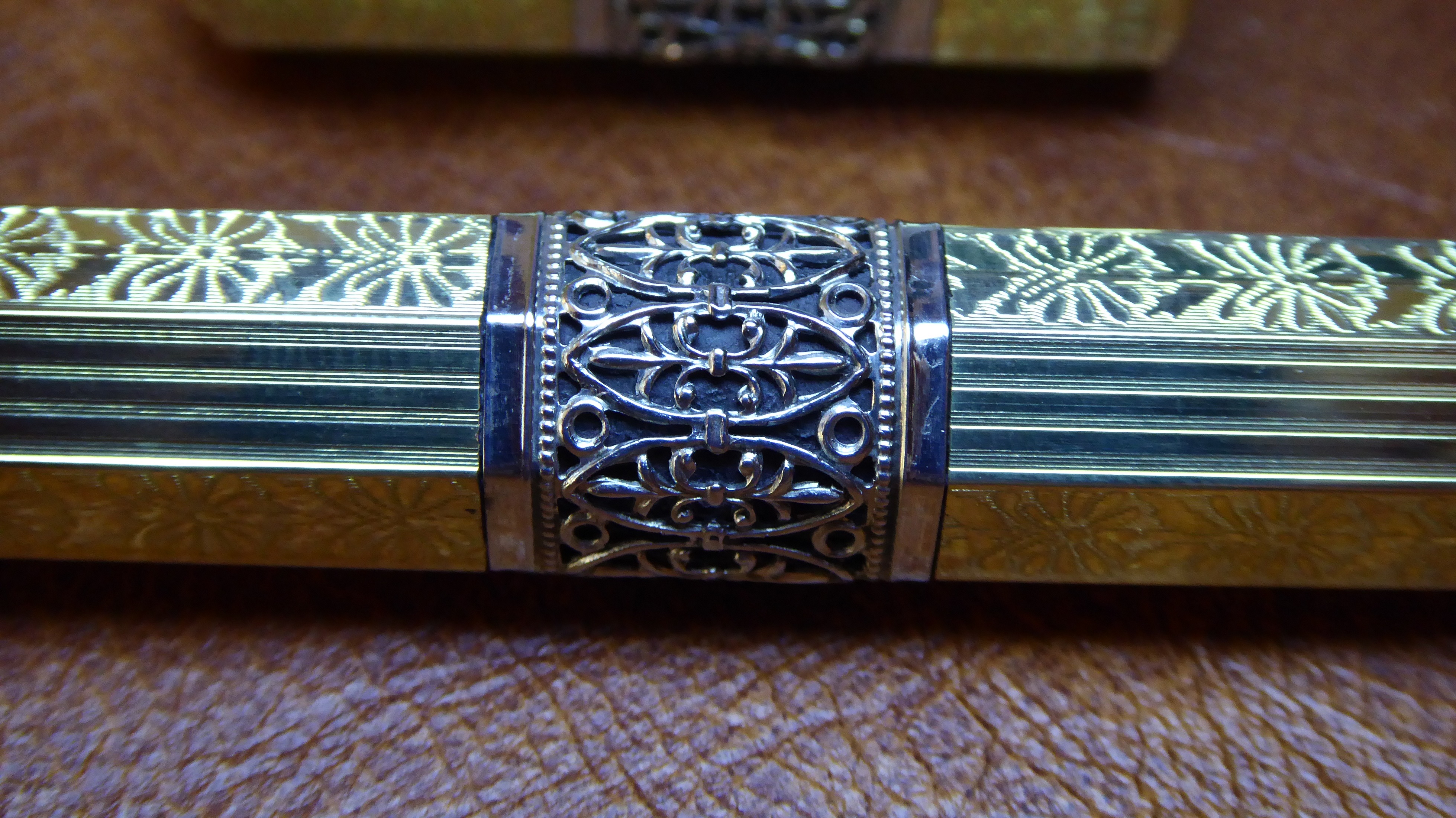 Non esagerare a tenere in acqua l'ebanite, dopo asciuga, lucida la doratura non ci sono problemi, io però sarei molto parco col liquido per lucidare, ho detto io perchè altri pensano che con le laminature antiche si può andare tranquilli, giusto, però se è consumata si finisce di assottigliarla.