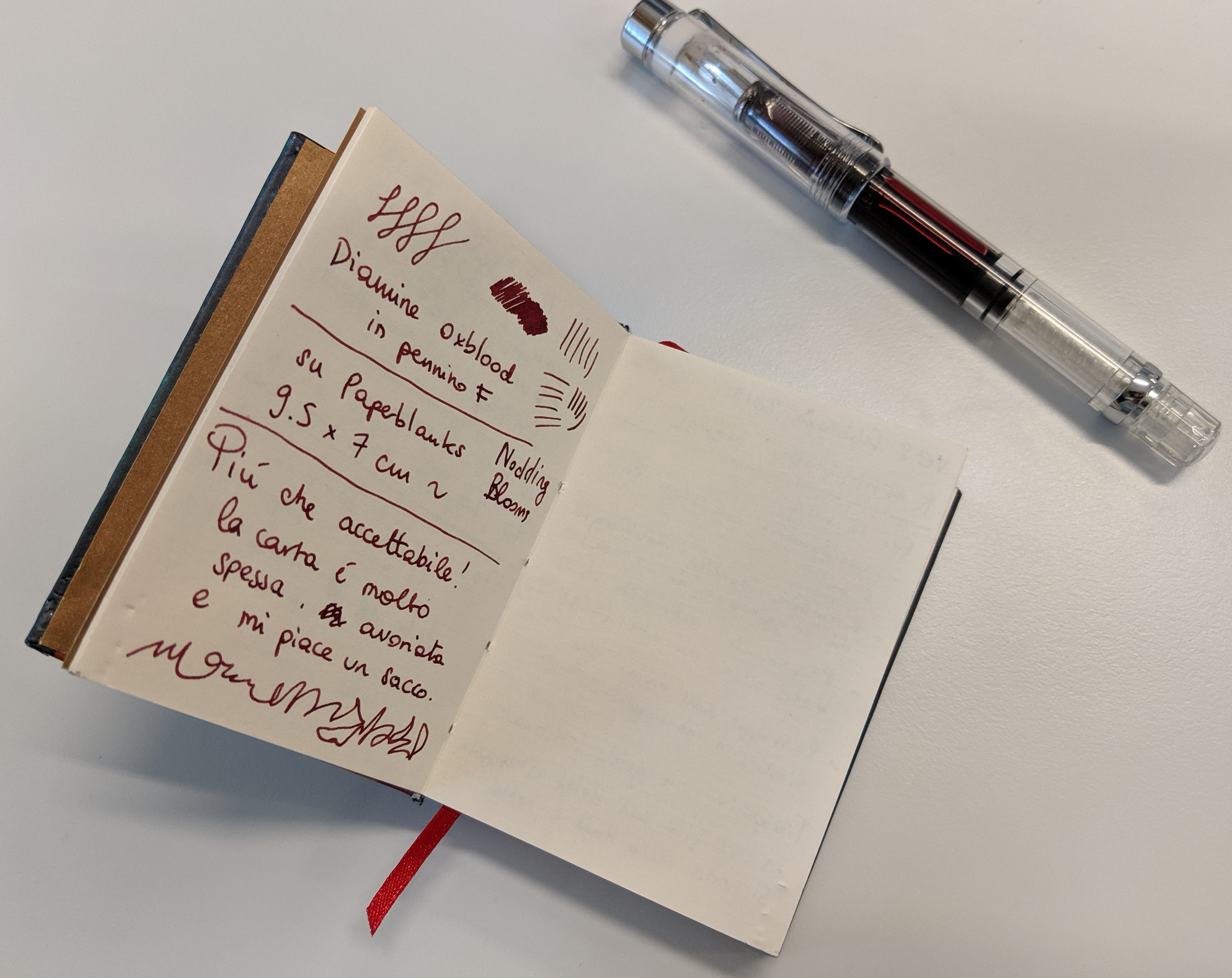 Avevo cominciato a scriverci con la stilografica e un inchiostro blu da cartuccia classico e mi ha stupito: posso scrivere sia davanti che dietro al foglio, non trapassa nulla, si vede a malapena quello che si è fatto dietro! (nella foto qui sopra ho scritto dietro, su entrambe le pagine, con il Pelikan 4001 blu da cartuccia e un pennino medio).