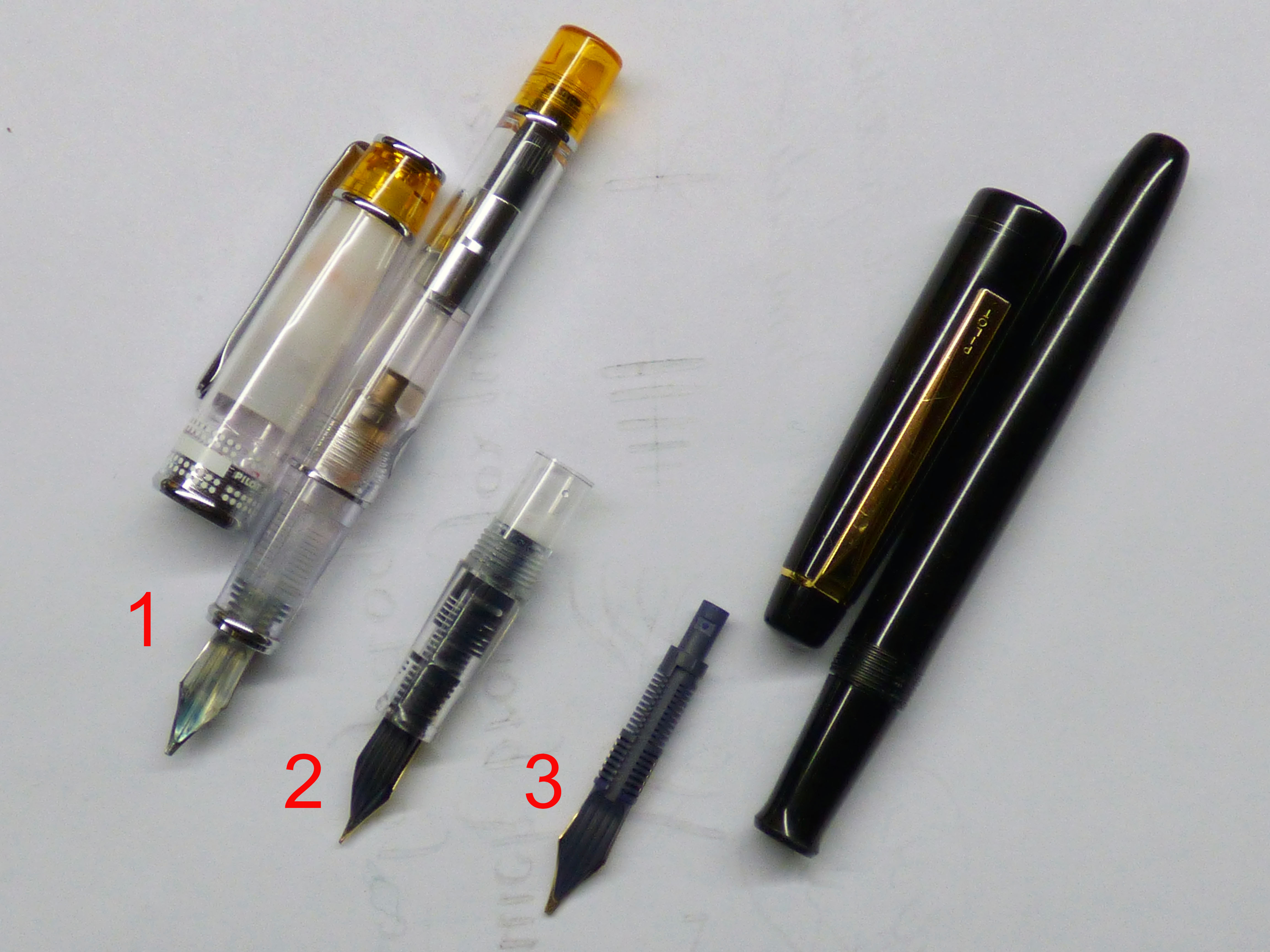 identificato con il n° 1: Pilot Prera con alimentatore Wing Sung 659 e pennino Prera montati nella sezione della Prera