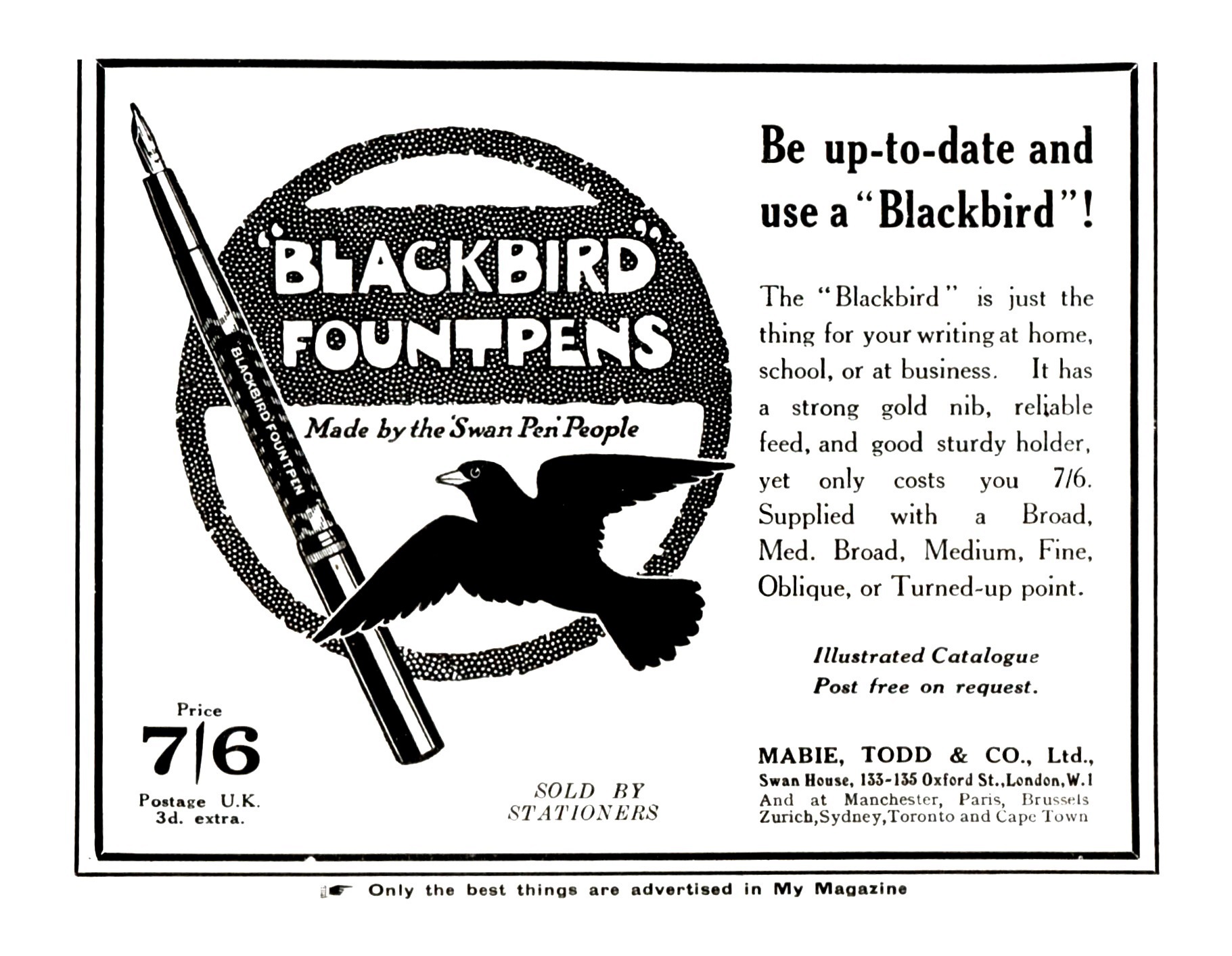 td" nell'iscrizione, vorrebbe dire che la tua è probabilmente di produzione di poco anteriore al 1915 (cambiamento di ragione sociale per l'acquisizione del Marchio e della proprietà di tutti i mezzi di produzione da parte della consociata inglese...). Le fonti sulla Blackbird, tuttavia, sono davvero scarse.