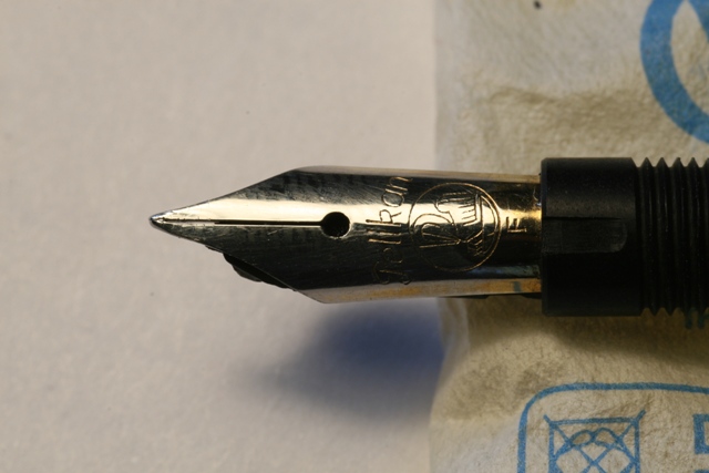 Il pennino che montava era marcato O, non so se originale avendola acquistata usata in Germania, ed era un vero innaffiatoio che mal si sposava con la mia scrittura decisamente piccola, con un pennino F ho risolto il problema.