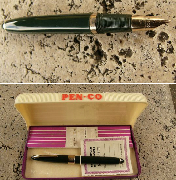 La ditta FRV ( Fratelli Rossi Vicenza) é nata prima della seconda guerra e ha fatto diversi tipi di penne, a leva e a pulsante...direi più eleganti quelle a leva. La leva era molto fine ed elegante e belle anche le corte clip che ricordano in alcuni casi le Sheaffer militari. Insomma i fratelli Rossi manifestavano già da prima la loro passione per le Sheaffer. Ma della loro produzione quello che tutti conoscono é il modello 53. Proprio nel 1953, gli viene in mente di fare una penna con un pennino in oro 14k simile al Triumph della Sheaffer e a copiare altre due cose: il caricamento Touch-down è come se non bastasse il “whiteboards dot” all’estremità del corpo della penna. Quello che raccontano é che la Sheaffer fece causa alla Penco. In realtà tanti anni fa aiutai un dottorando la cui tesi verteva sui copyright. Questo ragazzo poi mi raccontó che la Sheaffer si era mossa diversamente. In pratica i rappresentanti di area minacciarono i rivenditori che se avessero continuato a vendere Penco gli avrebbero tolto la possibilità di vendere Sheaffer.