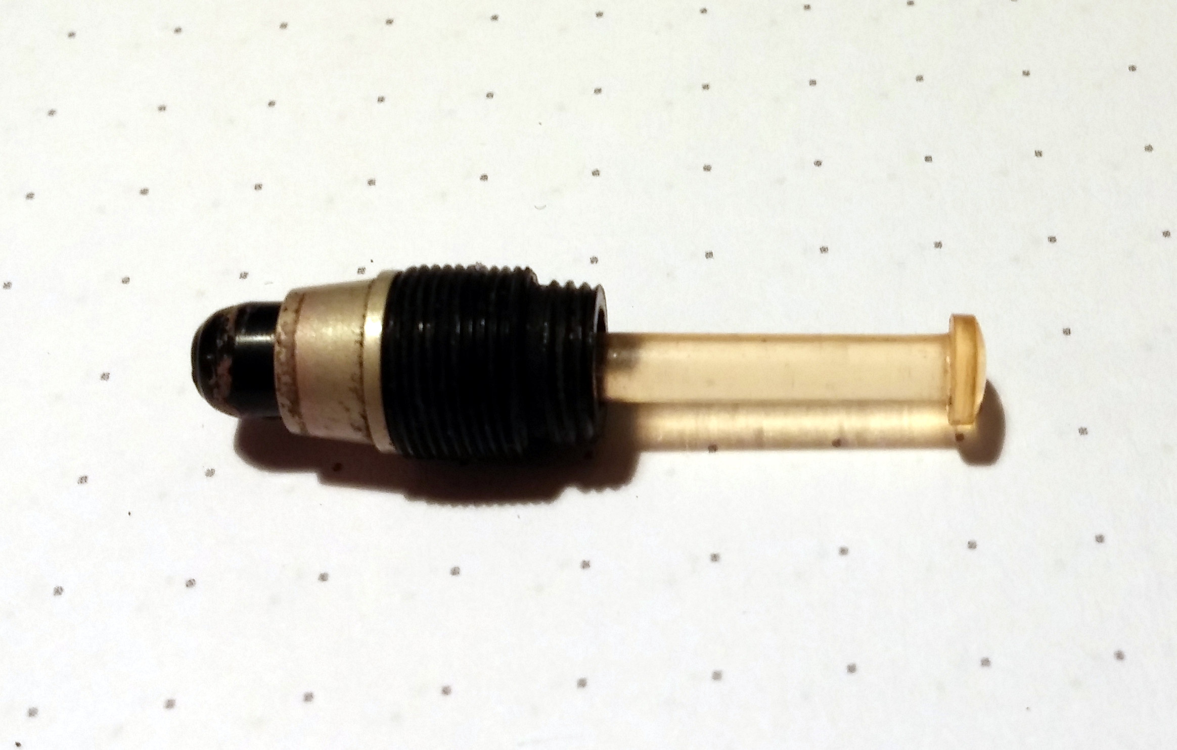 La sezione, oltre ad essere stata usata a sproposito per attaccarvi un sacchetto mostarava una cavità, che non mi aspettavo là dove è attaccato il tubicino. Ho spinto il tubicino e con poco sforzo (troppo poco) è uscito l'alimentatore con il pennino. Ecco il problema:
