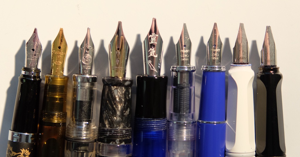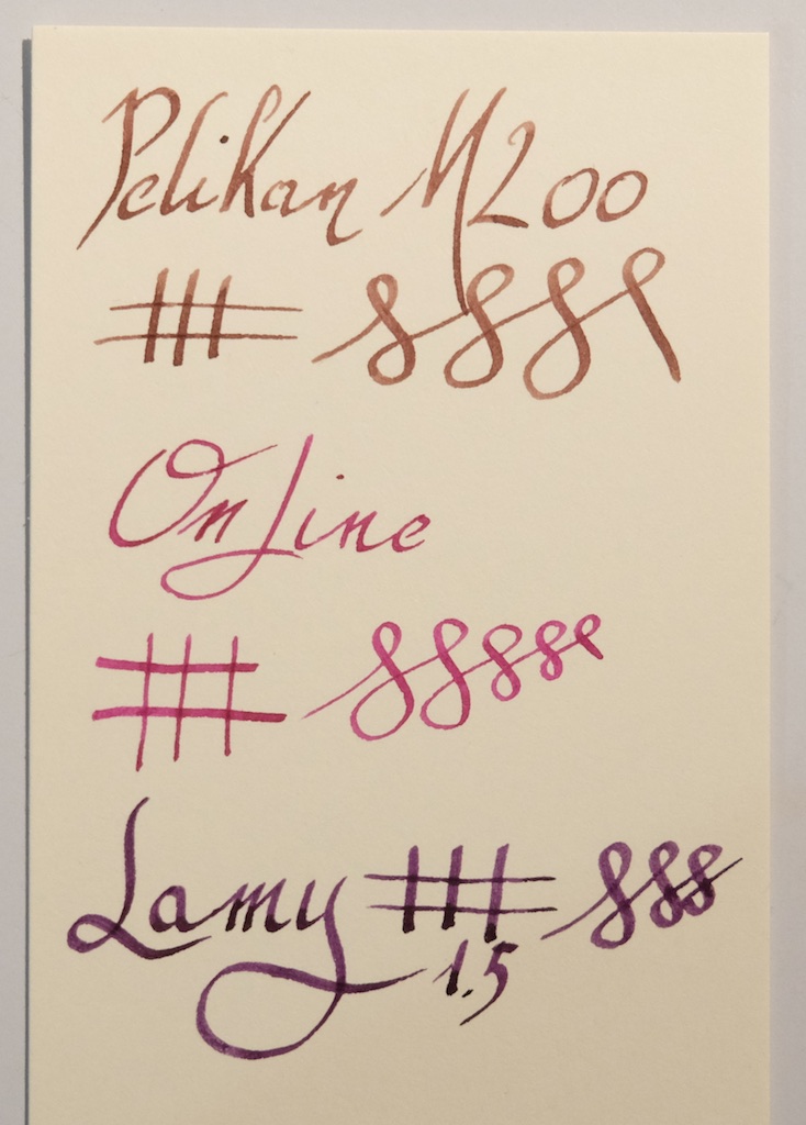 Tra le penne stilografiche con pennino stub in mio possesso le Pilot Prera con pennino CM sono quelle che preferisco per scrivere, anche se forse non le si può definire eleganti. Montano un pennino sottile che permette variazioni di tratto anche con scrittura minuta, e smettono di scrivere solo quando finisce l'inchiostro, problema comune a tutte le penne a quanto mi è dato sapere. La Pelikan M200 cognac con pennino stub mi ha creato numerosi grattacapi all'inizio che ho risolto verificando e correggendo l'allineamento dei rebbi; da una penna non proprio economica mi aspettavo maggiora attenzione. Il tratto è gradevole ma il delta di spessore minore che nel corrispondente stub Lamy.