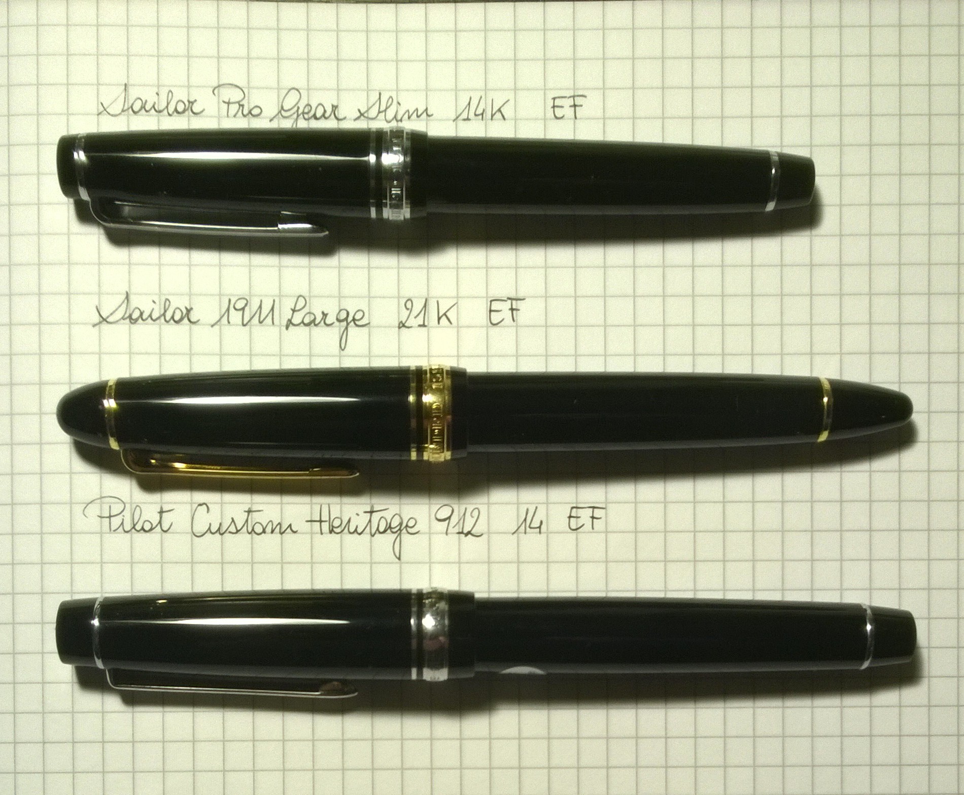 Ti lascio tre foto. La Sailor 1911 Large con il pennini 21K ha un flusso più abbondante. La cosa migliore che puoi fare è tenerle in mano e provarle.
