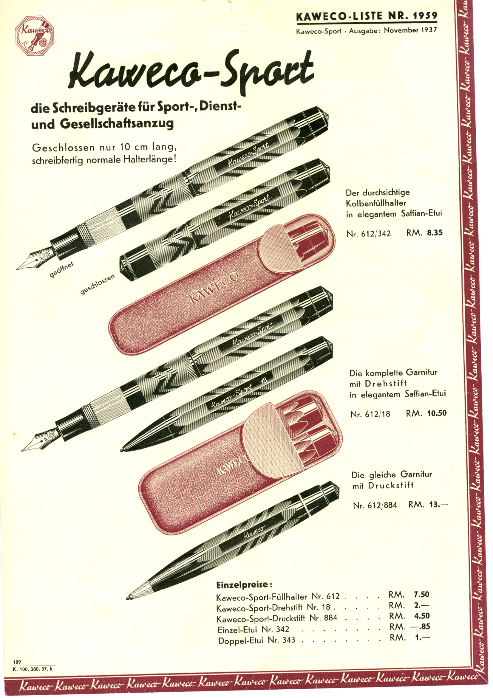 Da notare il pennino WARRANTED (Garantiert) alla tedesca, ma marchiato Kaweco, e l'assenza nei disegni del numero di modello sul fondello.