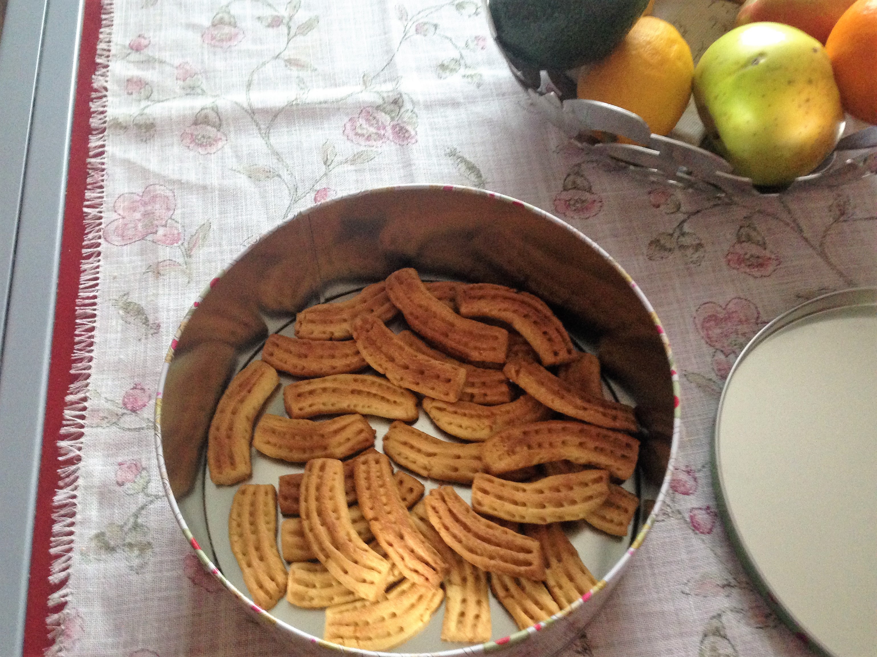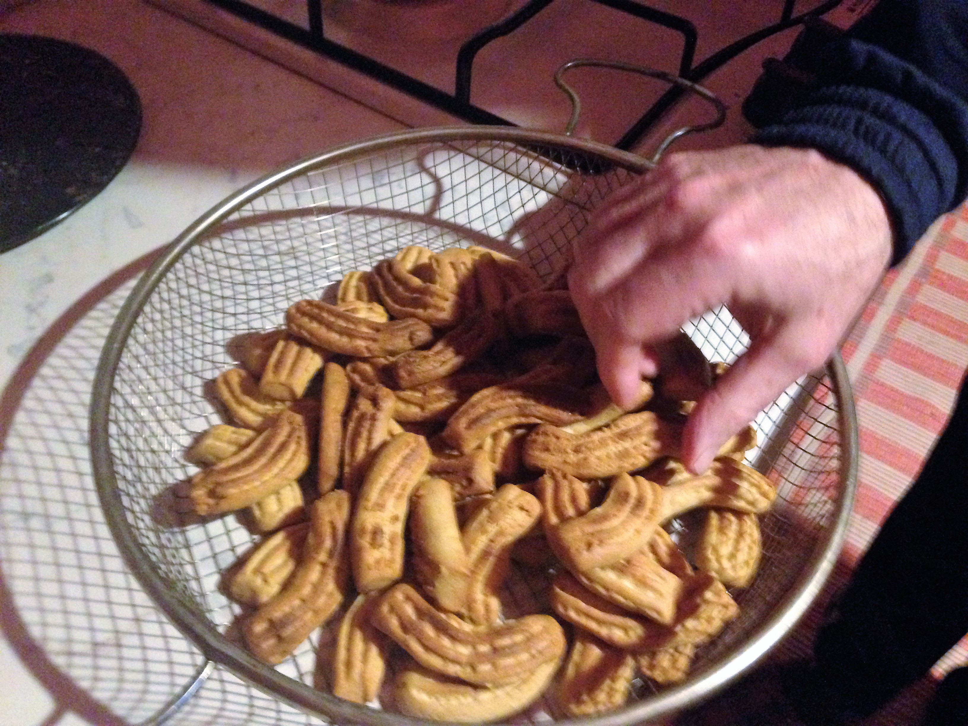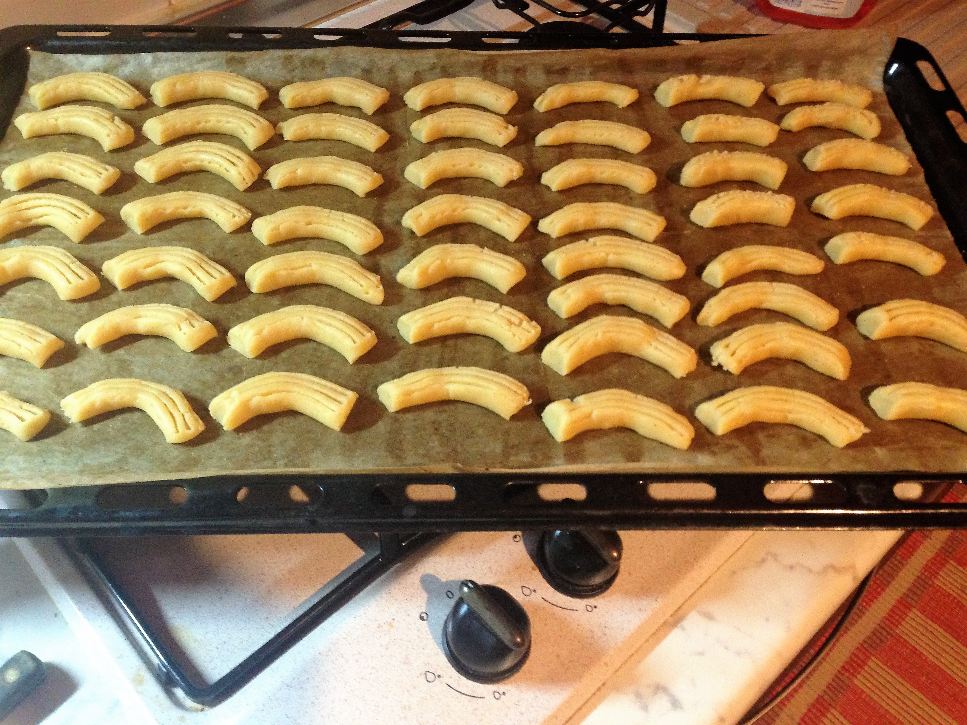 impossibile passare l'impasto nello spara biscotti è troppo consistente, per cui si taglia l'impasto a pezzi, si fanno le bisce, si taglia a tocchetti, si usano i rebbi della forchetta per rigarli e si piegano leggermente per dargli la forma;