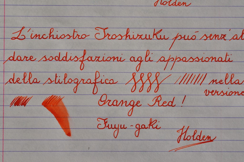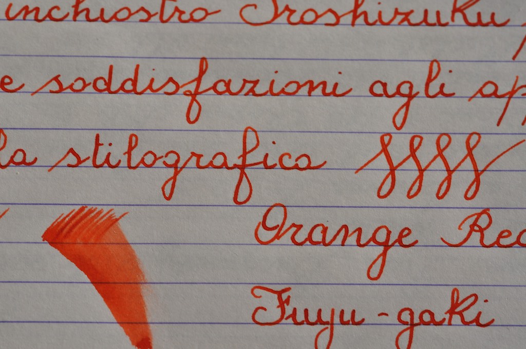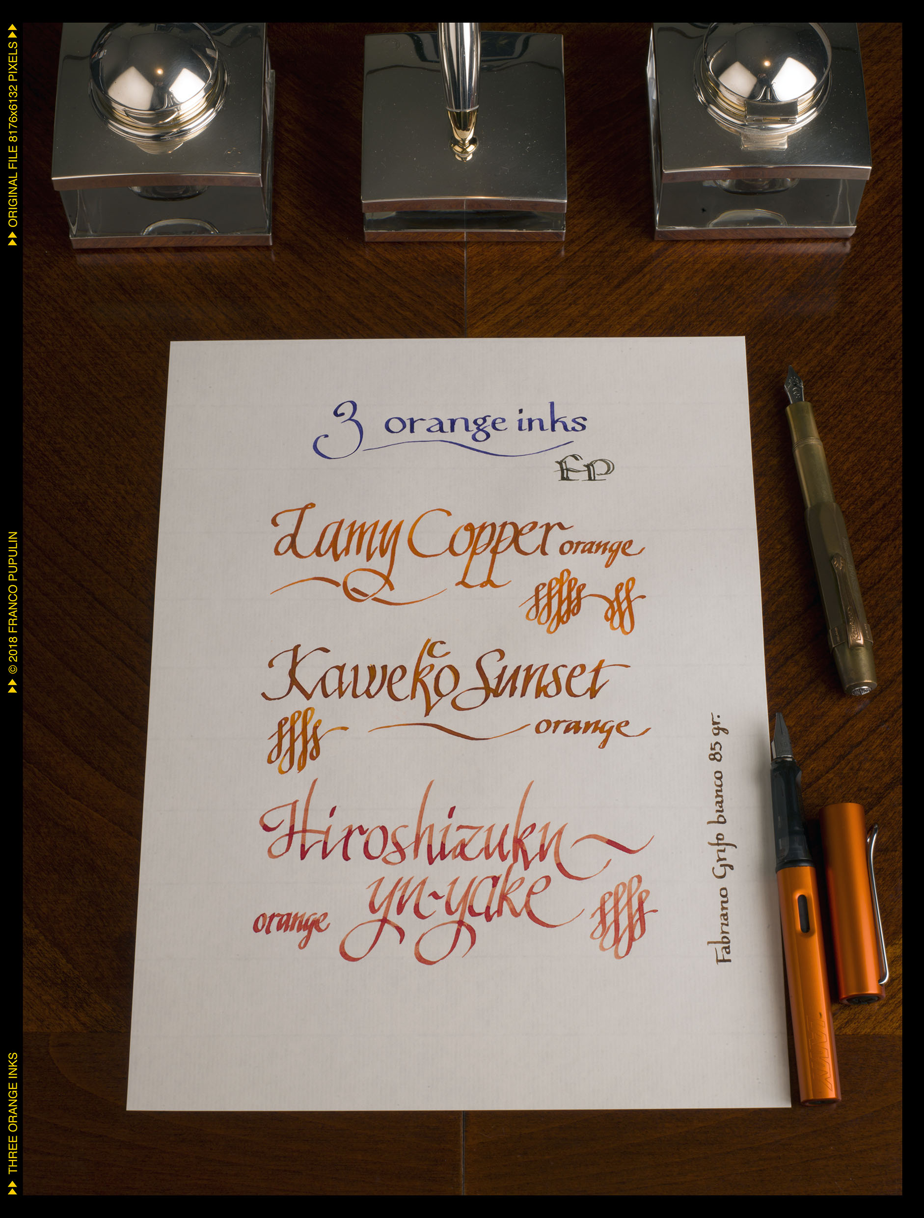 Sperando sia utile anche agli amici di fountainpen.it, aggiungo, come mi é stato richiesto da un utente in un altro forum, un confronto tra gli inchiostri Lamy Copper Orange, Kaweco Sunset Orange e Hiroshizuku yu-yake, tutti scritti con pennino italico più largo, da 1.9 mm (pennini Lamy e Kaweco), che rende più evidenti le doti delle tre tinte.