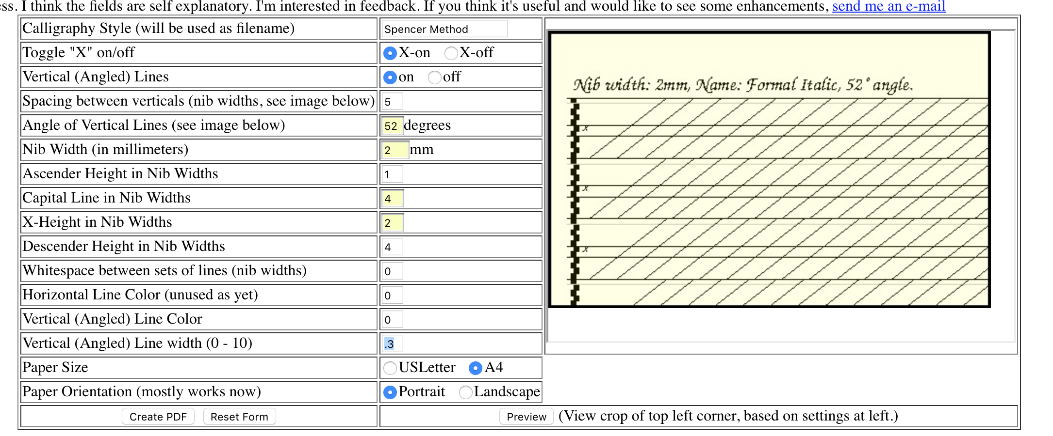 Il calcolatore di falsarighe che ti ho indicato va "ingannato" perchè nasce per i pennini a punta tronca e si basa sulla larghezza del tratto, ma permette di tracciare anche i riferimenti obliqui per mantenere l'inclinazione.