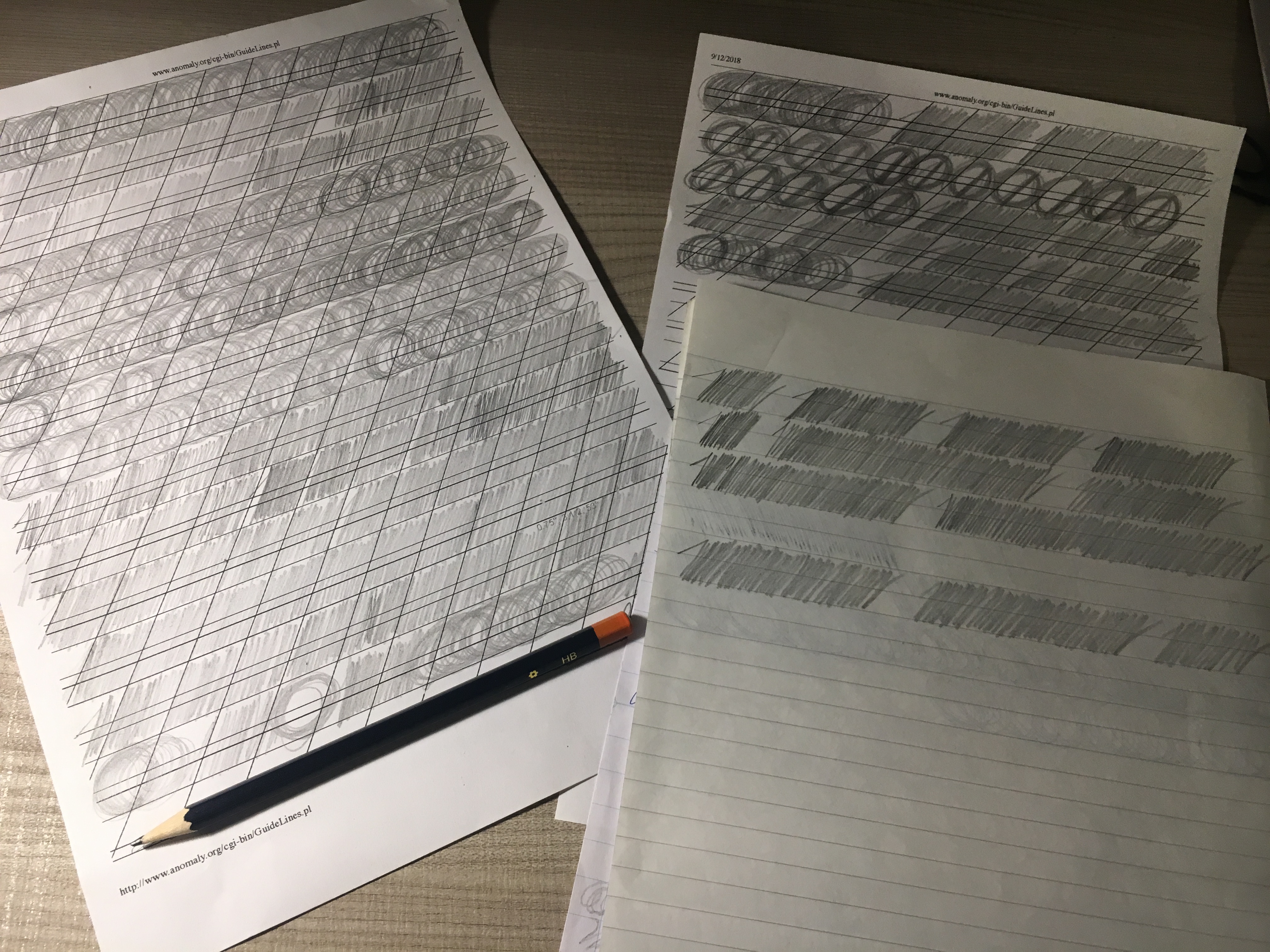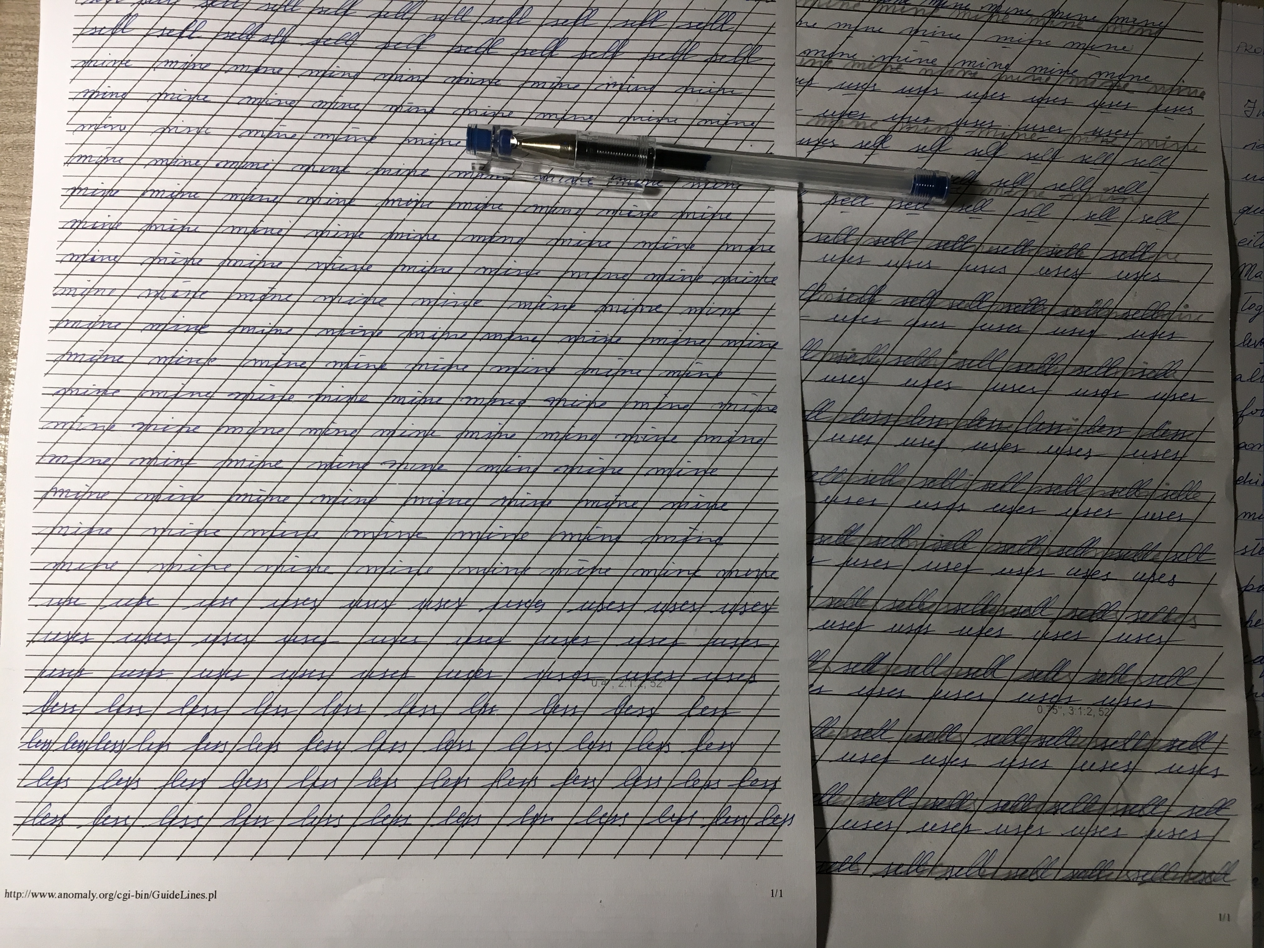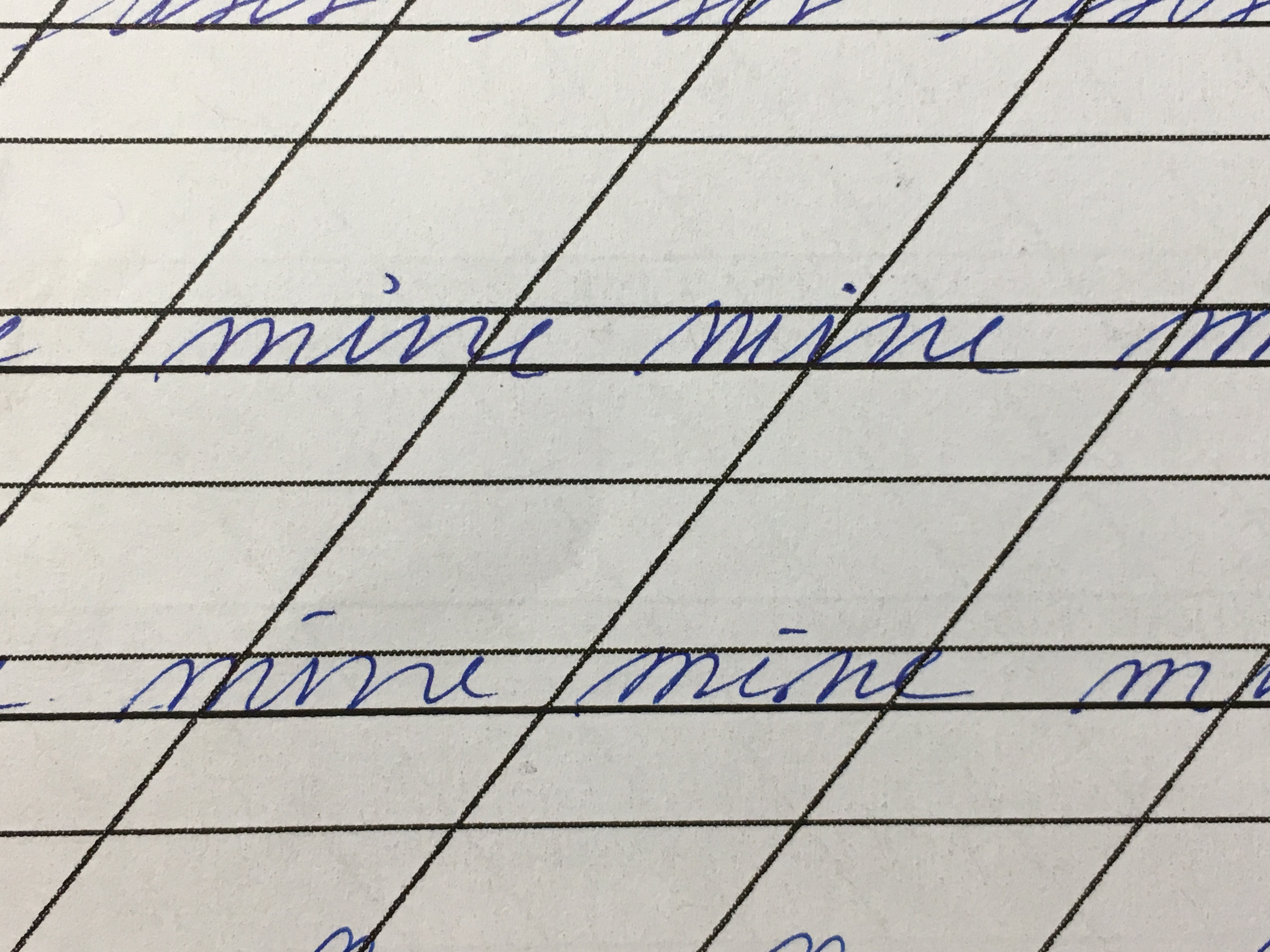 Allego i risultati: dopo qualche esercizio con la falsariga, ho provato una prova a mano senza guide e l'inclinazione delle linee è venuta fuori corretta senza sforzo; non è precisissima, ovviamente, ma ho fatto una prova mettendo i due fogli in controluce ed è abbastanza impressionante. Le guide sono state utilissime!