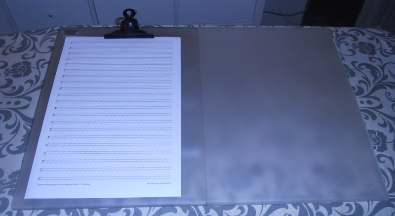 Nell'articolo parla di piano inclinato per la superficie su cui poggia il foglio. Col tuo scrittoio purtroppo la superficie è limitata all'ampiezza del foglio, ecco perché non mi convince. La faccenda della mano che a un certo punto si trova nel vuoto...
