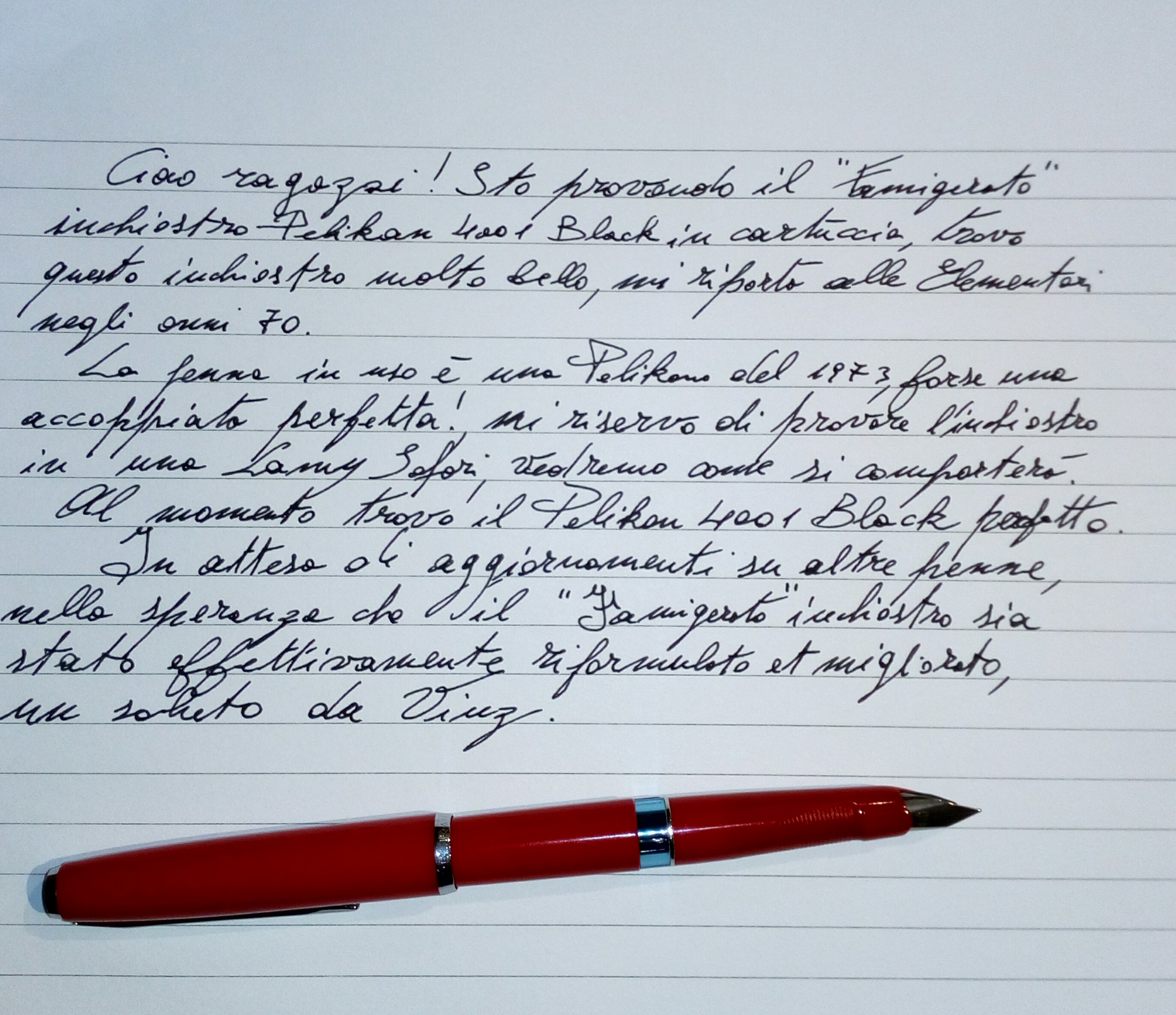 Il nero Pelikan 4001 ha bisogno della penna giusta, ma anche di scrivere; meglio evitare di far invecchiare una carica nel converter per un mese, lo carico solo se devo effettivamente usarlo nel giro di una settimana. Normalmente lo uso su poche penne, tutte con flusso abbondante, e lo trovo bellissimo e molto profondo. Ma la perfezione, fino ad ora, l'ho raggiunta con una Pelikan P470 Steno, anni 70 (credo), con la quale diventa il nero più bello in assoluto (e più delicato con moltissime carte, anche mediocri) che abbia mai usato (e ne ho usati...).