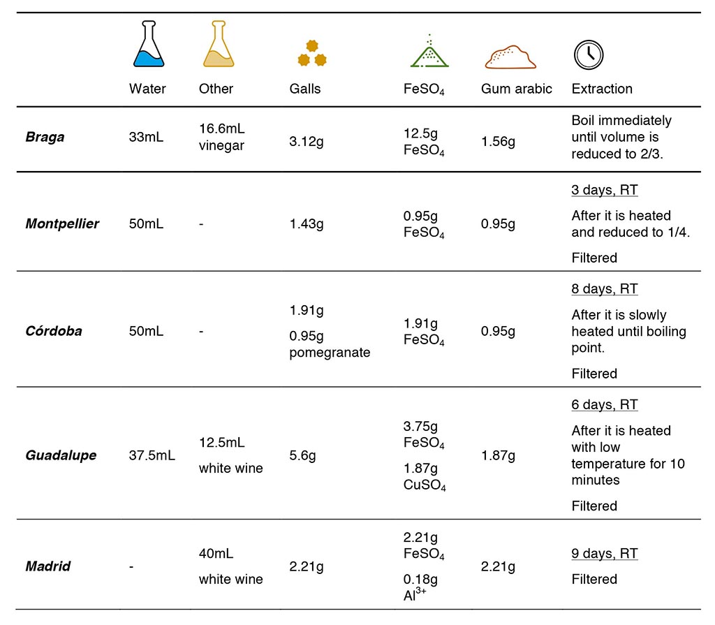 Ah da notare una cosa curiosa...la ricetta di Palatino differisce molto poco da quella presente nel Regolameno del Scriptorium nel Monastero de Ntra. Sra. de Guadalupe per le proporzioni di Galle:Solfato Fe:Gomma arabica (le proporzioni sono le medesime 1:0.6:0.3) l'unica differenza in quello del Guadalupe è l'utilizzo di vino bianco assieme all'acqua .