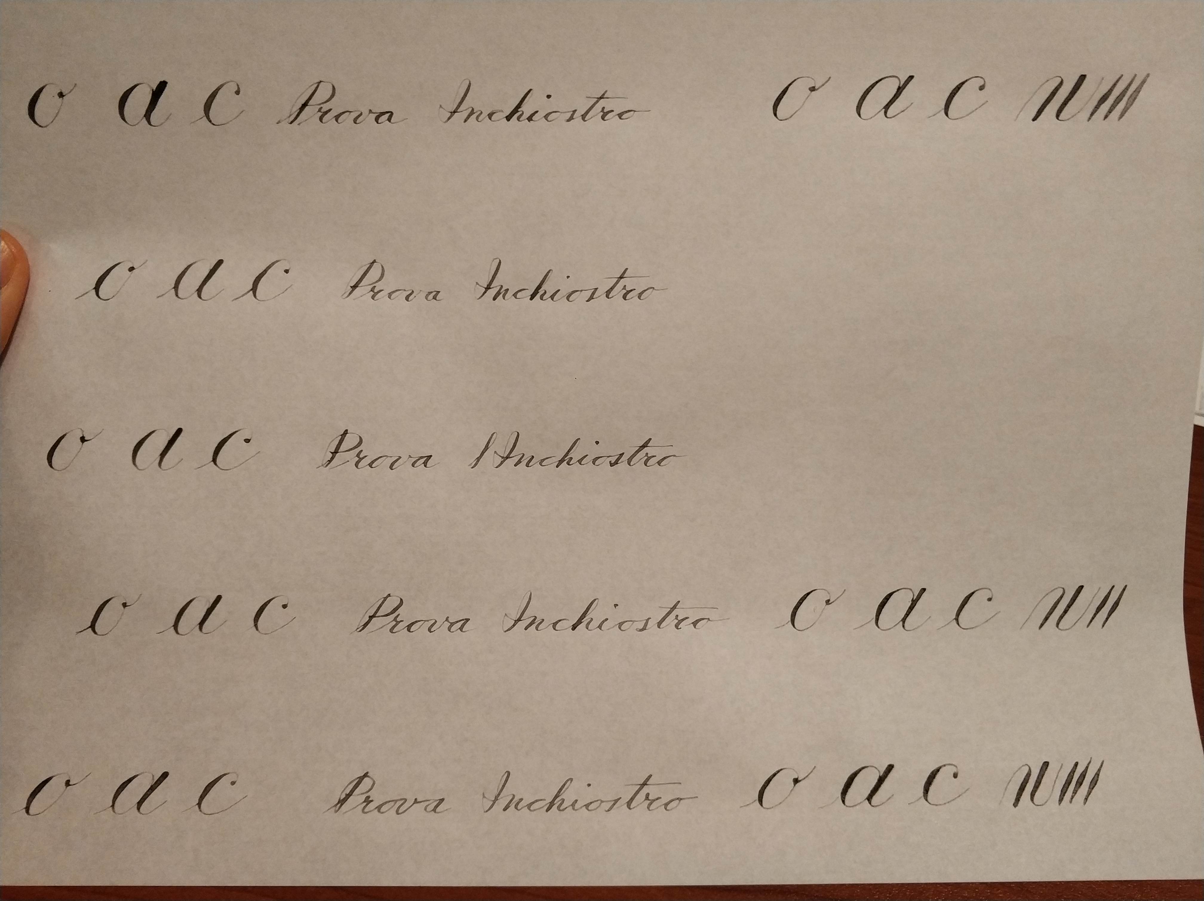 Questa sera ho provveduto alla bollitura dell'inchiostro ed all'aggiunta di 15 gr di gomma arabica in polvere (ho provveduto a scioglierla con un po di inchiostro caldo prima di immetterla nel resto del composto). Di seguito una prova con l'inchiostro appena fatto (ed ancora un po caldo :)) la parte scritta a sinistra è stata fatta con un pennino manuscript leonardt e quella a destra con nikko g cannuccia dritta. (ho fatto solo 1 lezione del corso di corsivo inglese e sto ancora provando ad usare i pennini per fare le 3 lettere che ci hanno mostrato o, a, c)