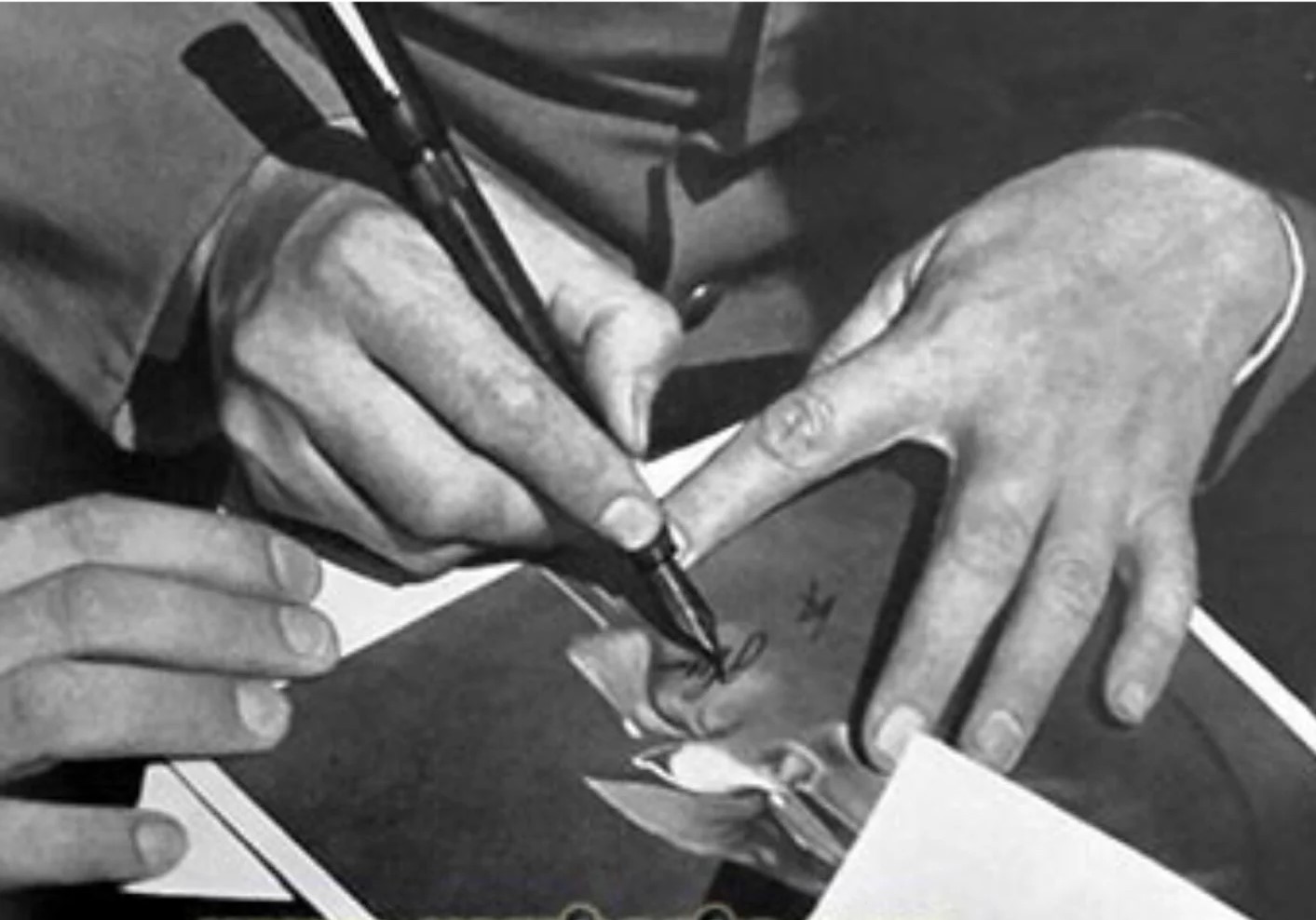 In rete ho trovato una foto che verosimilmente ritrae le mani di Hitler che autografa una sua foto. Non mi sento però di giurare sulla sua autenticità: