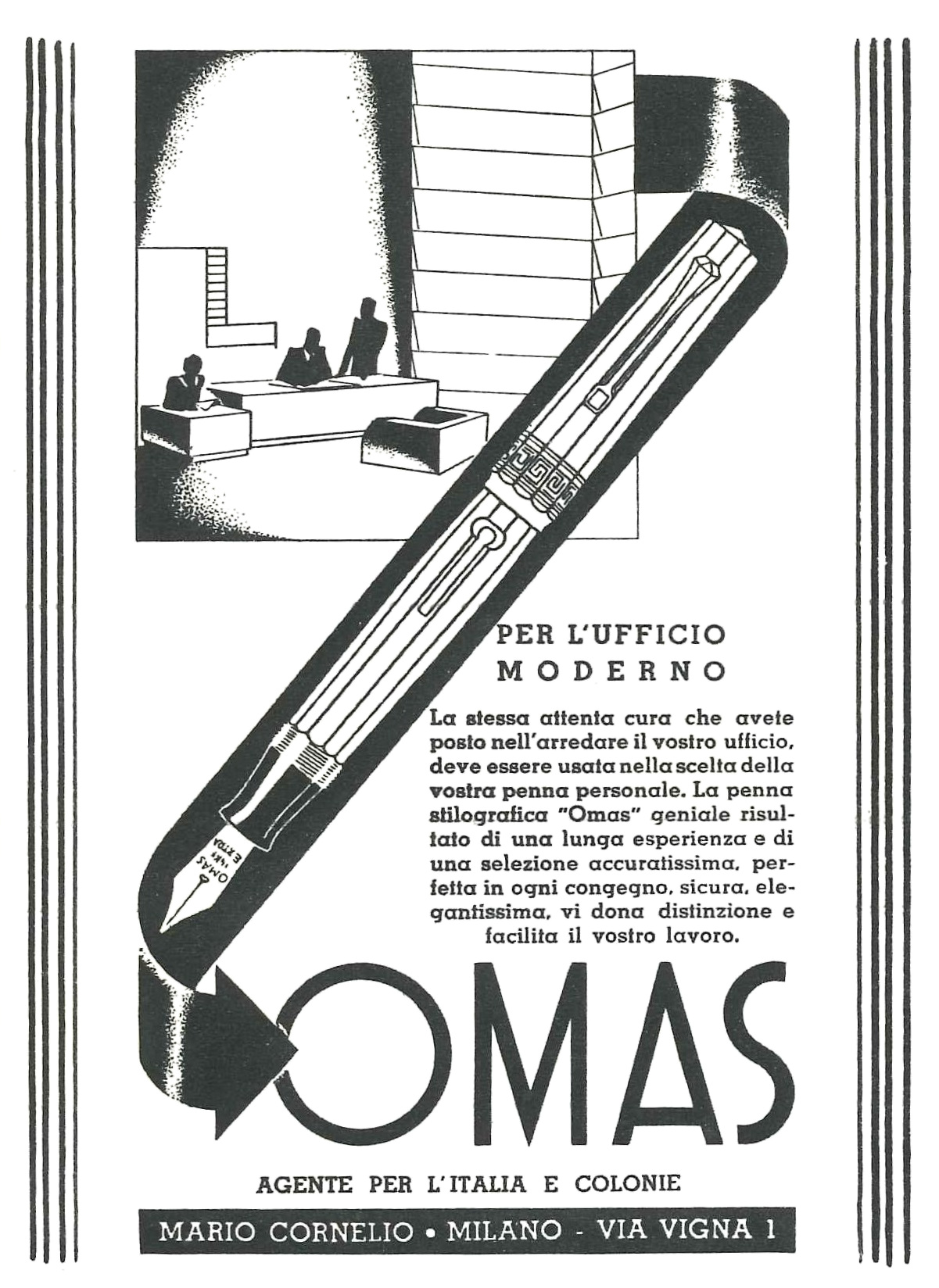 Le Omas Extra a leva (con greca e poi 3 anellini, sfaccettate poi anche lisce) in ogni caso sono sempre raffigurate nelle pubblicità con l'allineamento "dorsale", come tutte le penne a levetta che abbiamo preso in considerazione...