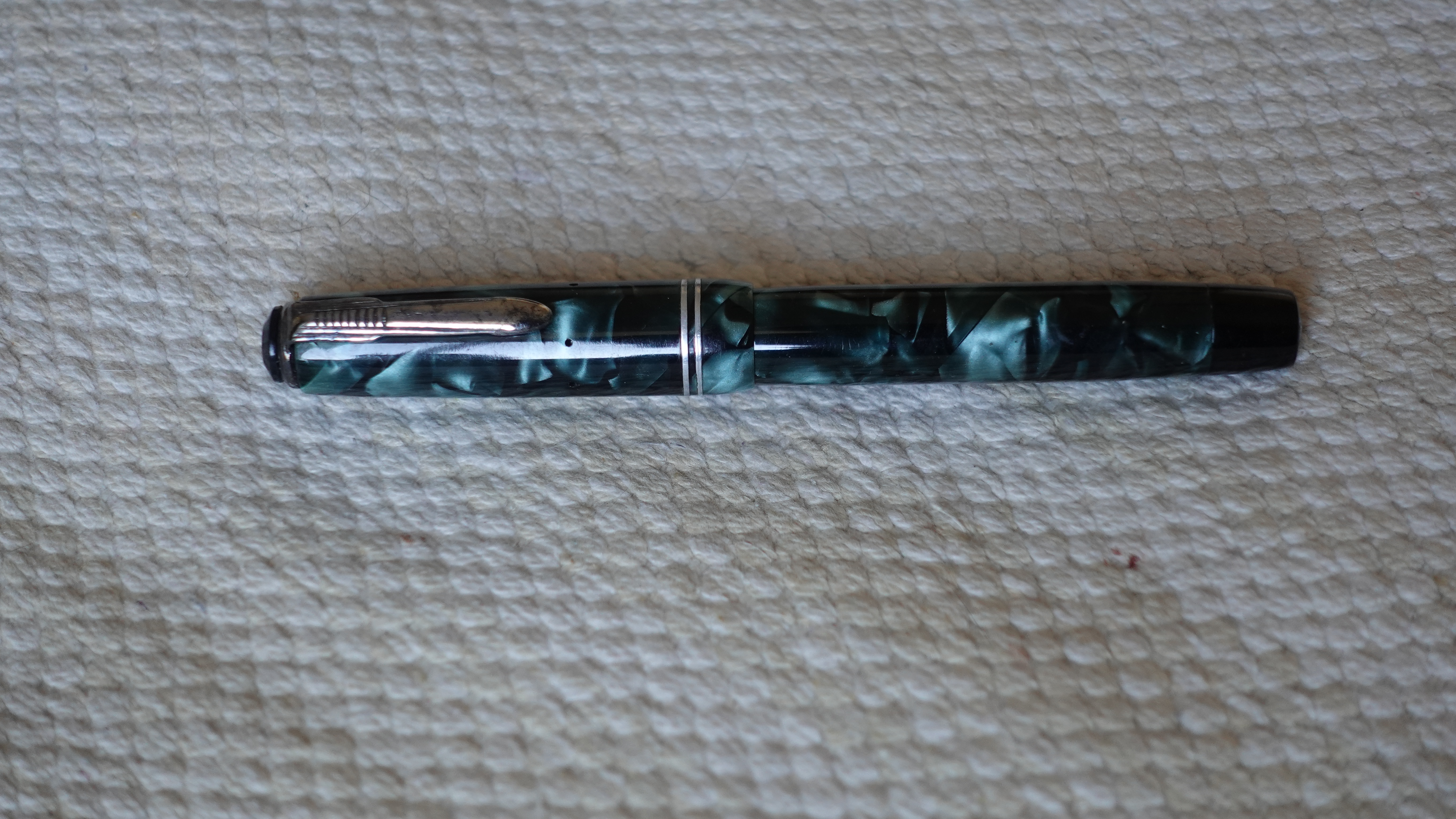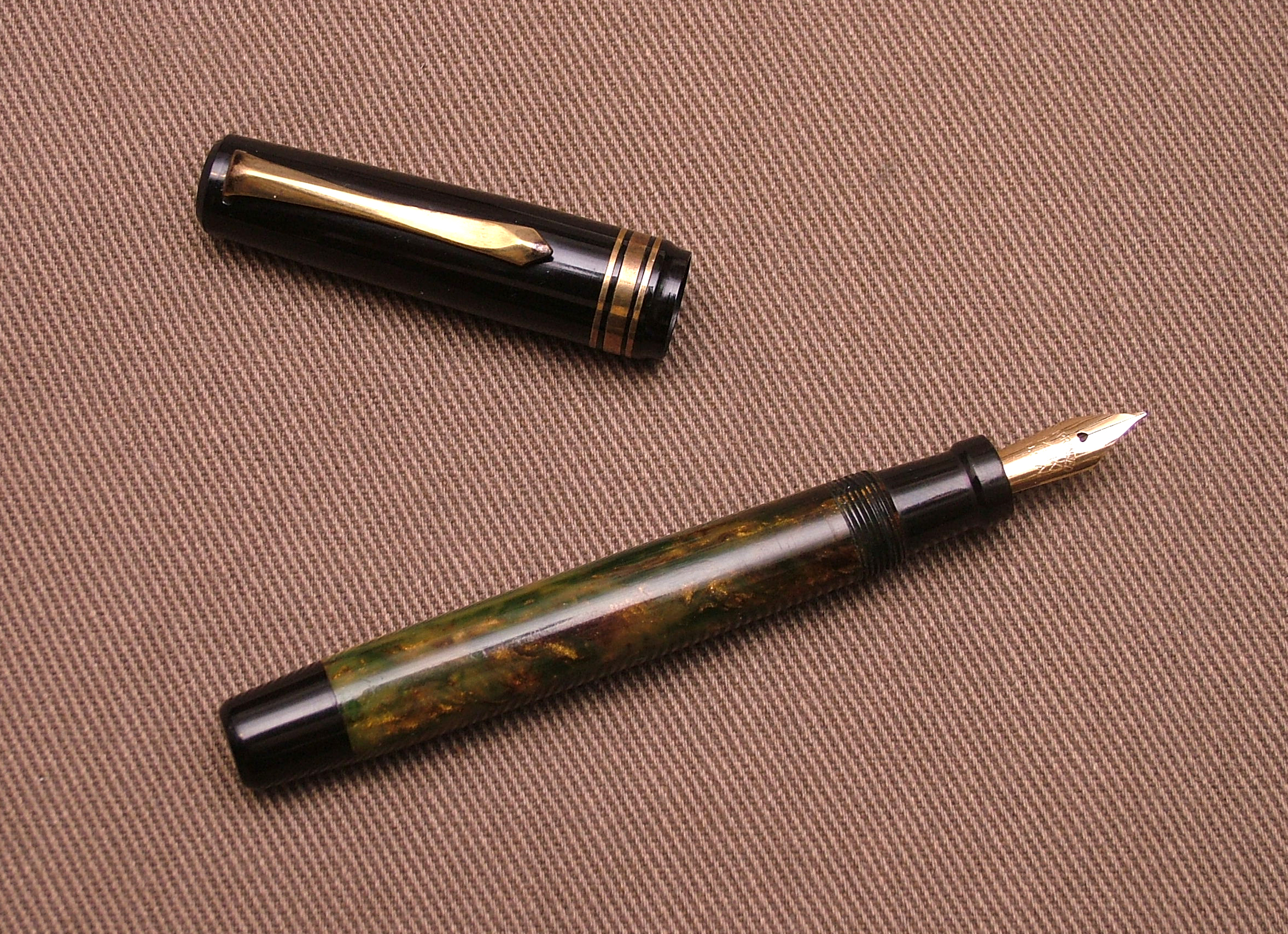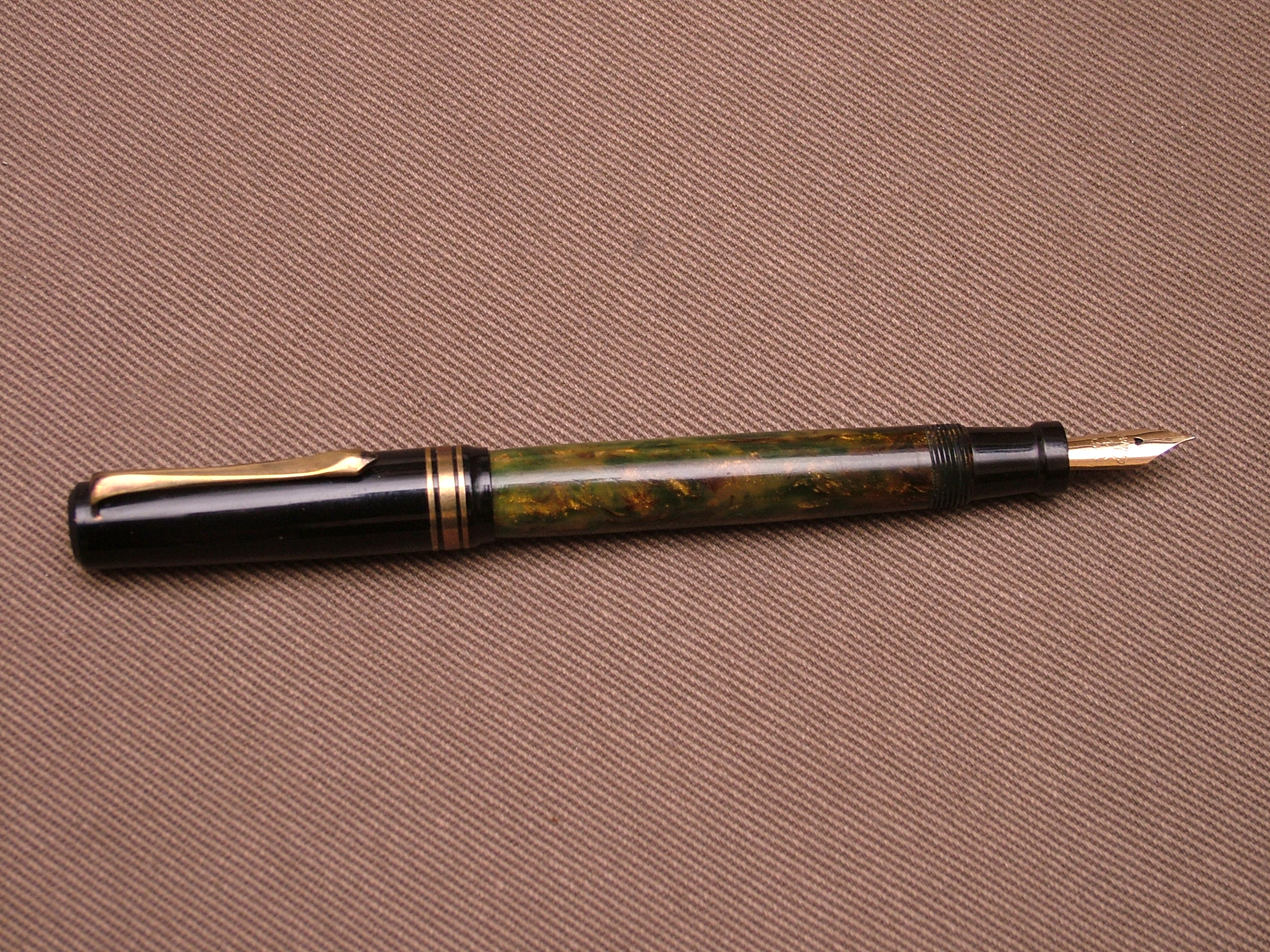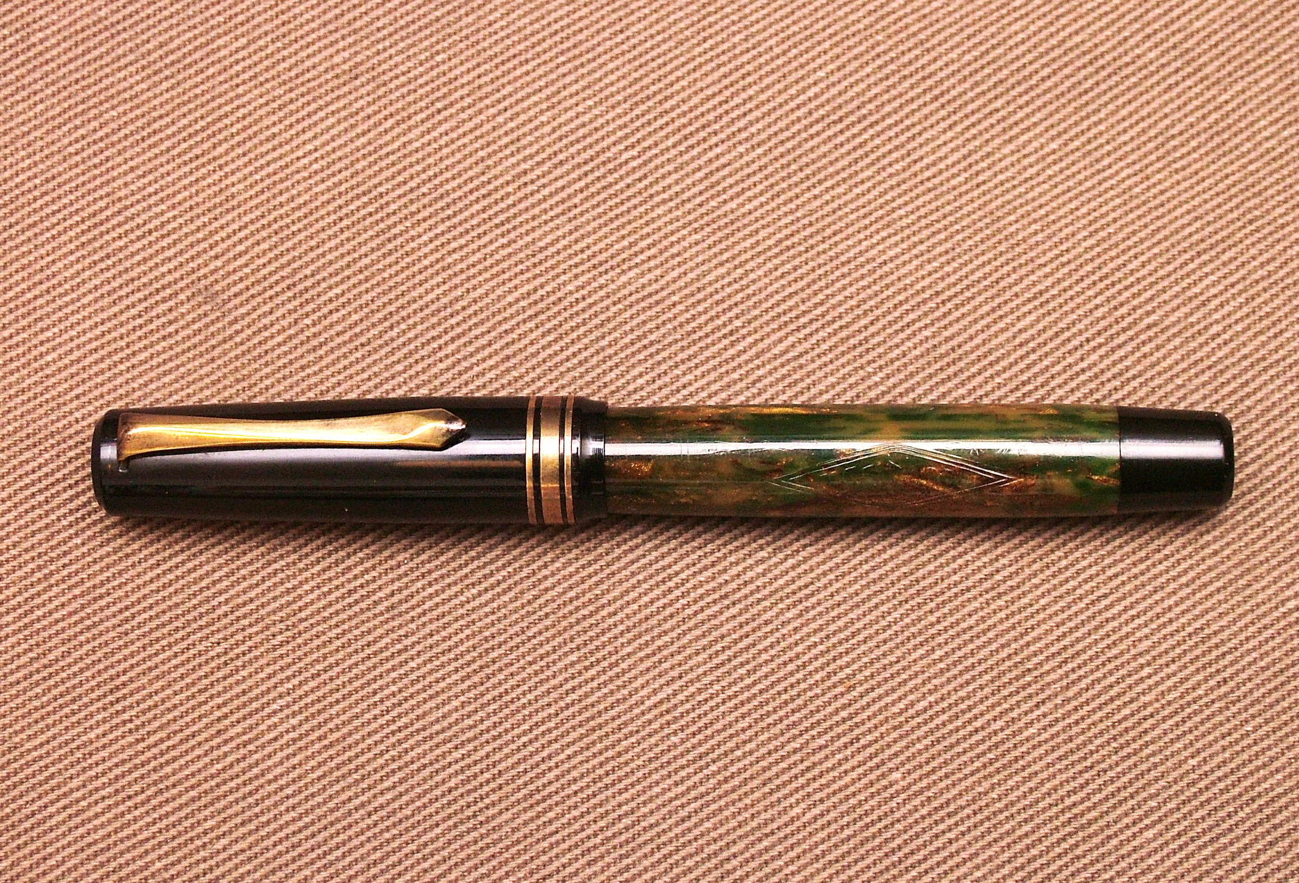 La celluloide del fusto è di un verde marmorizzato con riflessi oro.