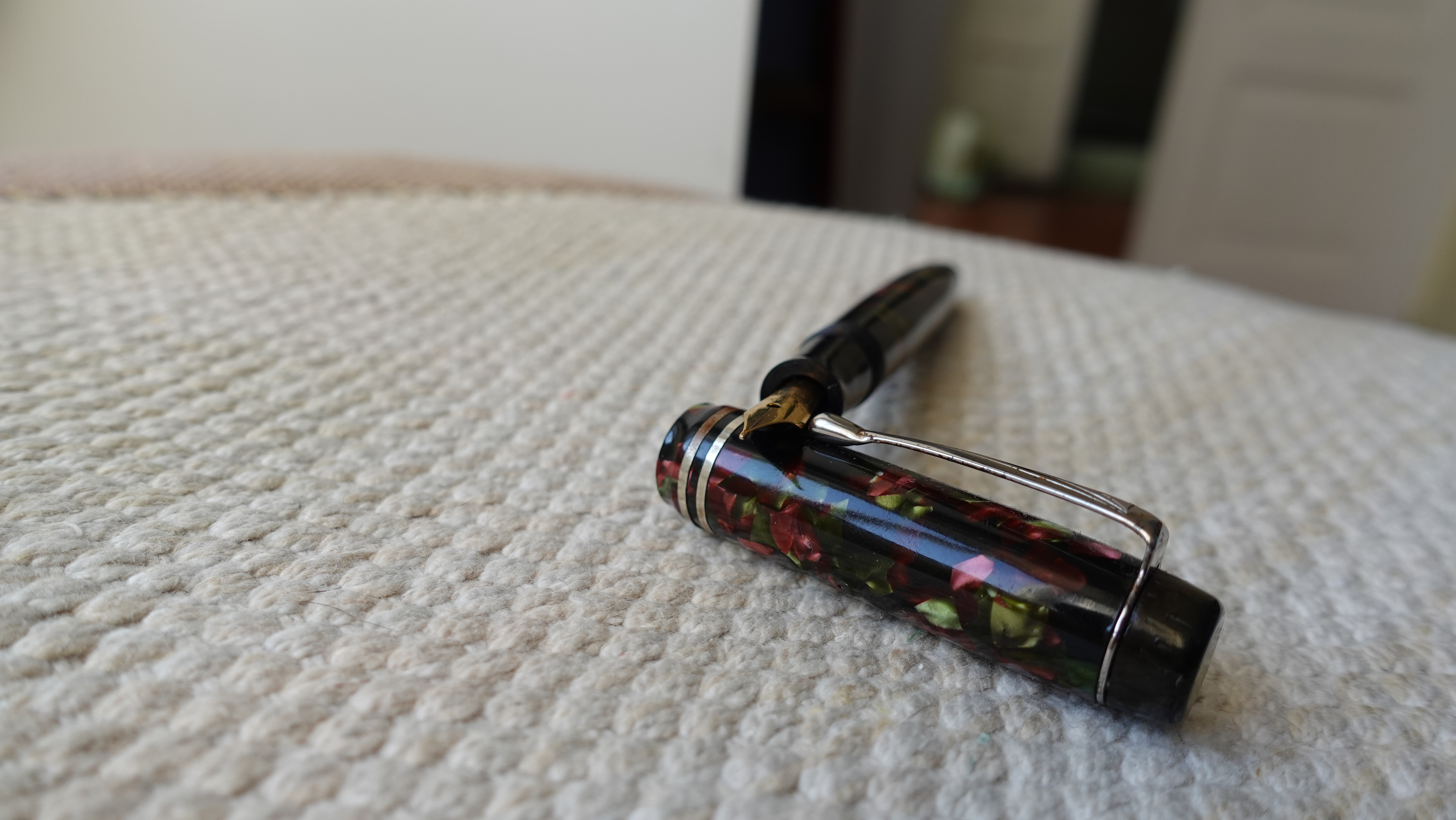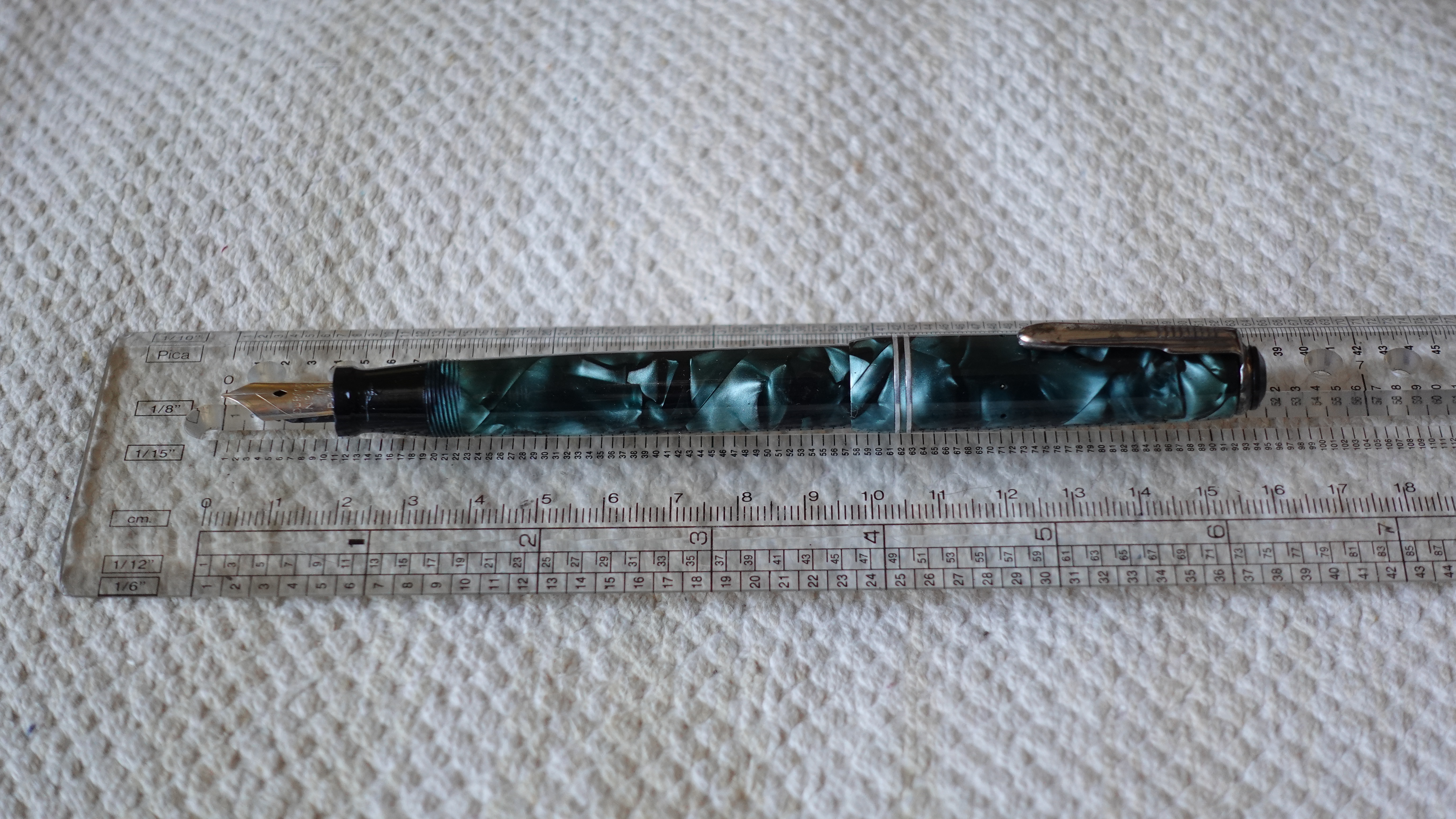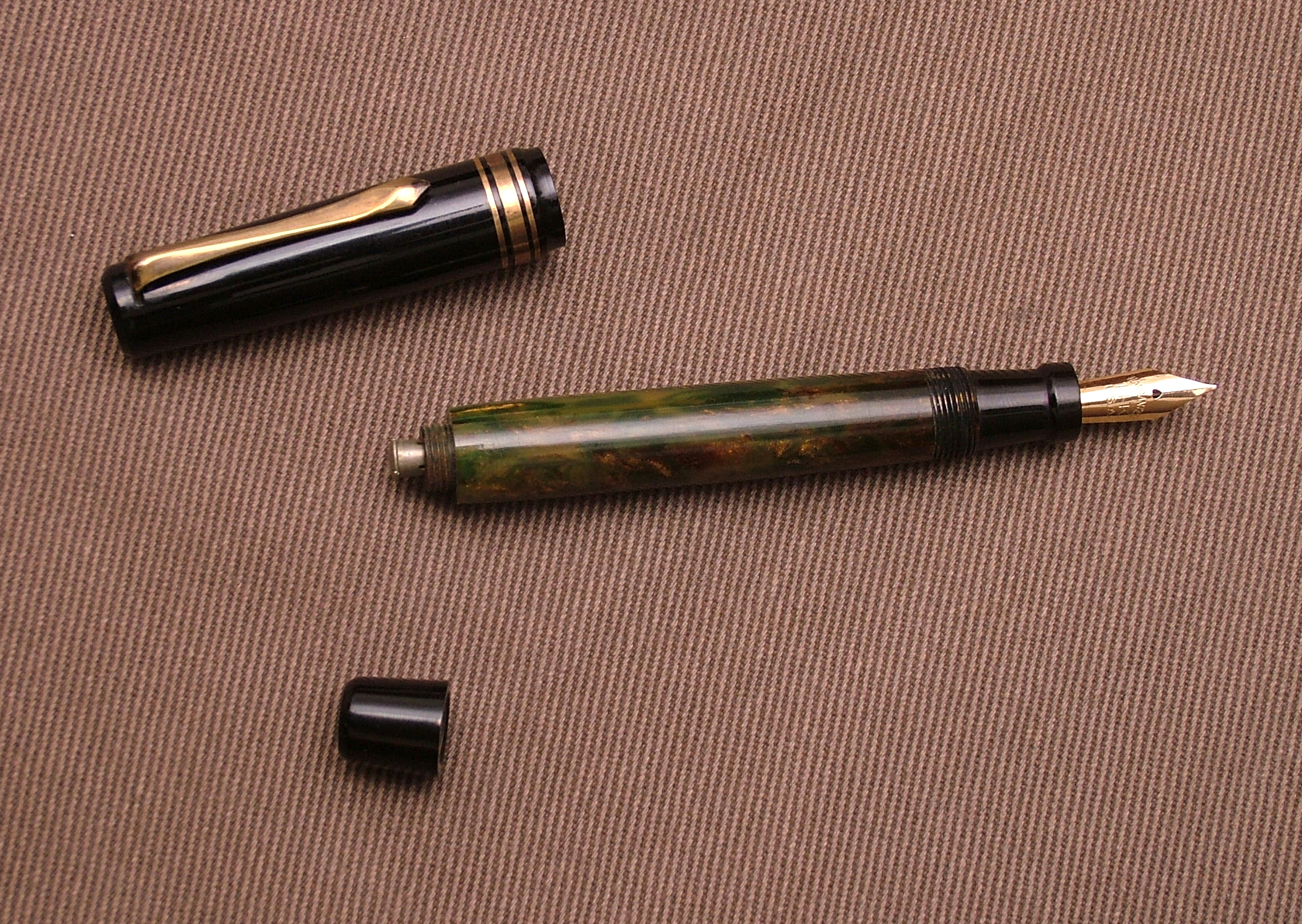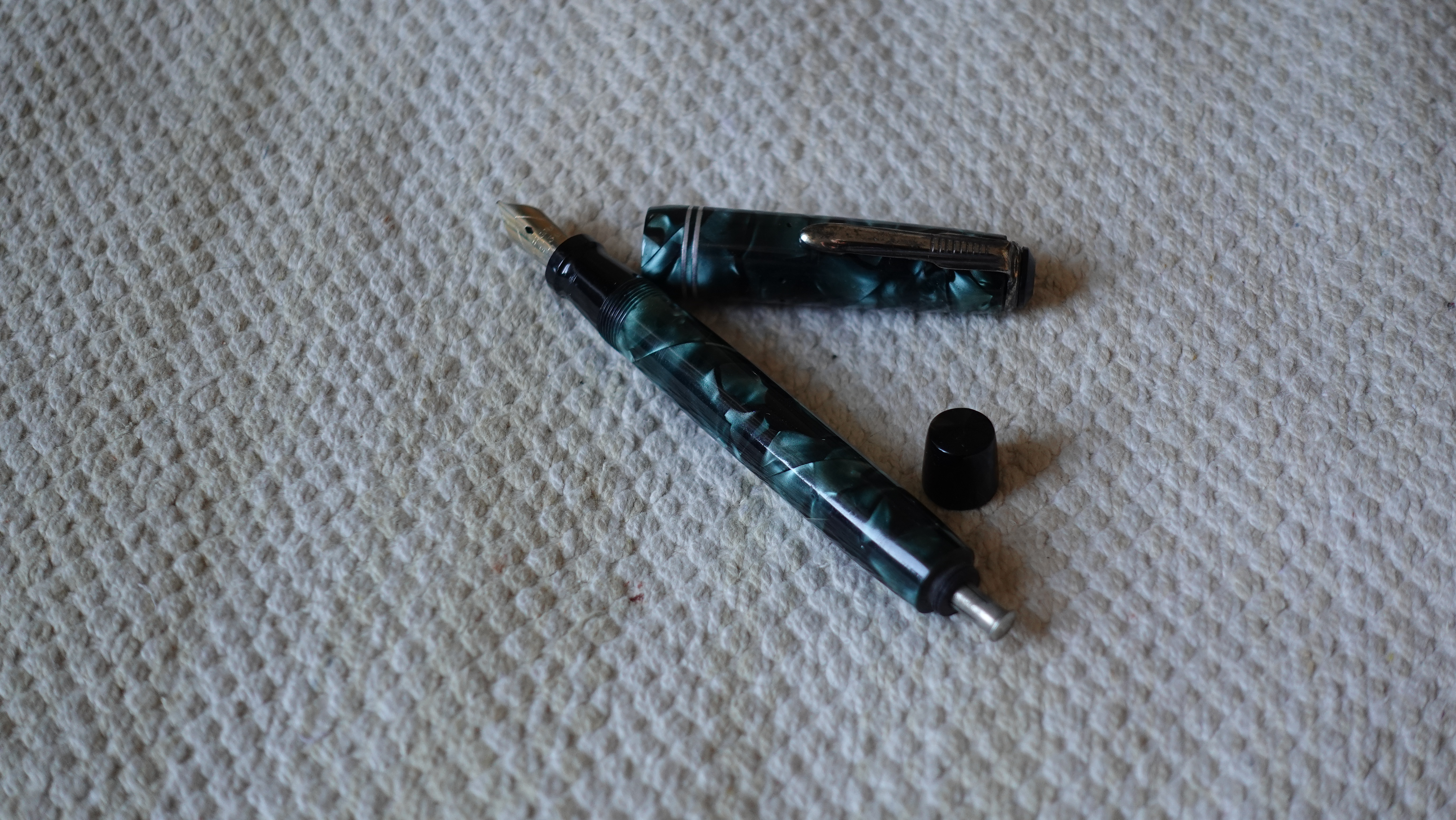 La celluloide del fusto è di un verde marmorizzato con riflessi oro.