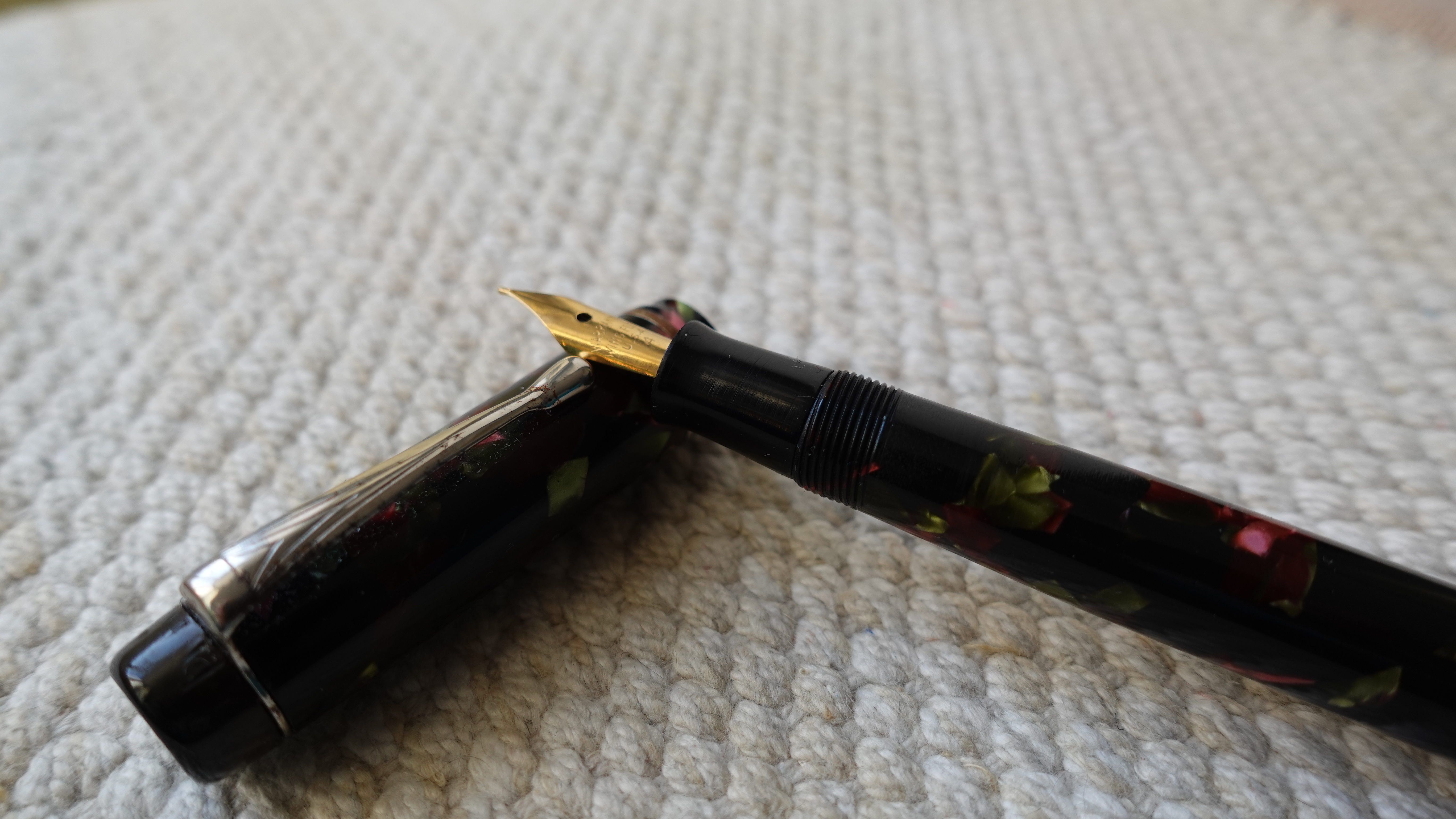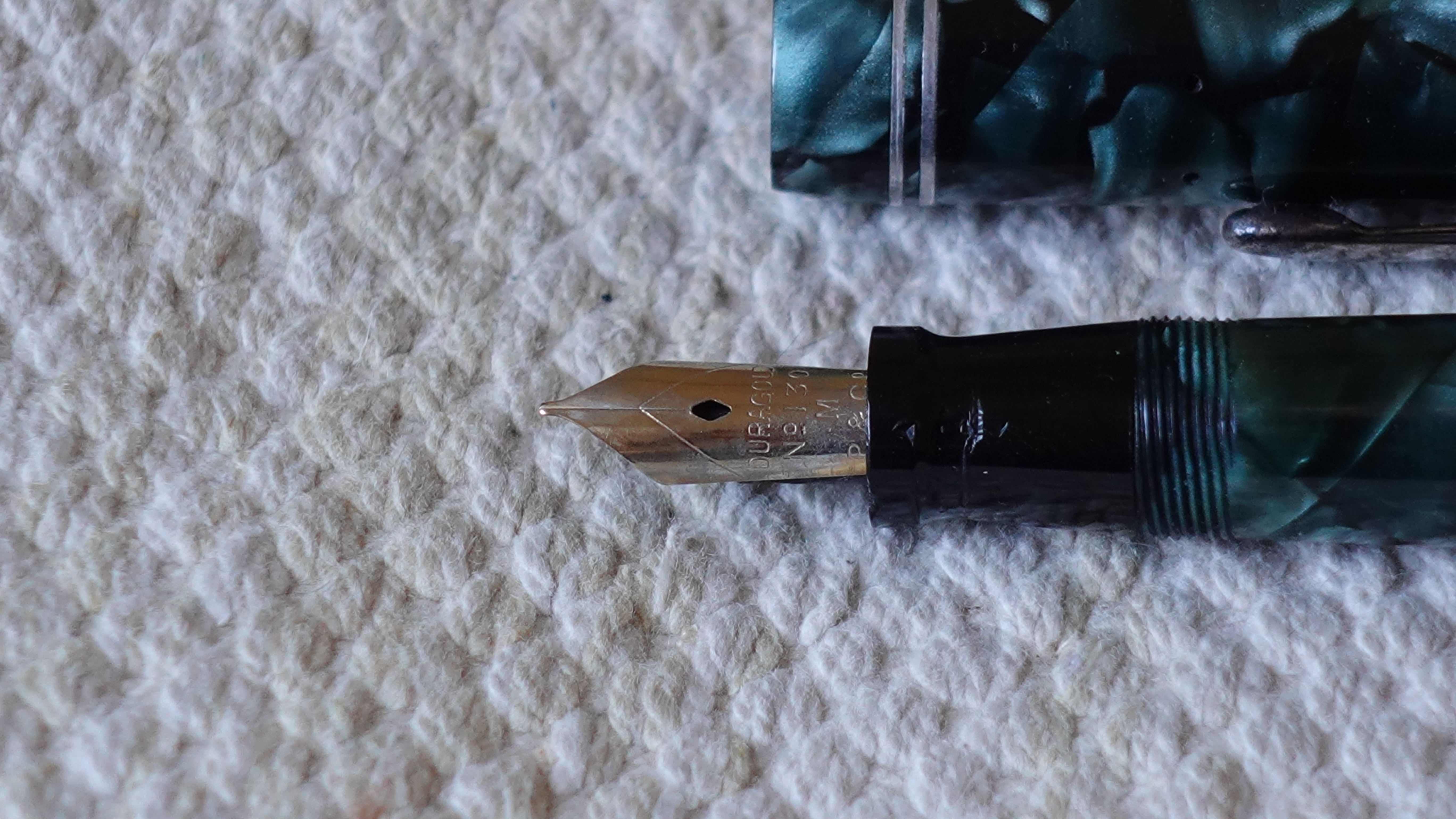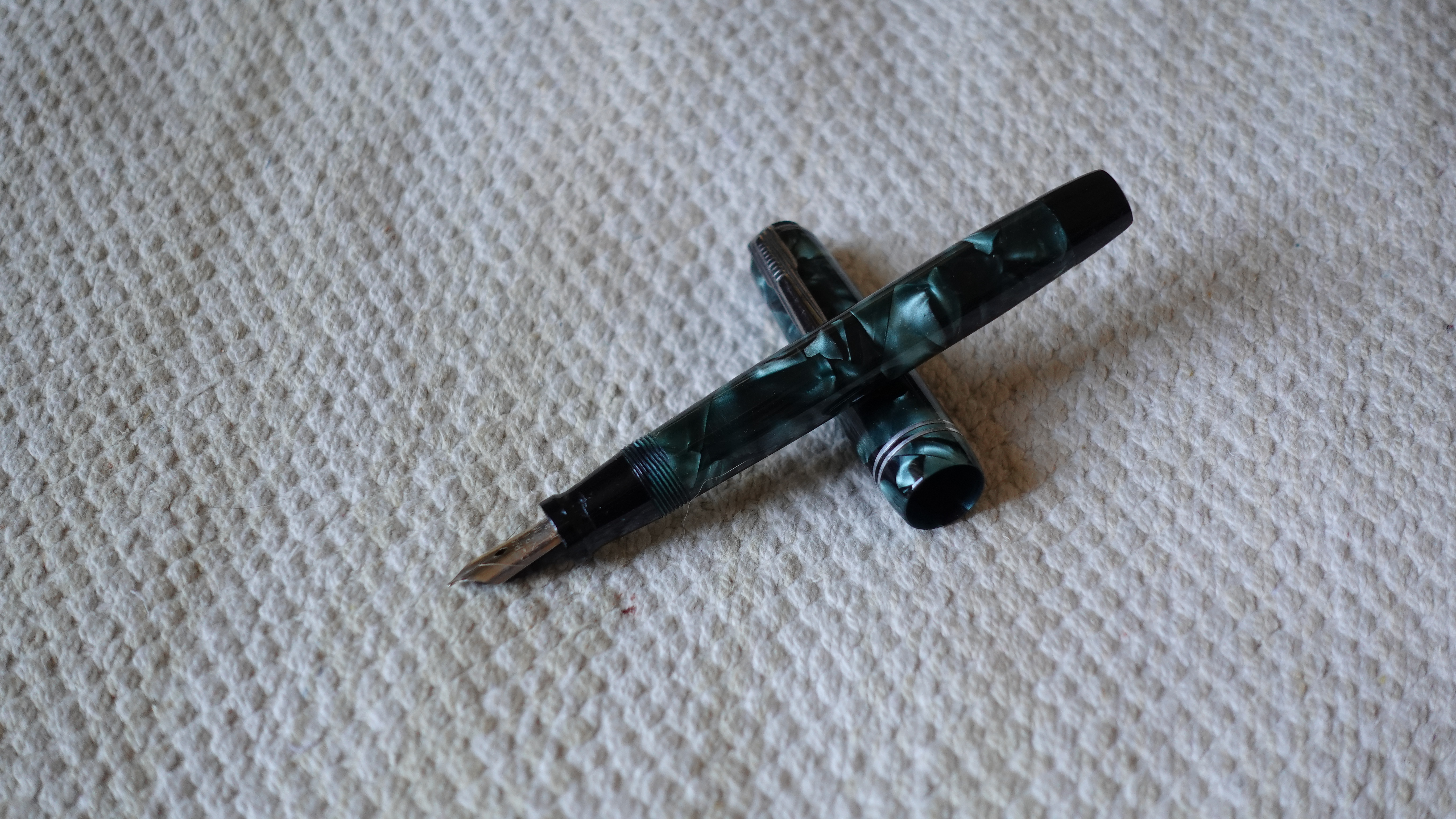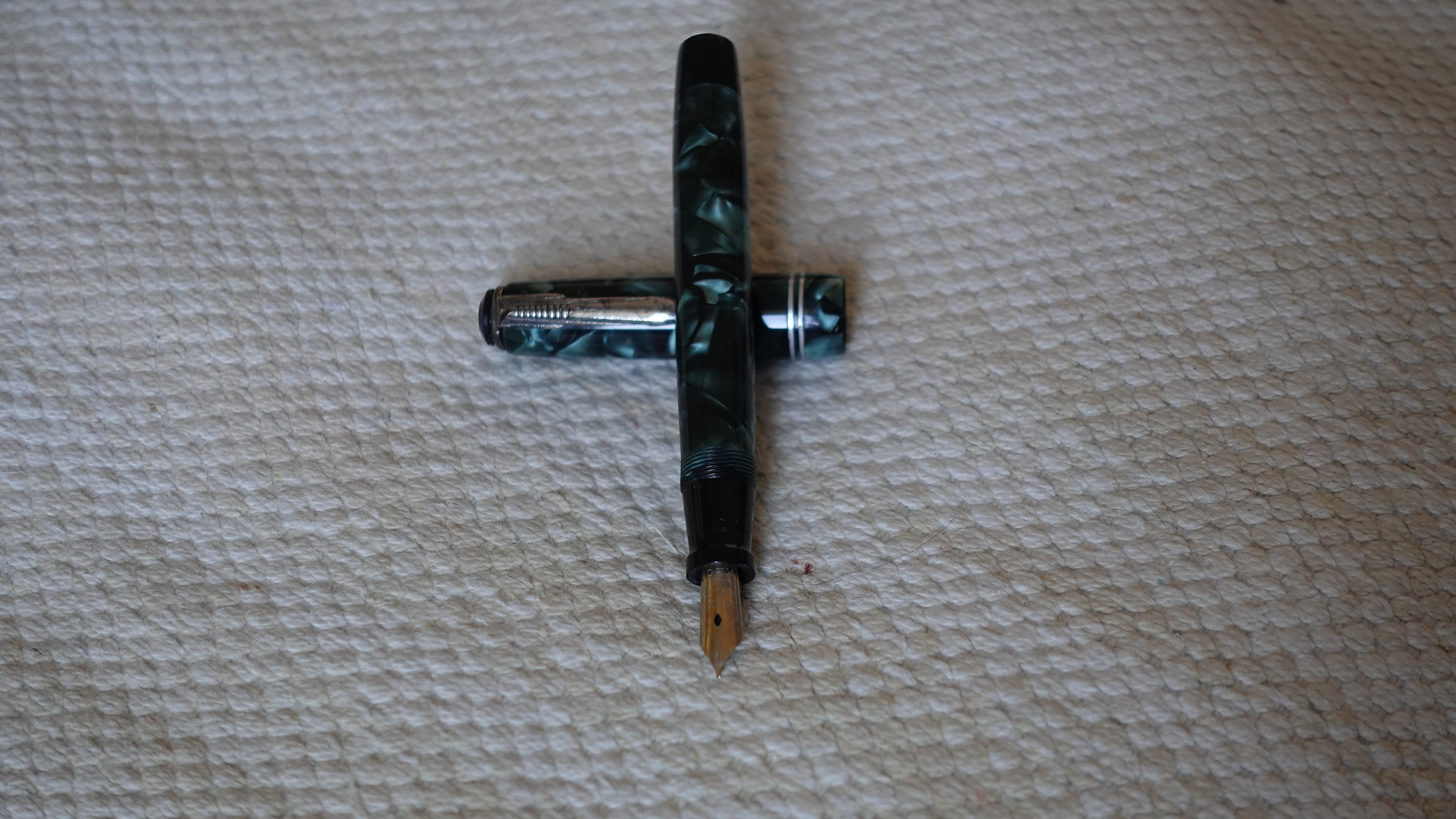 La celluloide del fusto è di un verde marmorizzato con riflessi oro.