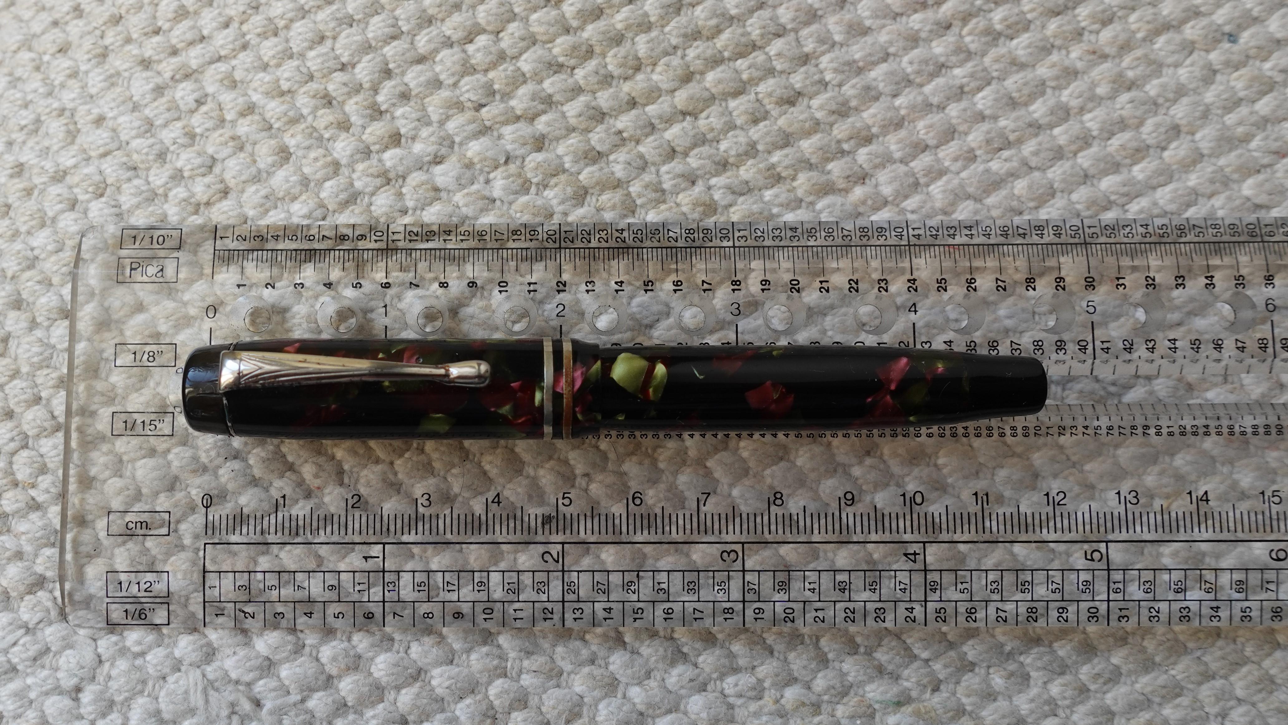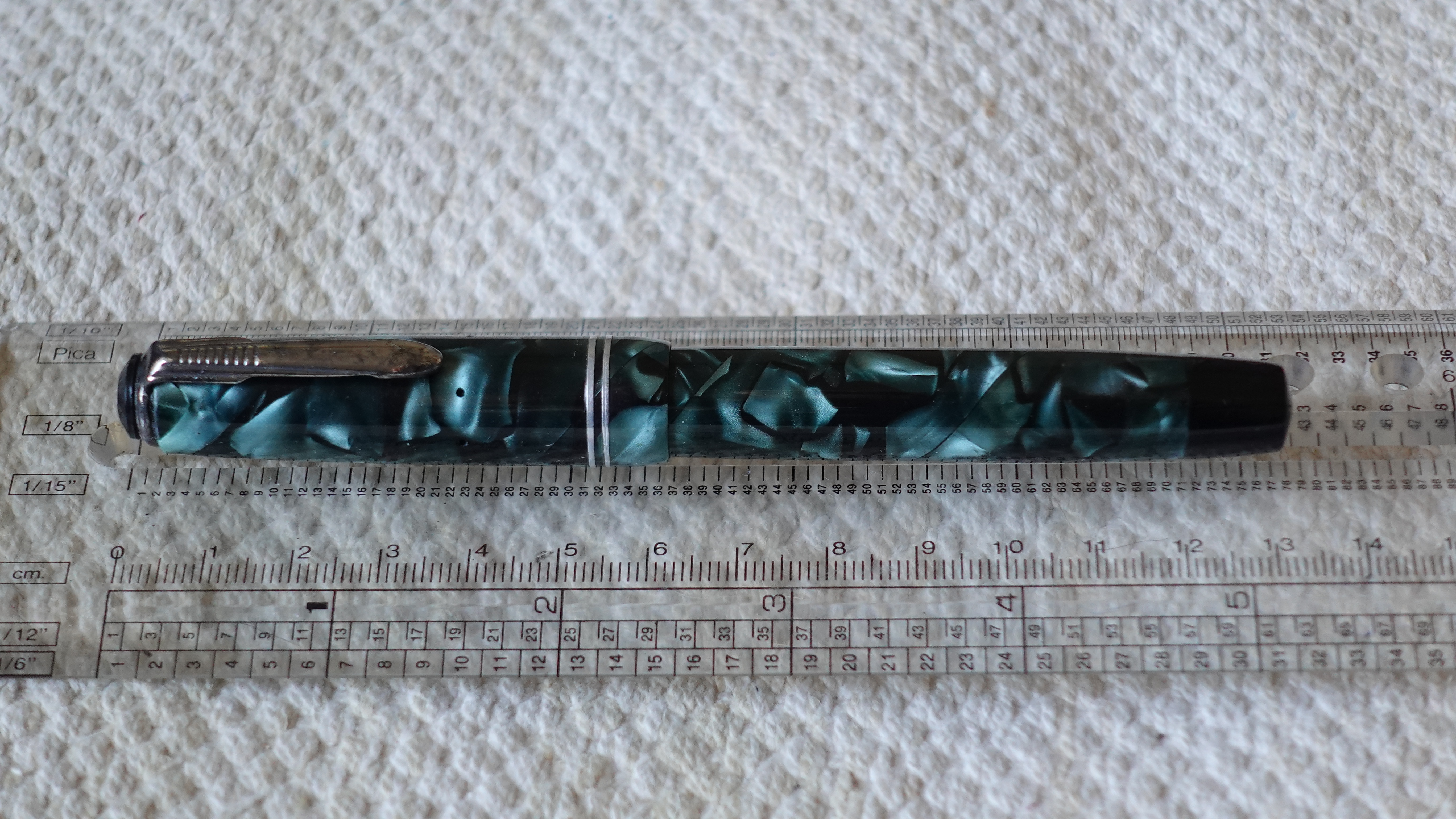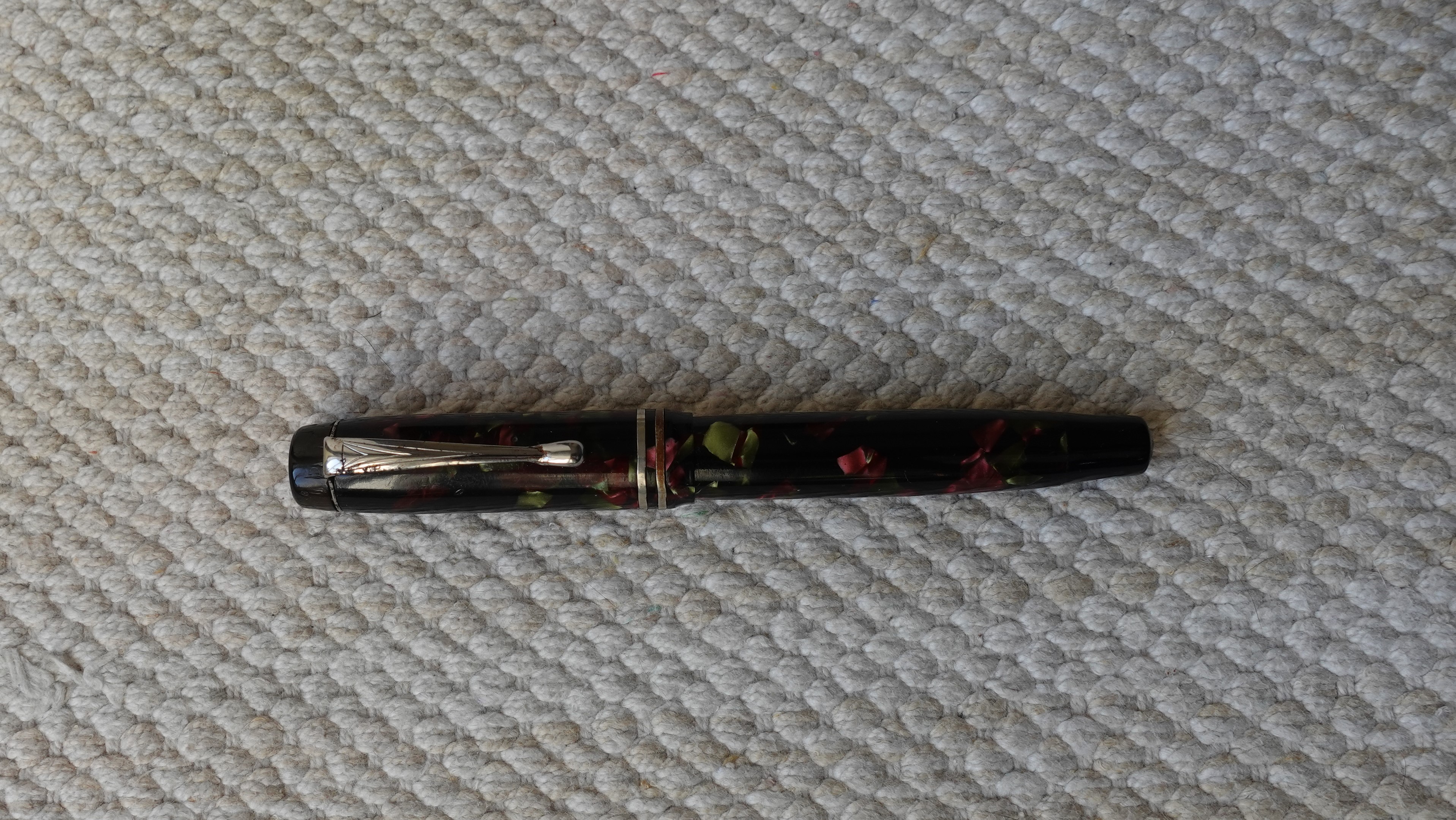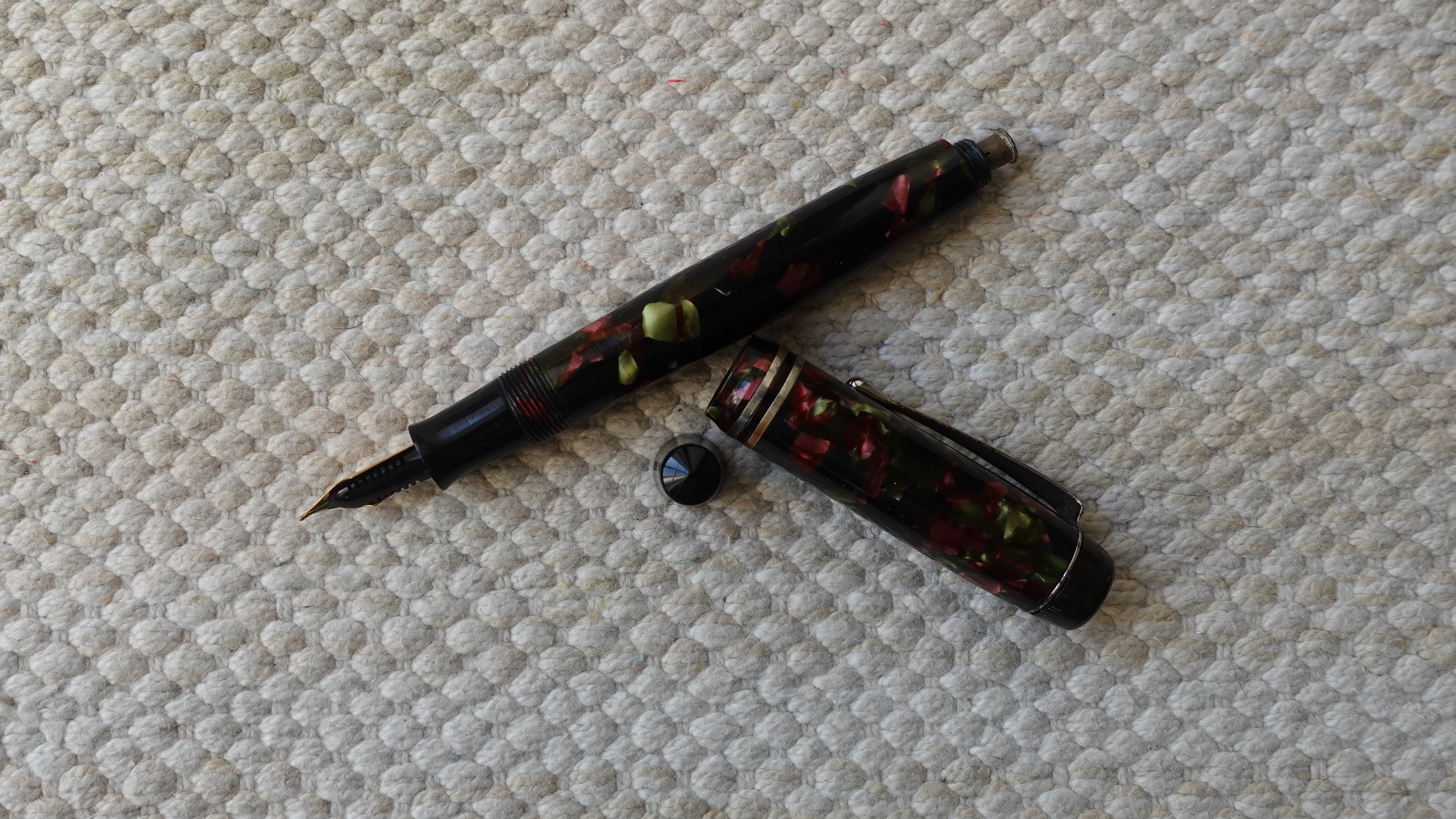 La celluloide del fusto è di un verde marmorizzato con riflessi oro.
