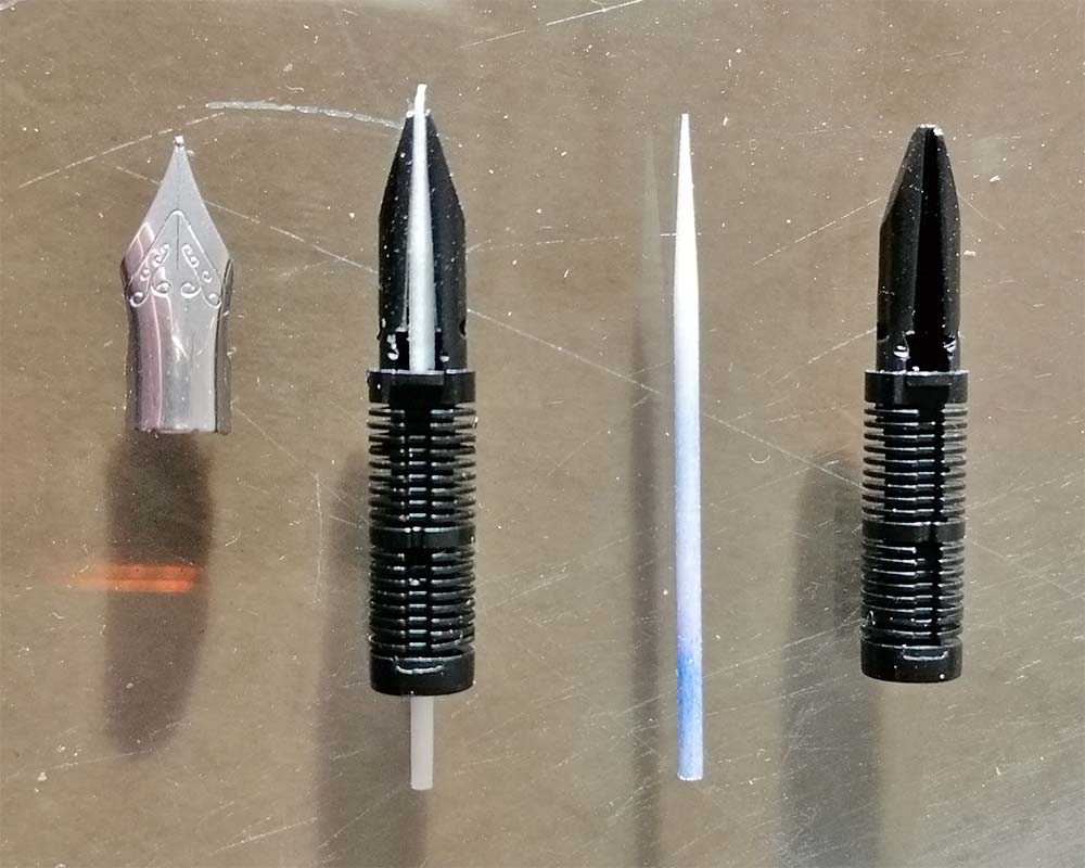 Dato che molti, come Siberia qui sopra, testimoniano che il sistema dovrebbe funzionare, ho pensato di smanettare un po', e ho scoperto che facendo avanzare lo stoppino di un nulla (basta mezzo millimetro) in direzione della punta del pennino, il flusso aumenta di molto e si stabilizza, perché è in grado di stare dietro alle richieste del pennino stesso.