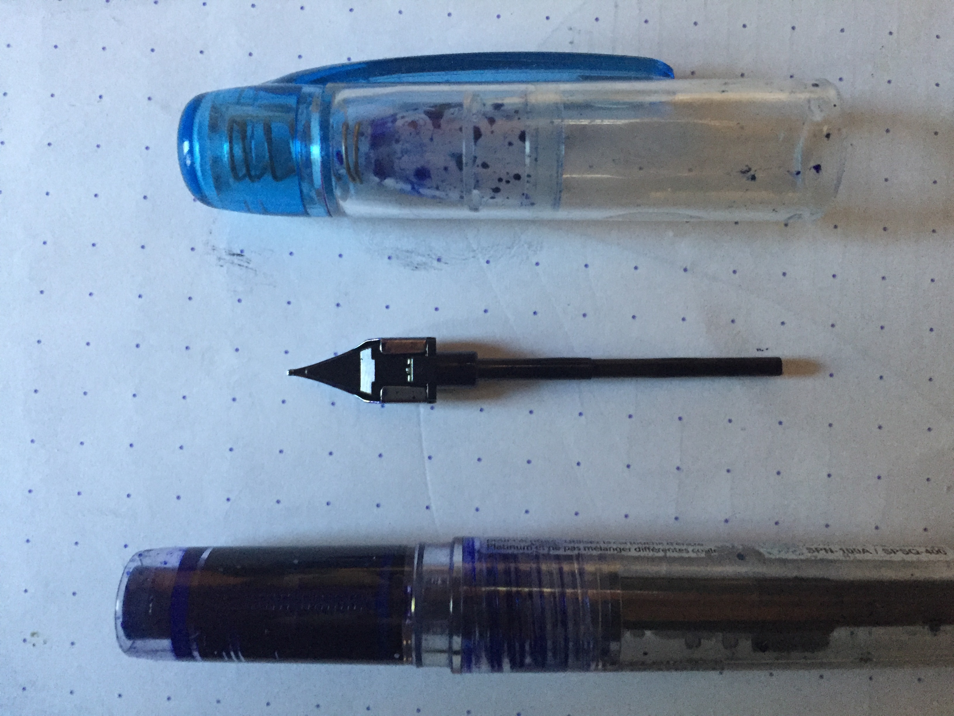 La penna di Monet63 si basa su uno stoppino che funziona un po' come per i trattopen, mentre la Carioca non ha uno stoppino ma uno spillo plastico, qualcosa di analogo a quello delle Platinum anche se non uguale. Perciò il funzionamento buono o meno della Carioca è più stabile nel tempo, quanto meno perché non c'è lo stoppino che via via si impregnerà sempre di più e non si riuscirà più a pulirlo totalmente.