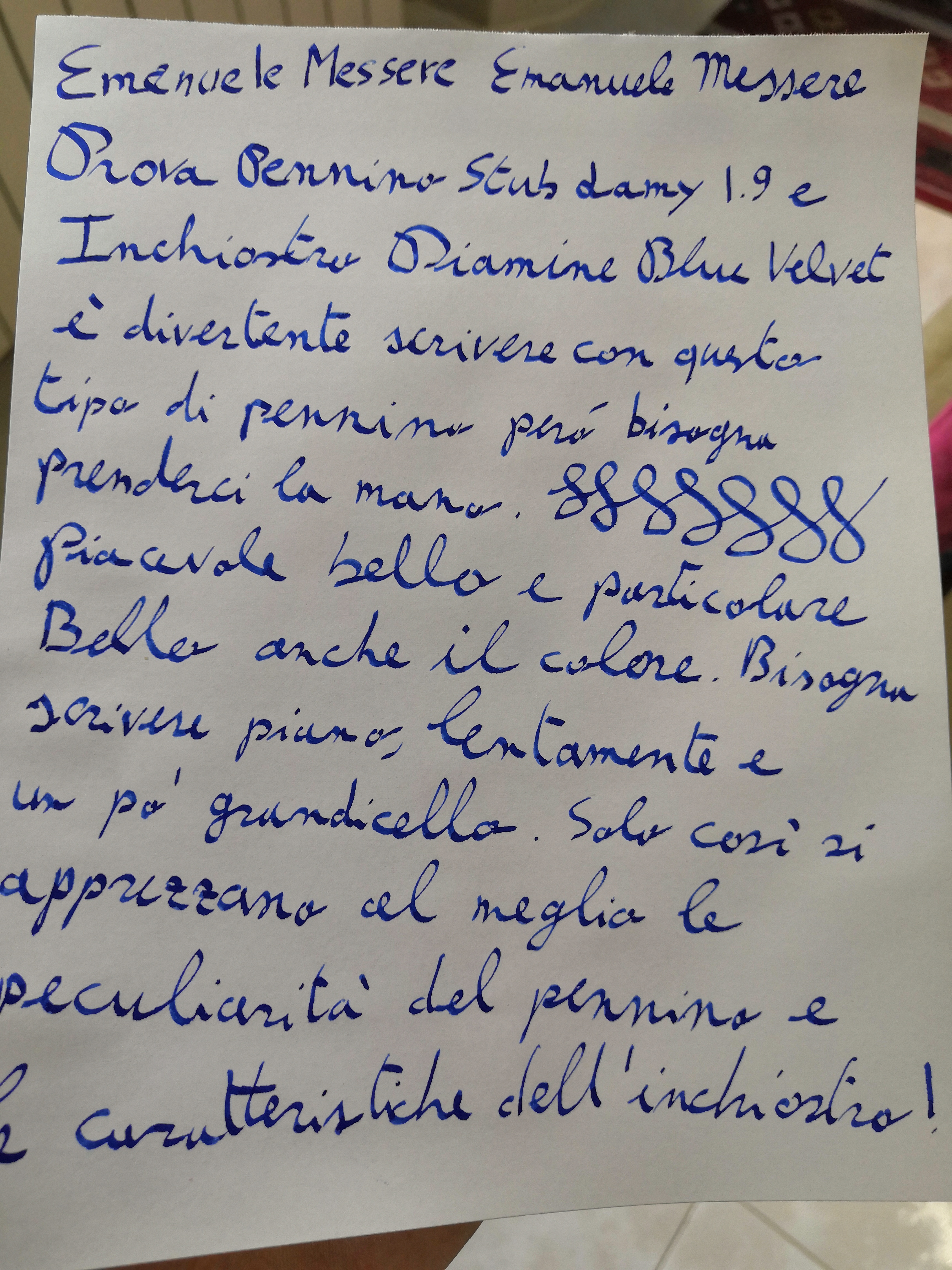 Spiller84 ha scritto: lunedì 4 gennaio 2021, 15:09 Per un blu che rimane blu, concordo con chi consiglia il blu velvet della Diamine. Al momento, è il mio blu preferito, fornisco un esempio.