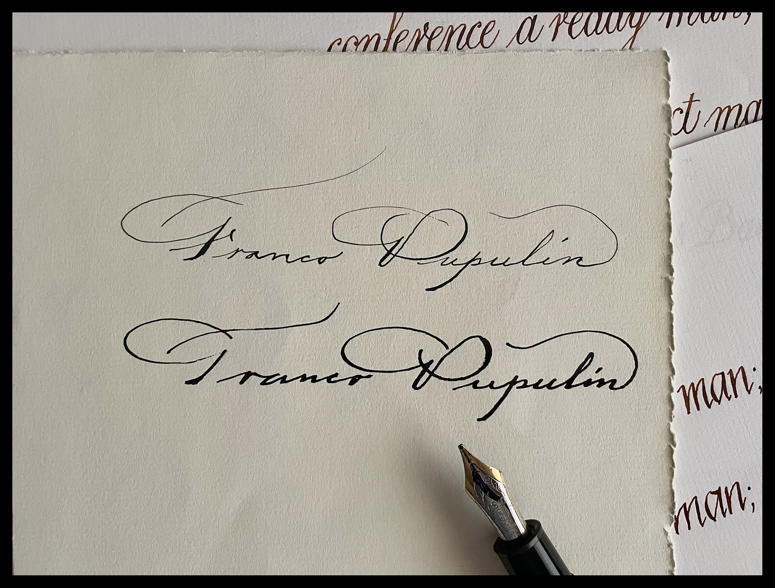In realtà il tratto non mi ha molto soddisfatto: come ho scritto nella non-recensione le differenze di tratto sono molto meno marcate che nella Lamy, tanto da farmi sembrare la Momento Magico più un broad che uno stub. Ho letto poi in vari interventi sul forum che il pennino Lamy è più italic che stub, e sto quindi continuando la mia ricerca, orientandomi ora verso un italic che – a quanto leggo – dovrebbe avere un tratto molto spigoloso, come lo cerco io, pur con una maggiore difficoltà di ductus.
