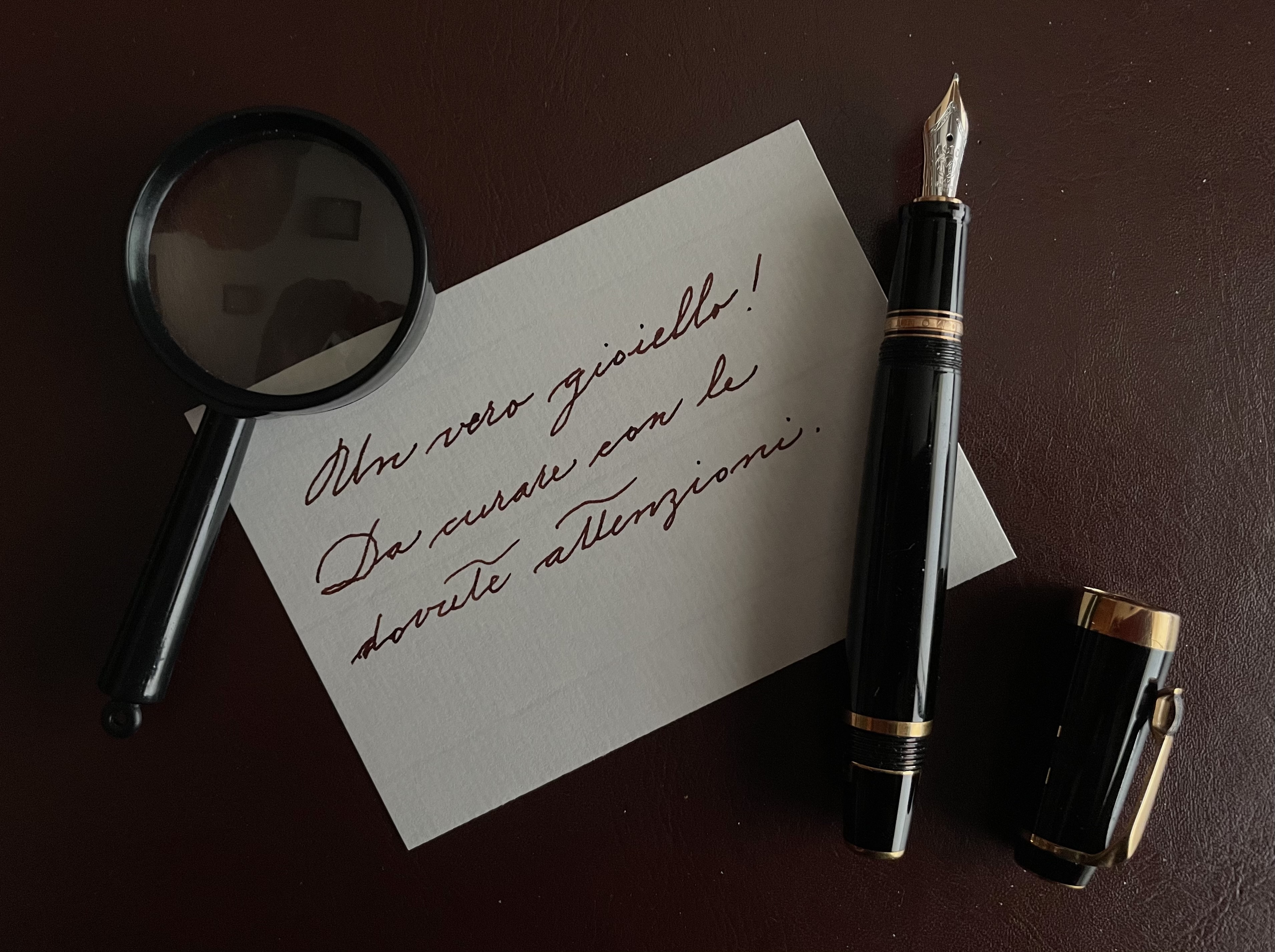 Ora, una nota di mantenimento di questa penna splendida. Il punto debole delle Bohéme è l’anello metallico che fuoriesce dal corpo insieme al pennino. Quando si risciacqua la penna per pulire bene il conduttore, è normale che un po’ d’acqua resti imprigionata in fondo al barilotto e, con il tempo, provochi la ossidazione della doratura sull’anellino. Montblanc lo sostituisce su richiesta, ma è una cosa un po’ costosa.