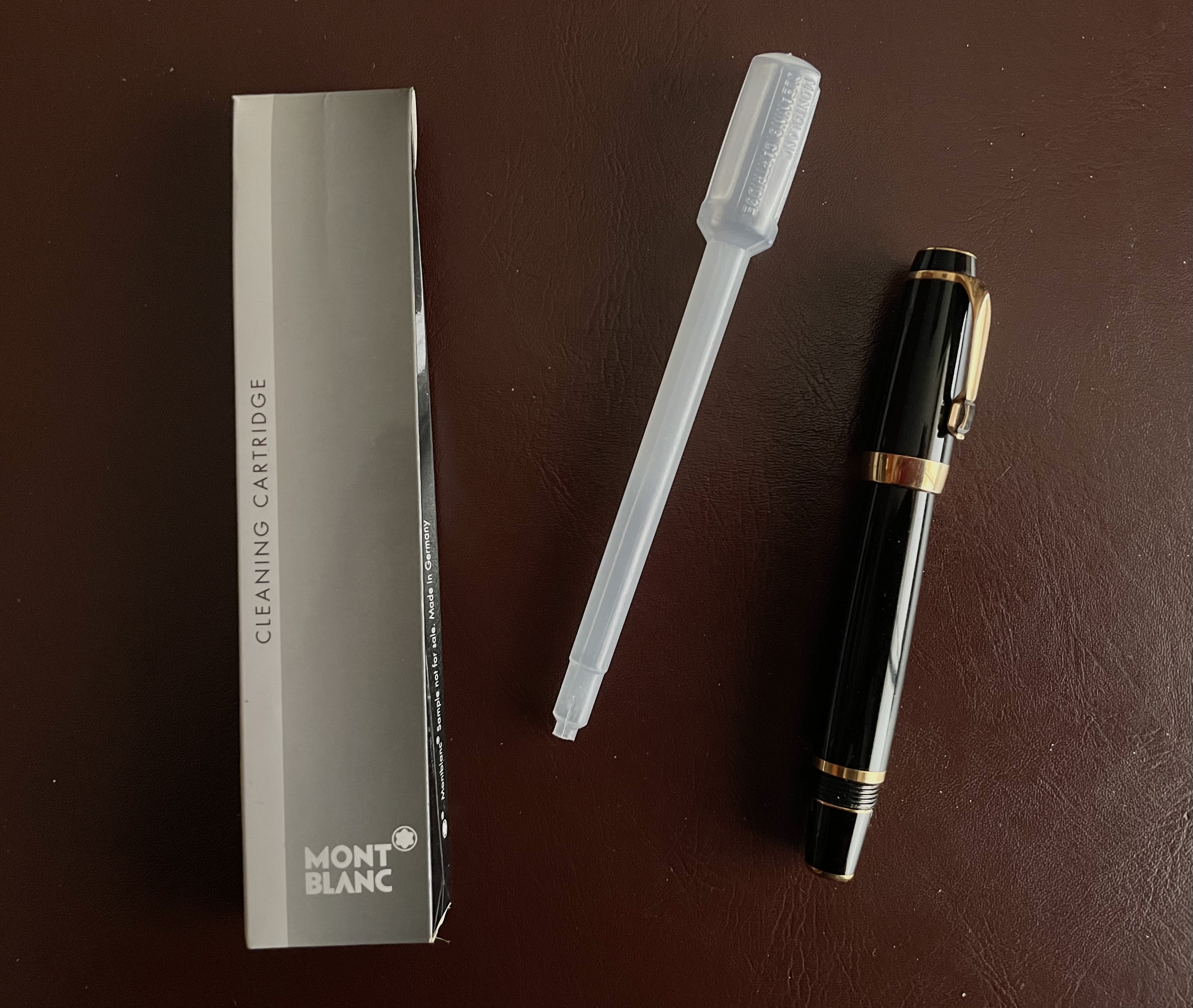 C’è però una valida alternativa nel “protocollo di manutenzione”: acquistare un’apposita cleaning cartridge da Montblanc. Questa si riempie con acqua, si inserisce nel barilotto come una cartuccia, e permette di espellere l’acqua (e i residui di inchiostro) a pressione dal conduttore senza inzuppare il fondo del barilotto e preservando l’anellino. La “pompetta” è riutilizzabile decine di volte.
