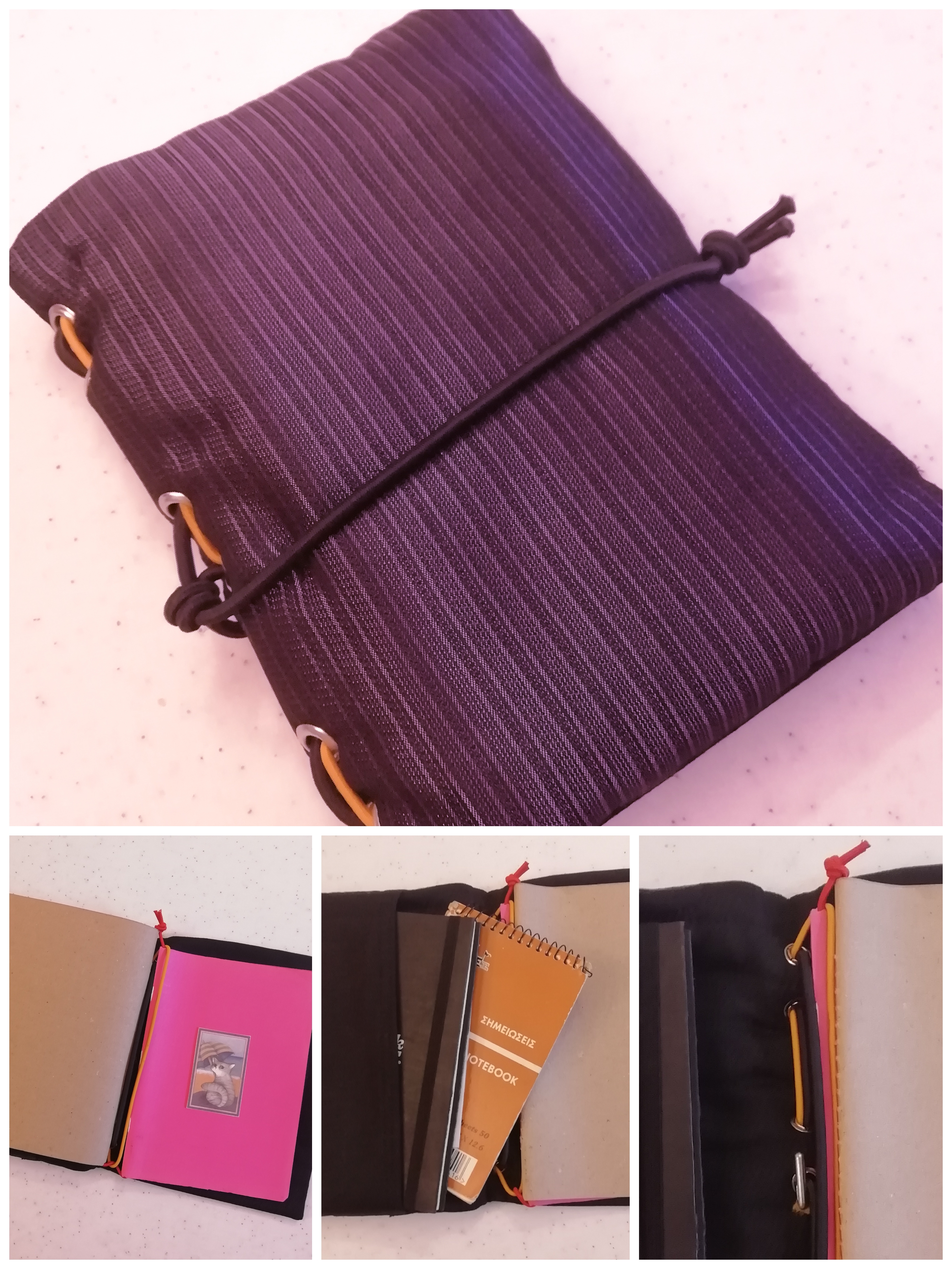 Un amico mi aveva dato uno scampolo di pelle da cui ho ricavato il raccoglitore. Gli elastici sono in vendita nelle mercerie, come "plus" siccome ho una occhiellatrice, ho inserito degli occhielli metallici per far passare gli elastici.
