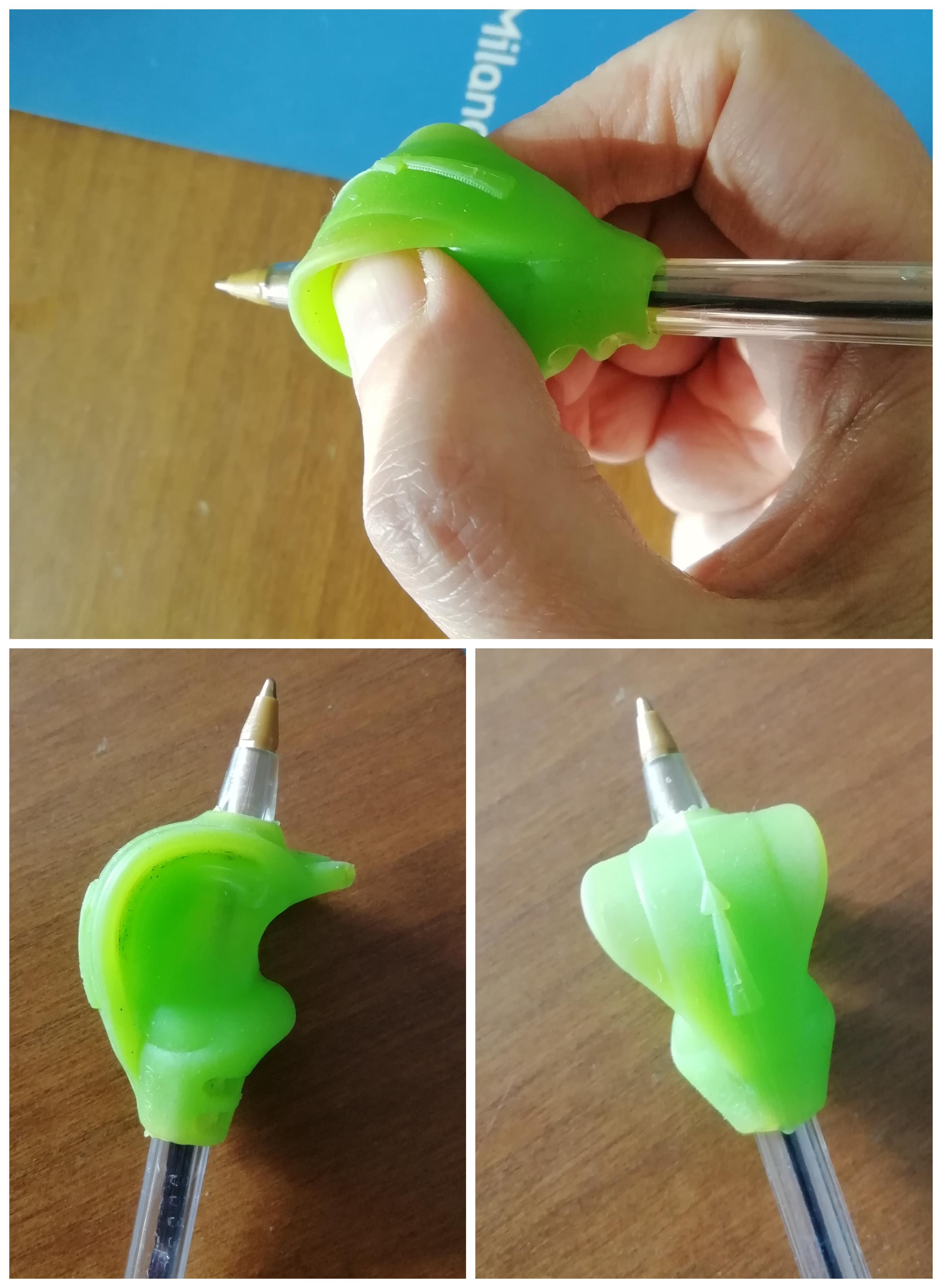 Esistono invece dei simpatici correttori di impugnatura da inserire sopra le penne. Quelli triangolari servono a poco, con mio figlio ne ho provati molti.