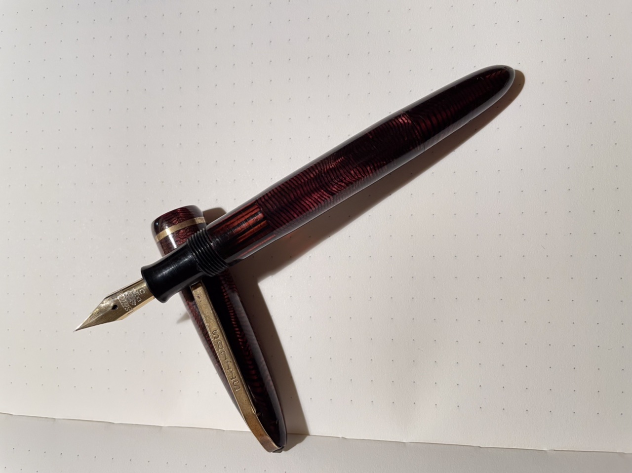 La tua splendida Deco Band, che monta un "precedente" pennino Signature, che ha la clip (ovviamente ancora corta) marchiata come nei modelli precedenti (solo "Wahl Pen"), dovrebbe quindi essere una delle prime immesse sul mercato, che sicuramente utilizzavano ancora componenti precedenti di pregio (pennini, clip laminate oro) da "smaltire" (ovviamente in senso positivo ). E nella pubblicità di Simone, verso la fine, già si parla dei Gold Seal nibs , che però non si vedono nei disegni...