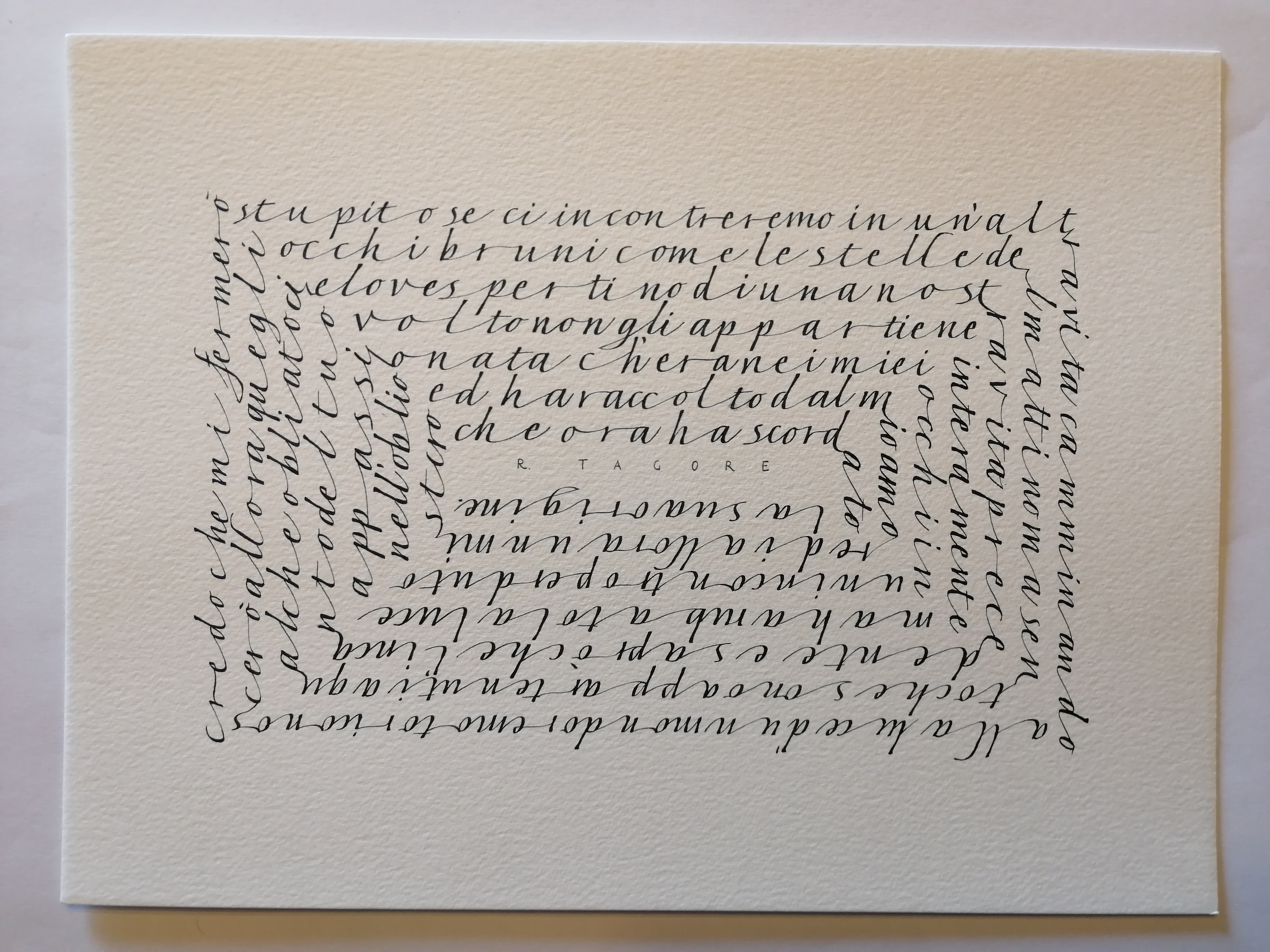 Ho ripreso una tavola che avevo scritto con stilografica e l'ho riscritta con pennino Leonard round 3,5 con la variazione di italico studiata nel corso (solo variazione perché con lettere così piccole anche la variazione è di angolo non é fattibile). Molto divertente.
