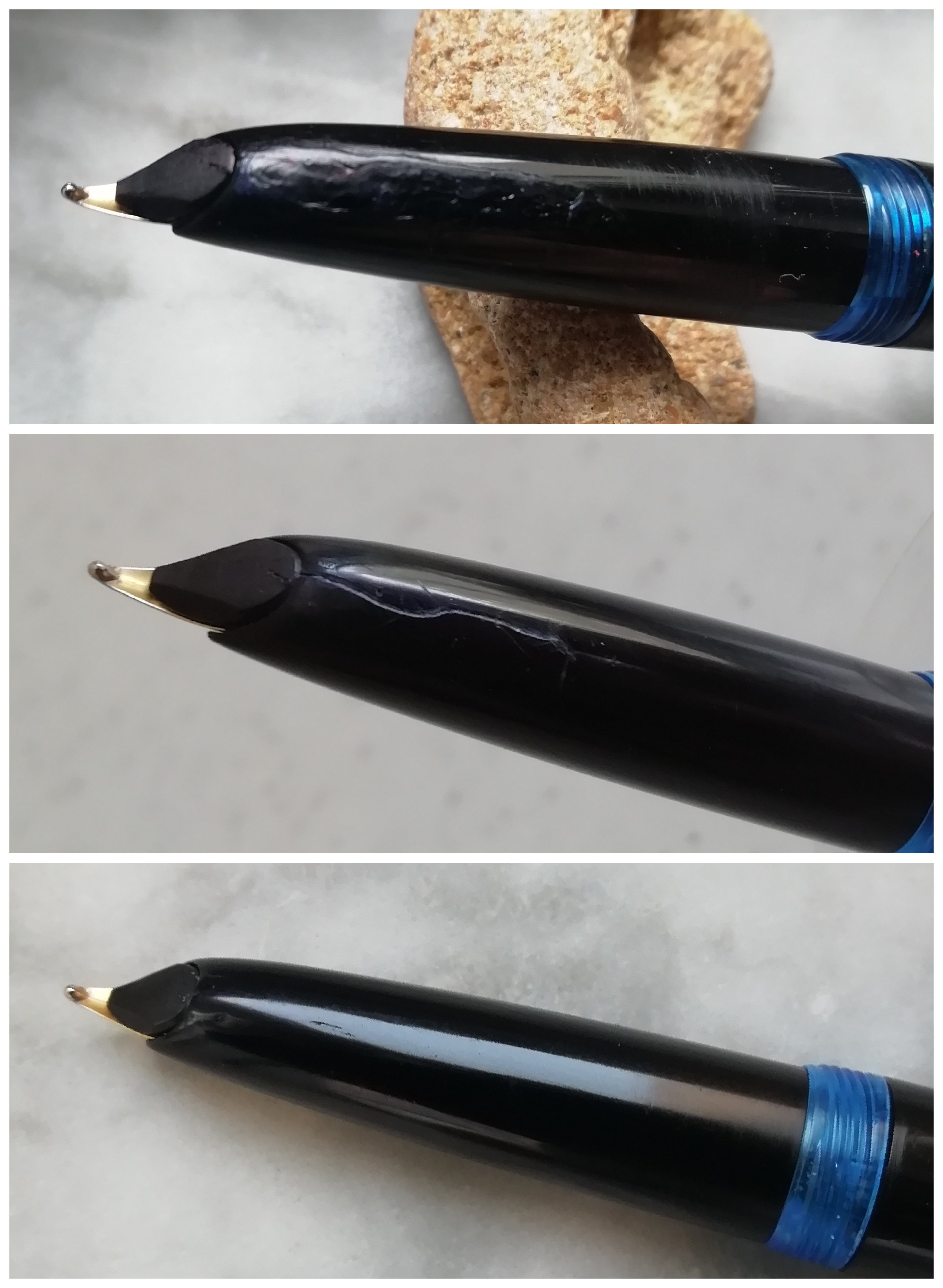 La Montblanc 31 (quella con pennino simpaticamente sbagliato) con carenatura crepata.