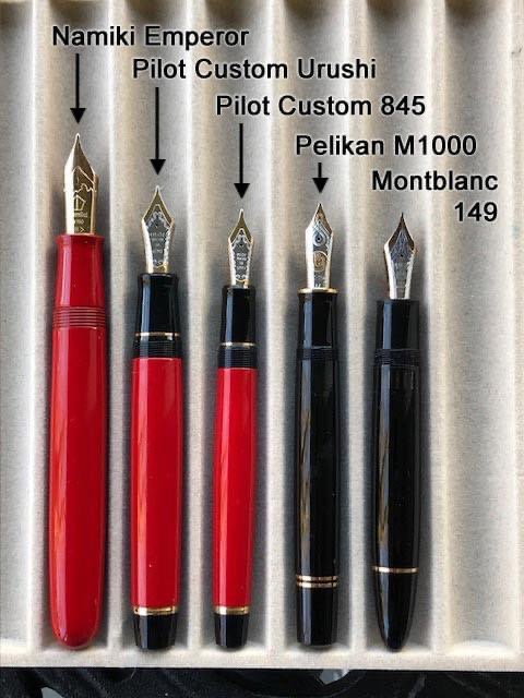 Quella grande monta un pennino taglia 30 (doppio della 845-823-743 che montano il 15) ed è paragonabile per diametro alla 149. Per dimensioni totali è seconda solo alla Namiki Emperor (beh quella è esageratamente grande!) Il video di Marco sulla 823 mi pare fosse proprio quello in cui diceva che, per le sue mani medio-piccole, la dimensione massima accettabile di penne Pilot è quella della linea 742/912.