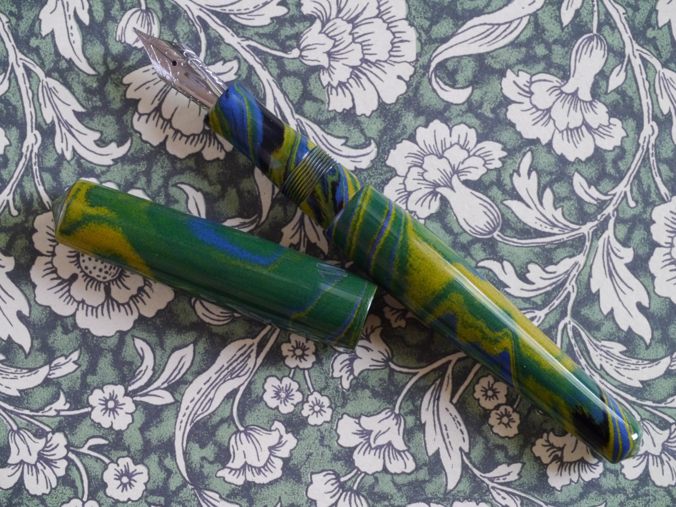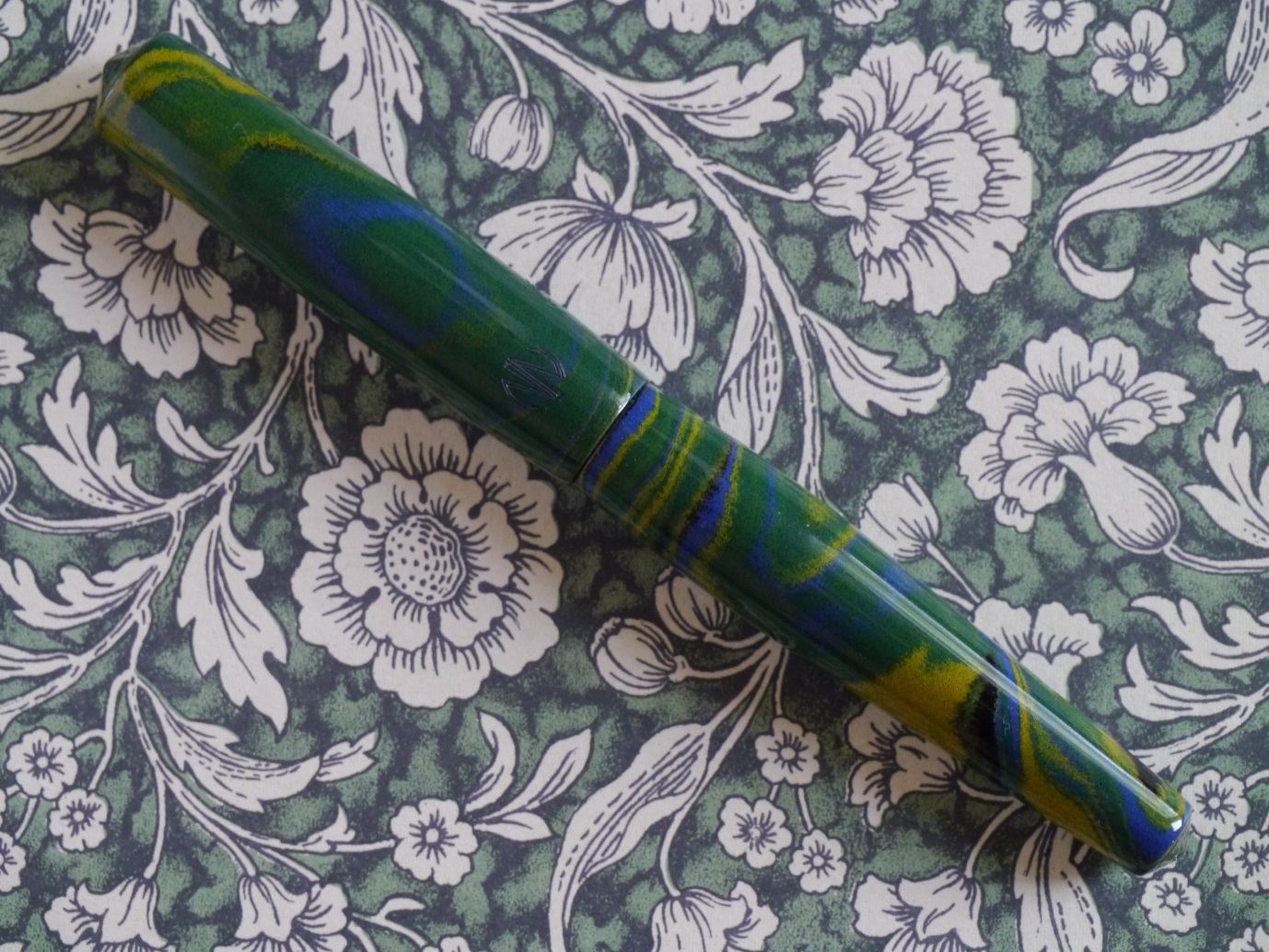 Mi piace la variegatura del colore, ma non il colore in sé, io preferisco le tonalità sul blu o un verde più scuro. Non mi piace lo scalino come altri hanno sottolineato, ed io impugno la penna molto in basso, quindi lo sentirei; non mi piace la linea così liscia e arrotondata, completamente rotonda, preferisco le penne con finali tronchi. Mi piacerebbe che ci fosse una clip. Il pennino è ok, visto che scrive sempre e comunque. Mi piacerebbe essere capace a fare le penne come le sai fare tu, quindi complimenti comunque!