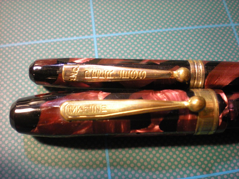 Salve a tutti, ecco la mia coppia, non riesco a trovare nessuna informazione su di loro, se qualcuno le riconosce ringrazio in anticipo. Sulla clip della stilo è scritto " MARINE" mentre su quella del portamine è scritto "PEERLESS" e poi "A.N.C.". Ho fatto cambiare il pennino e il sacchetto di gomma che erano ridotti male. Il vecchio pennino, penso non originale, riporta la scritta " STILOR EXTRA 22/4" ed è in acciaio dorato.Per il nuovo pennino ho scelto un tipo flessibile sempre in acciaio dorato e punta fine.